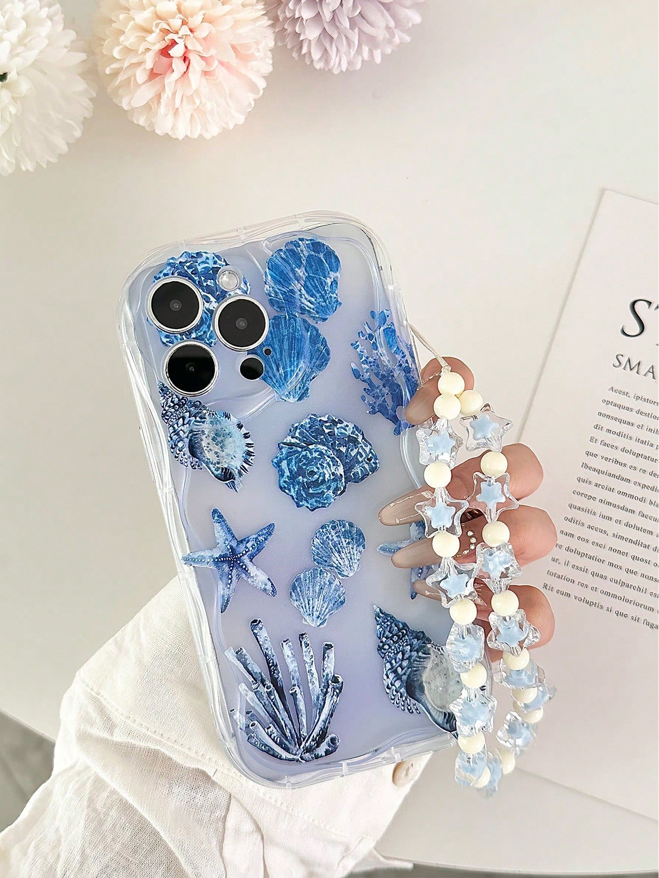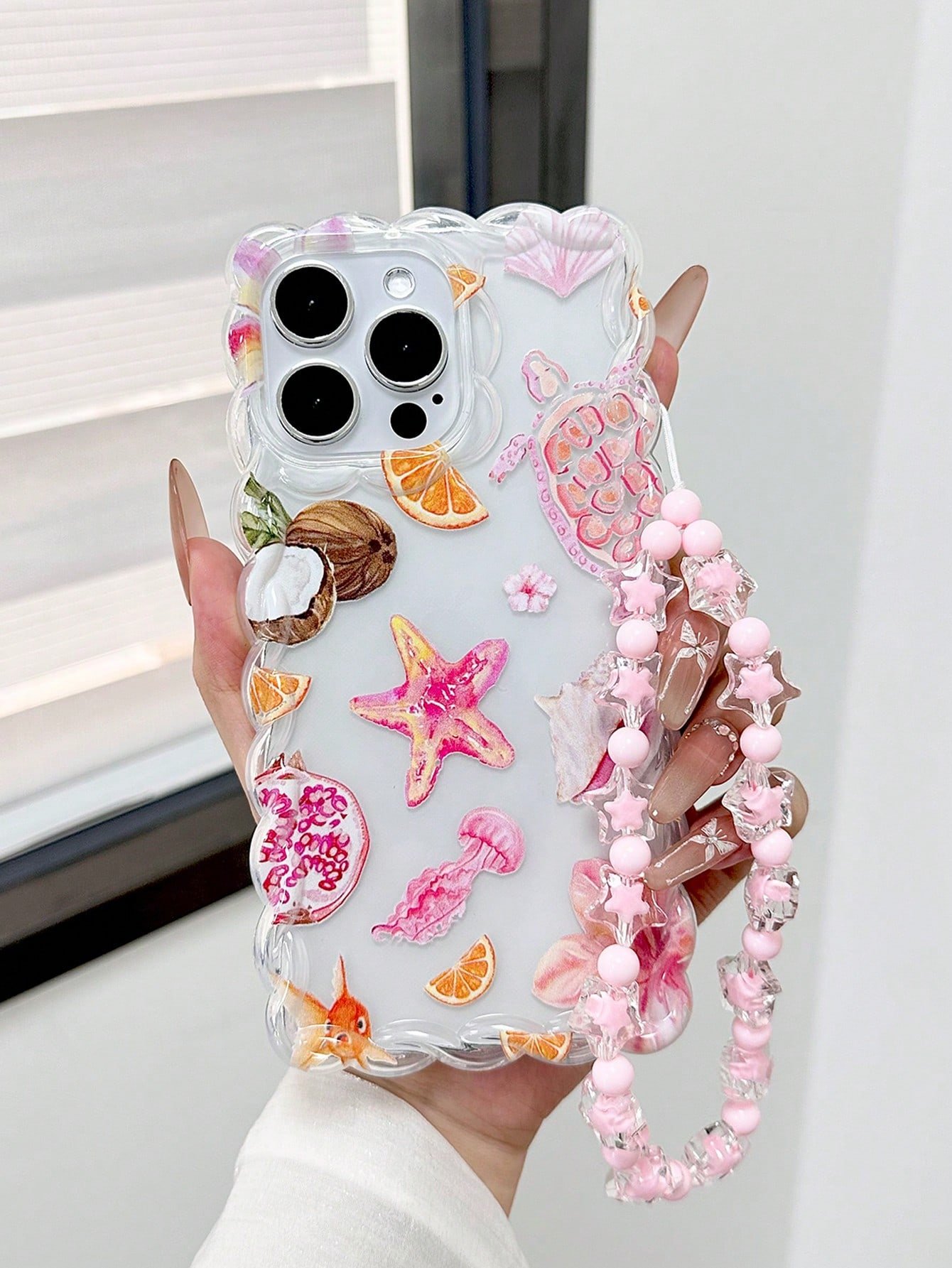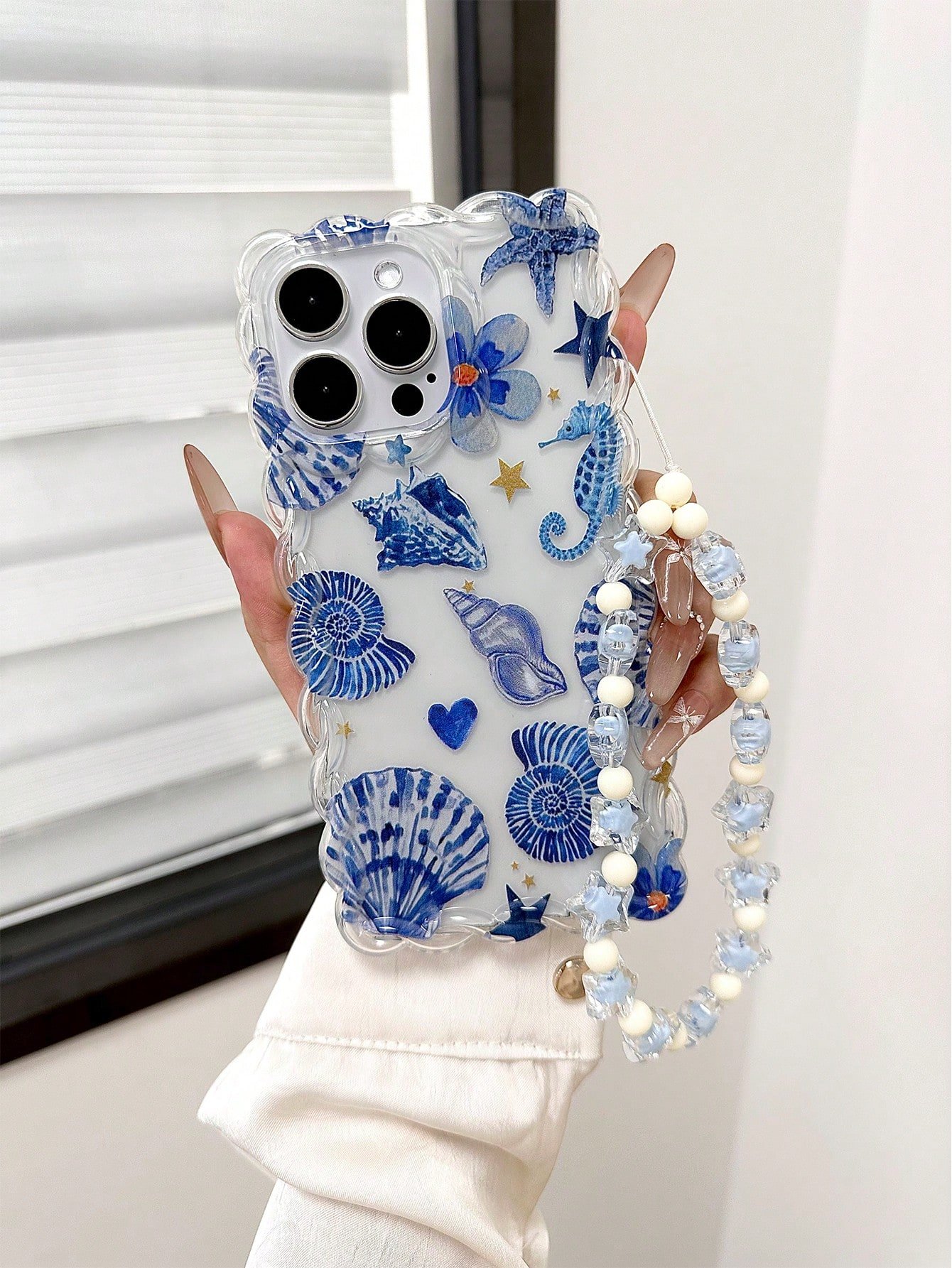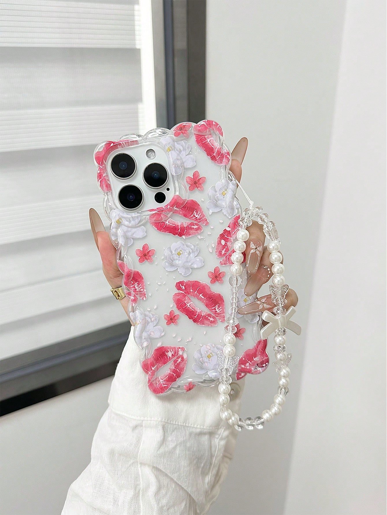 Cream Patterned Wavy Edged Glossy Floral Painted Anti-Drop Phone Case With Handmade Beaded Flower Bracelet Accessories, Compatible With IPhone 16/11/16pro/16plus/16promax/16e/15Promax/13/14/12/XS/XR/7G/8P, Galaxy 11/12Pro/12/12X/13Pro/14Pro/15Pro/, Redmi