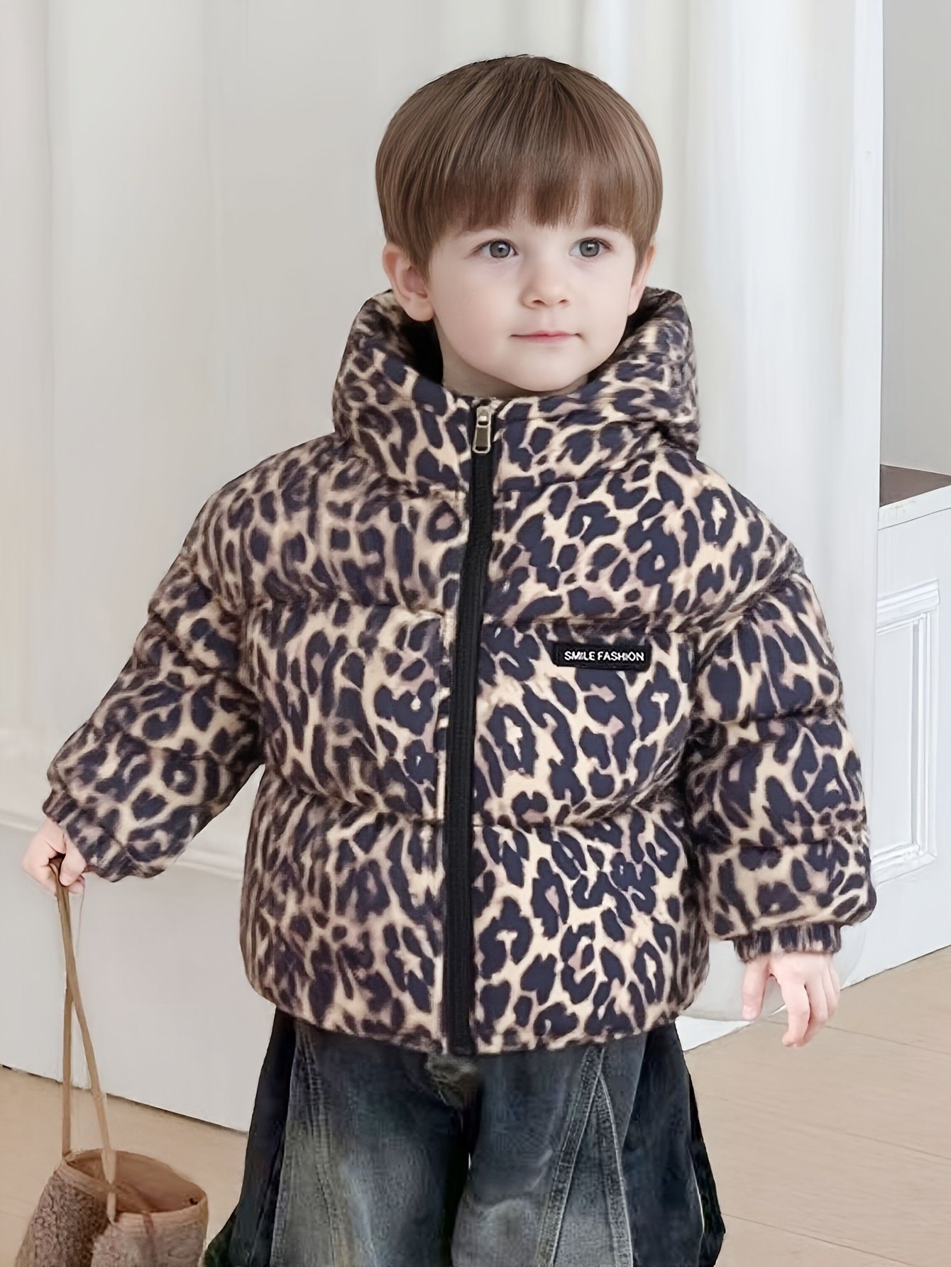 Cute Leopard Print Kids' Hooded Jacket | Non-Stretch, Filled, Winter Warmth, Zipper Detail, Loose Fit for Baby Boys and Girls, Thick