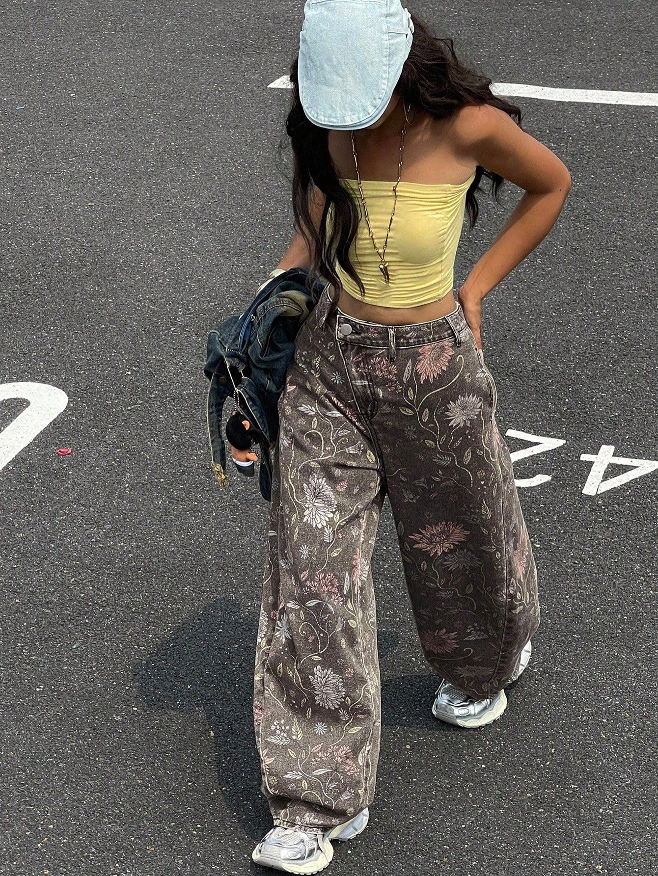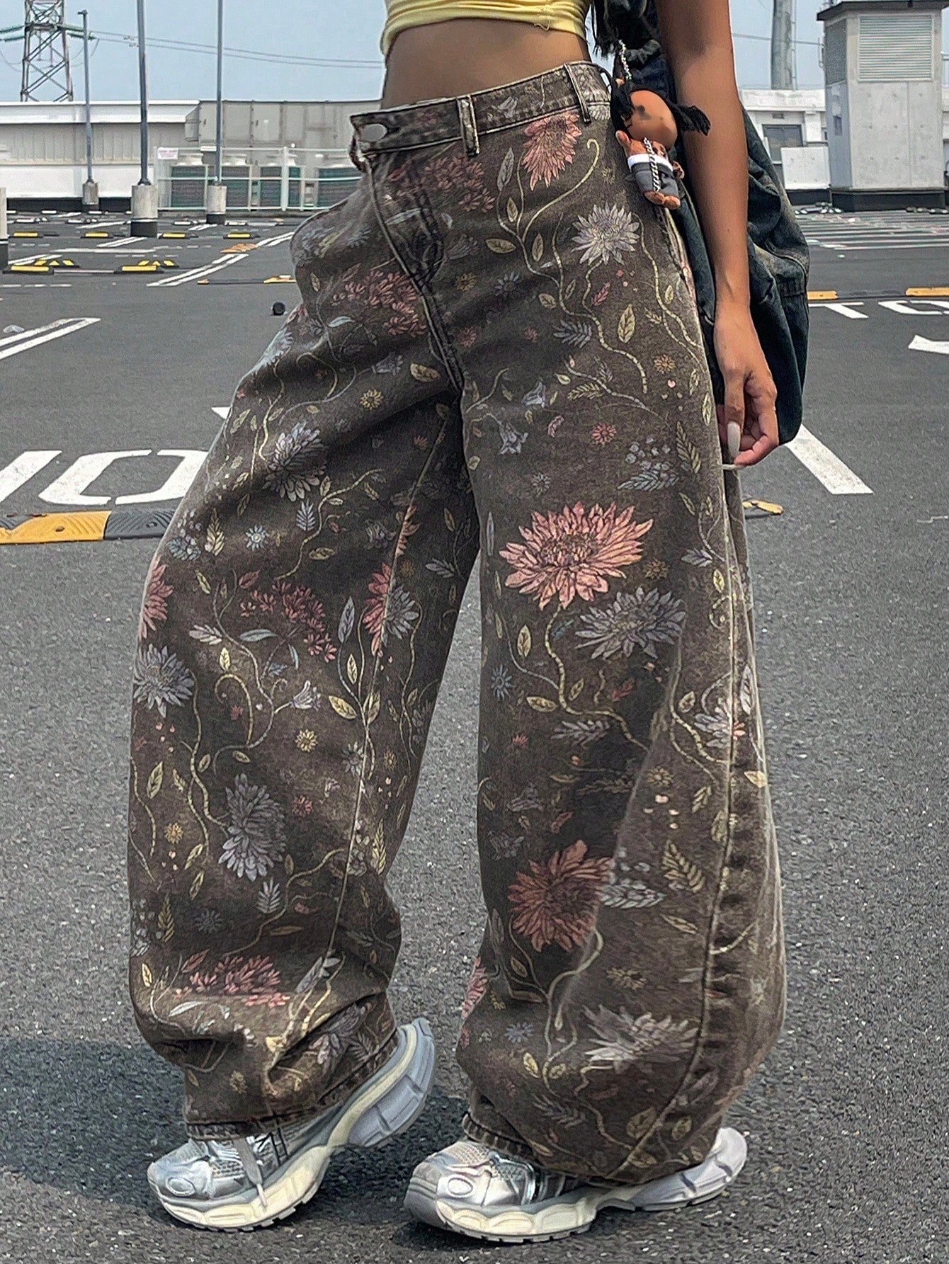 DAZY Women's Floral All-Over Print Harem Pants, Casual Street Style Loose Jeans Y2k