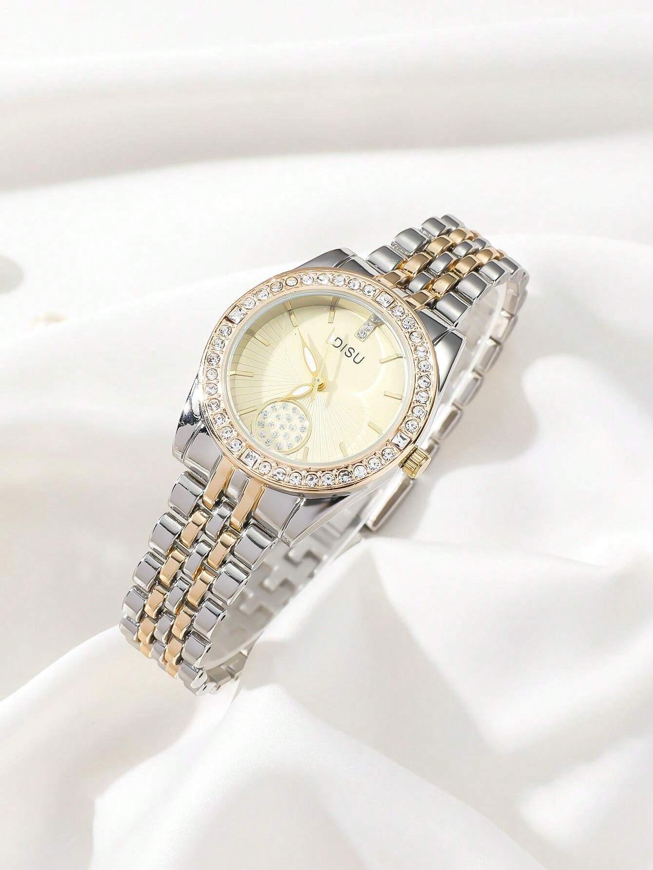 DISU 1pc Women Classic Gold-Color Stainless Steel Band Quartz Watch With Rhinestones, Suitable For Daily Use