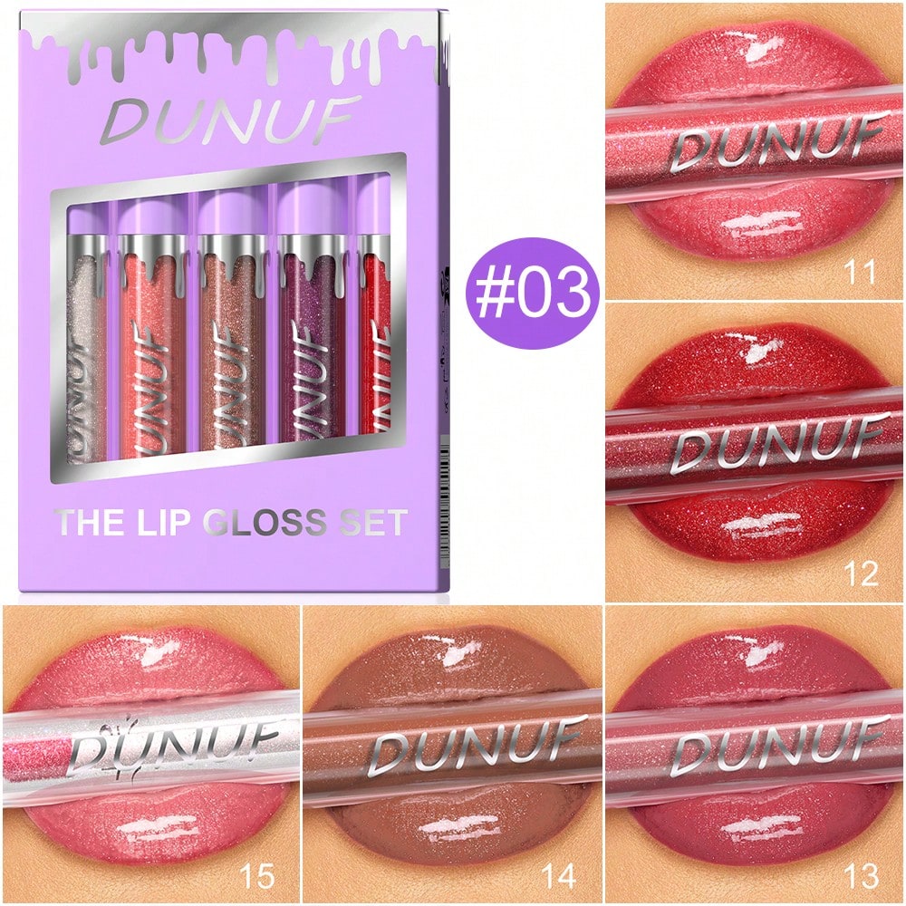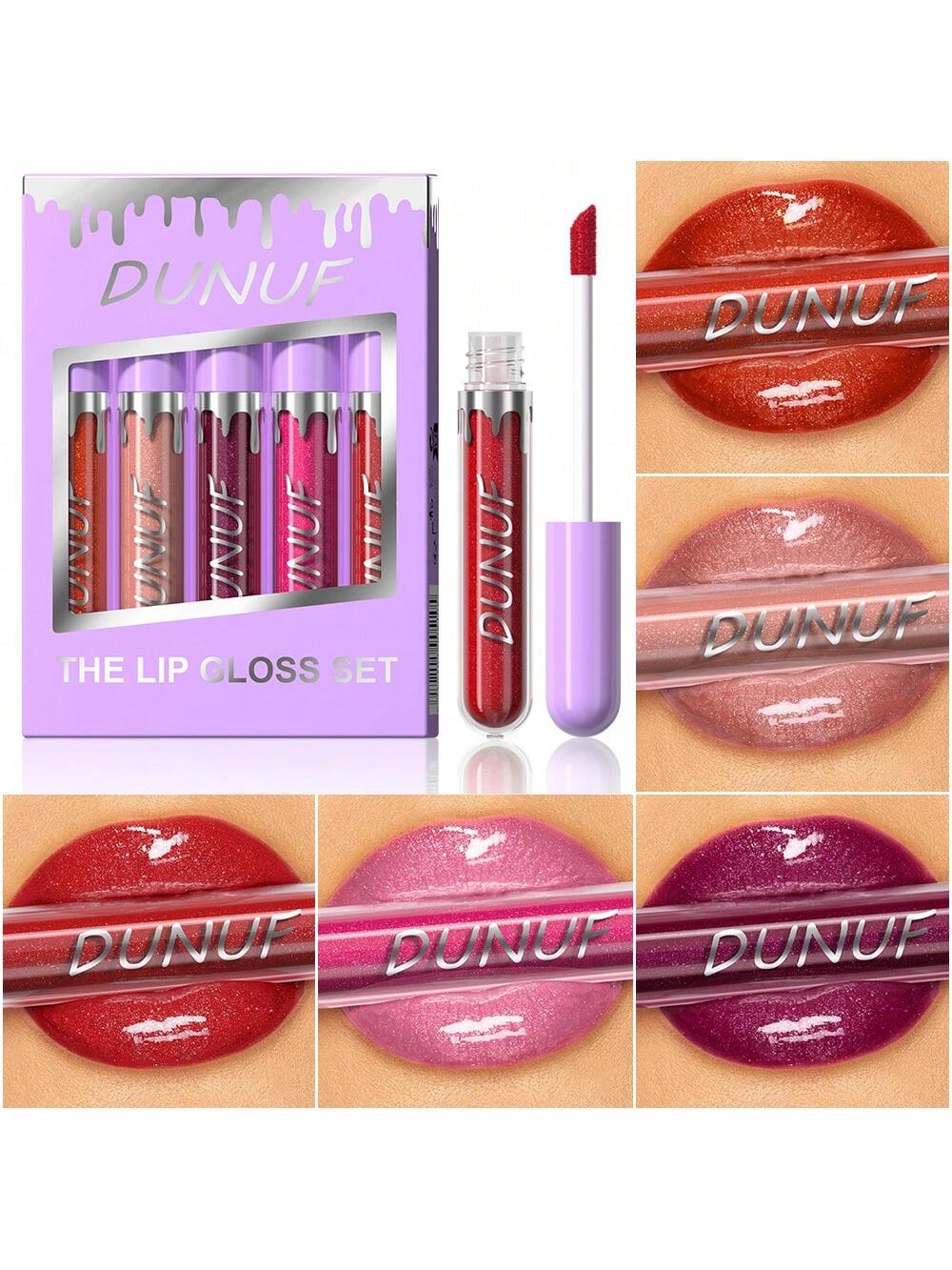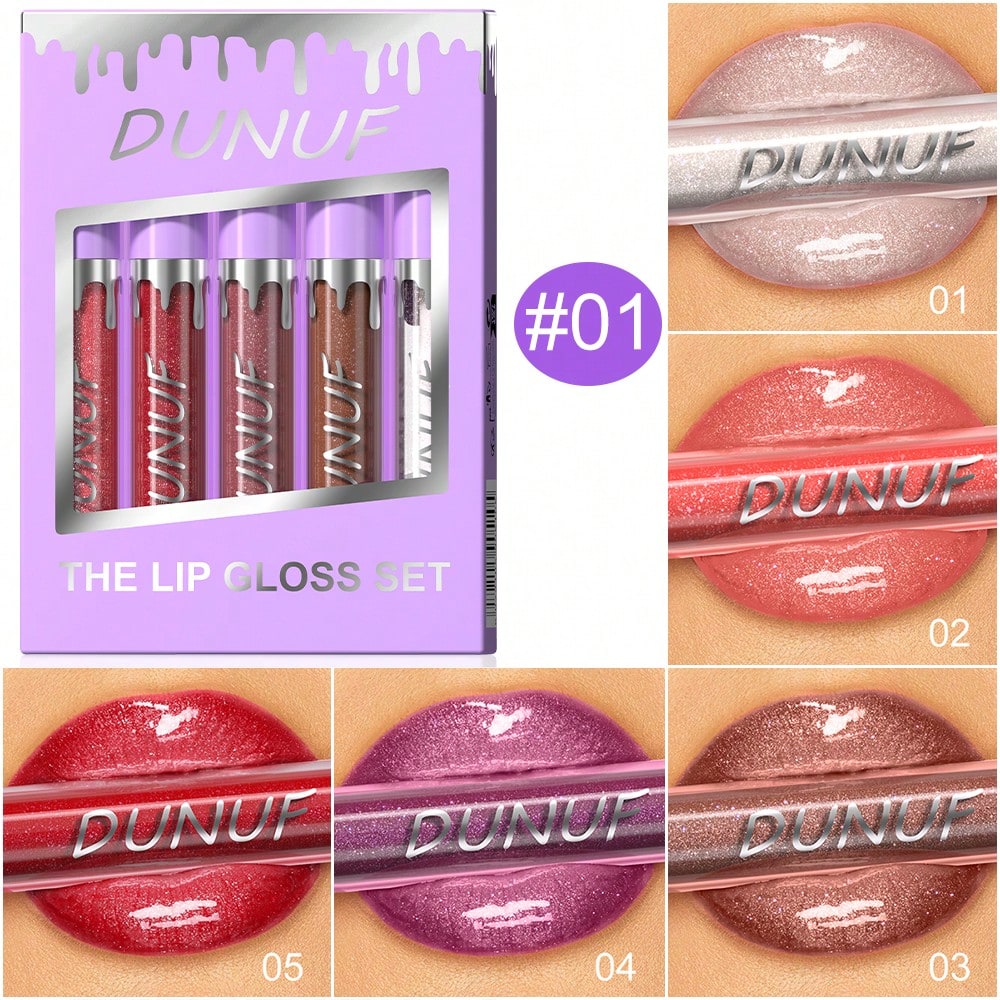 DUNUF 5 Pcs Long-Lasting Lip Gloss Set Waterproof Lipstick Non-Fading Non-Stick Cup Beginner Friendly Perfect Christmas Gift Beautifully Wrapped