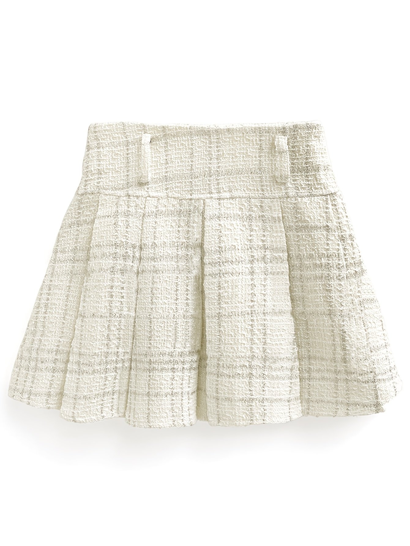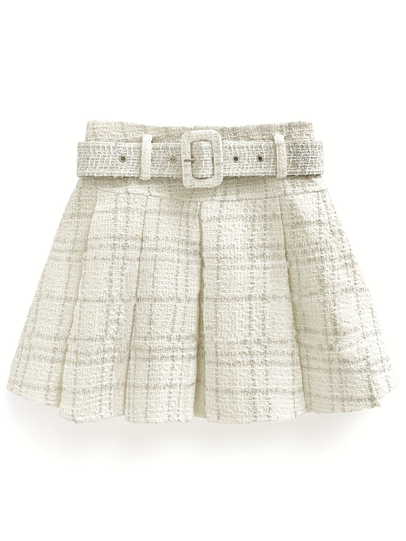 [Durable Build] Women's High-Waist Plaid Tweed Skirt with Belt – Casual Pleated Mini, A-Line Silhouette, Machine Washable, Ideal for Spring/Summer/Fall