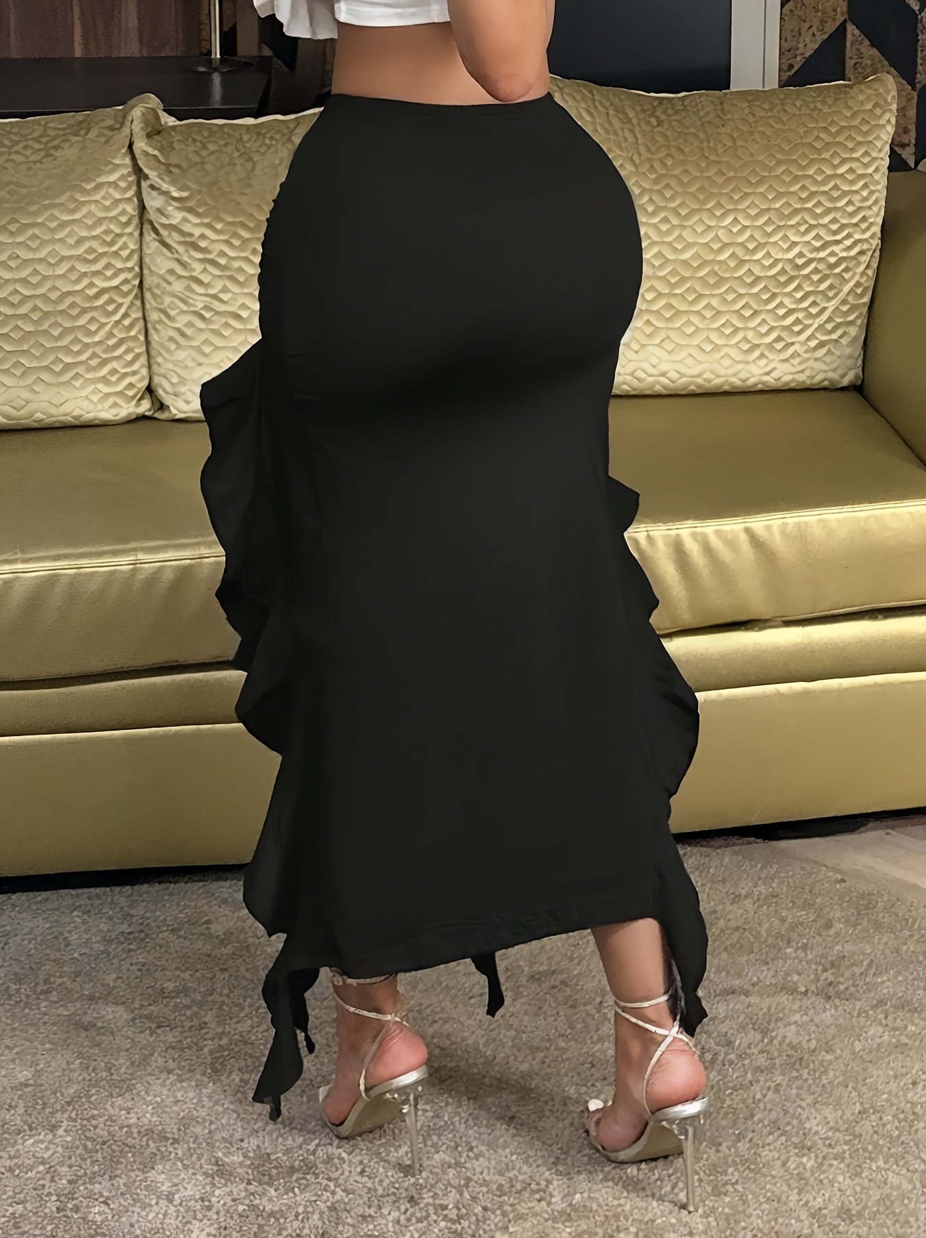 Elegant Black High-Waisted Maxi Skirt for Women – Ruffled Hem, Flowing Design, Solid Color, Perfect for All Seasons, Versatile Fashion | Ruffled Hem Skirt | Glossy Texture