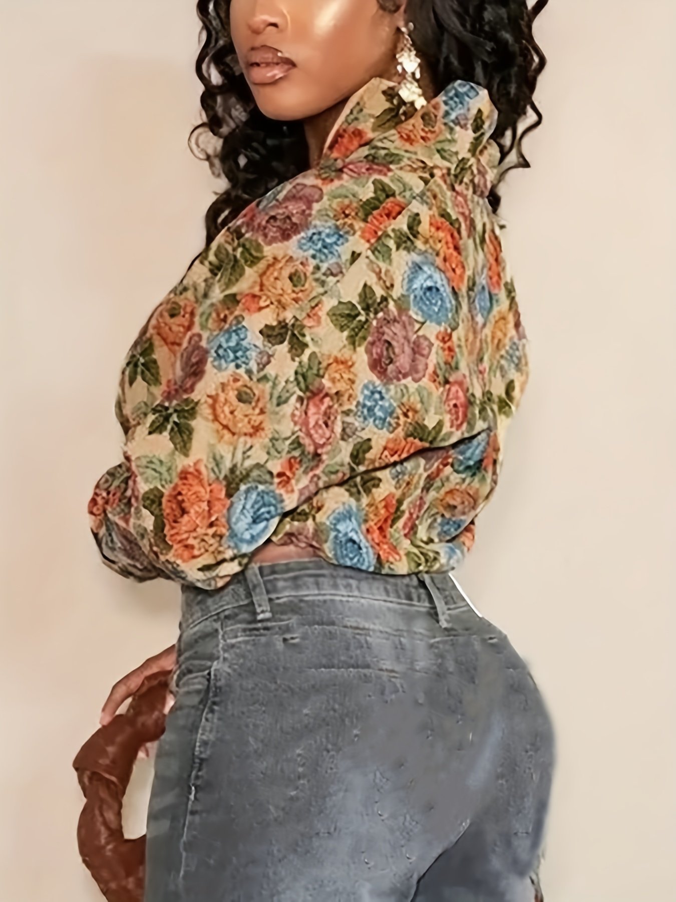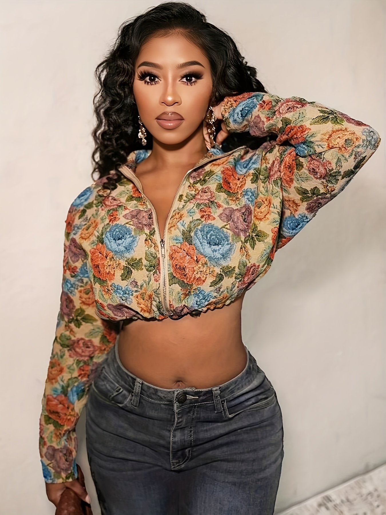 Elegant Style Fashion Women's Casual Street Floral Print Zipper Trim Jacket