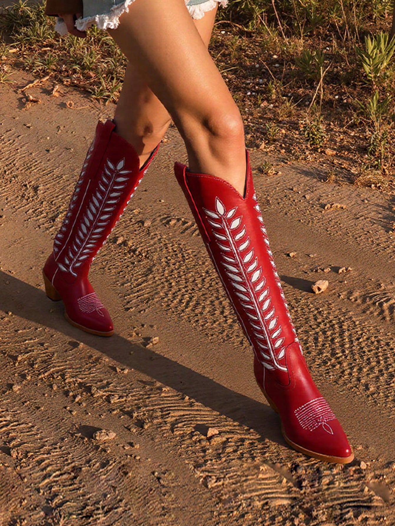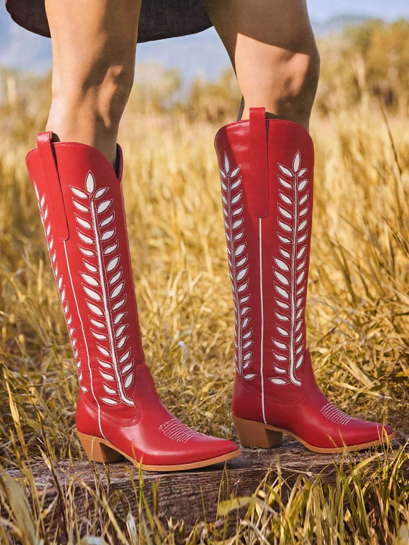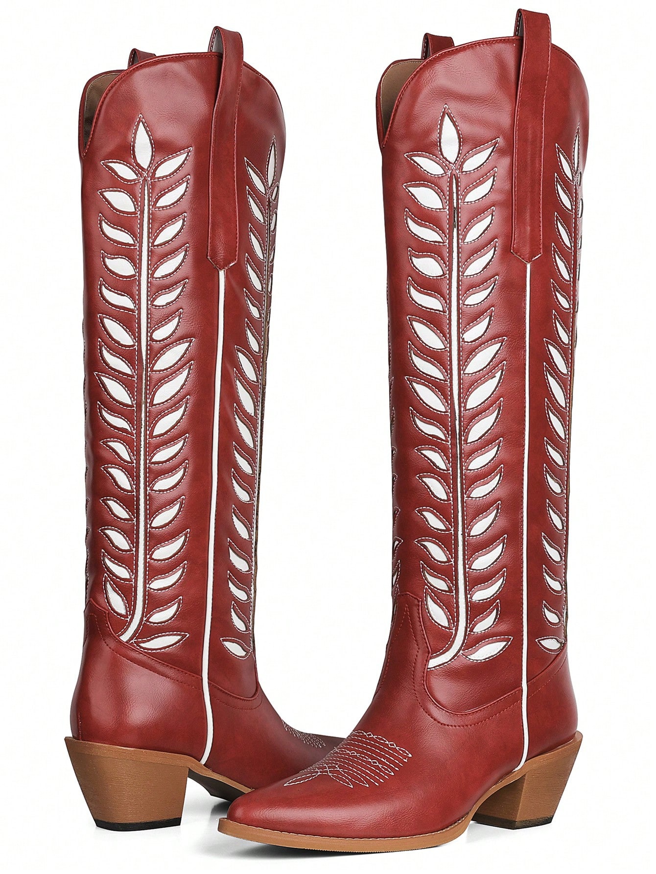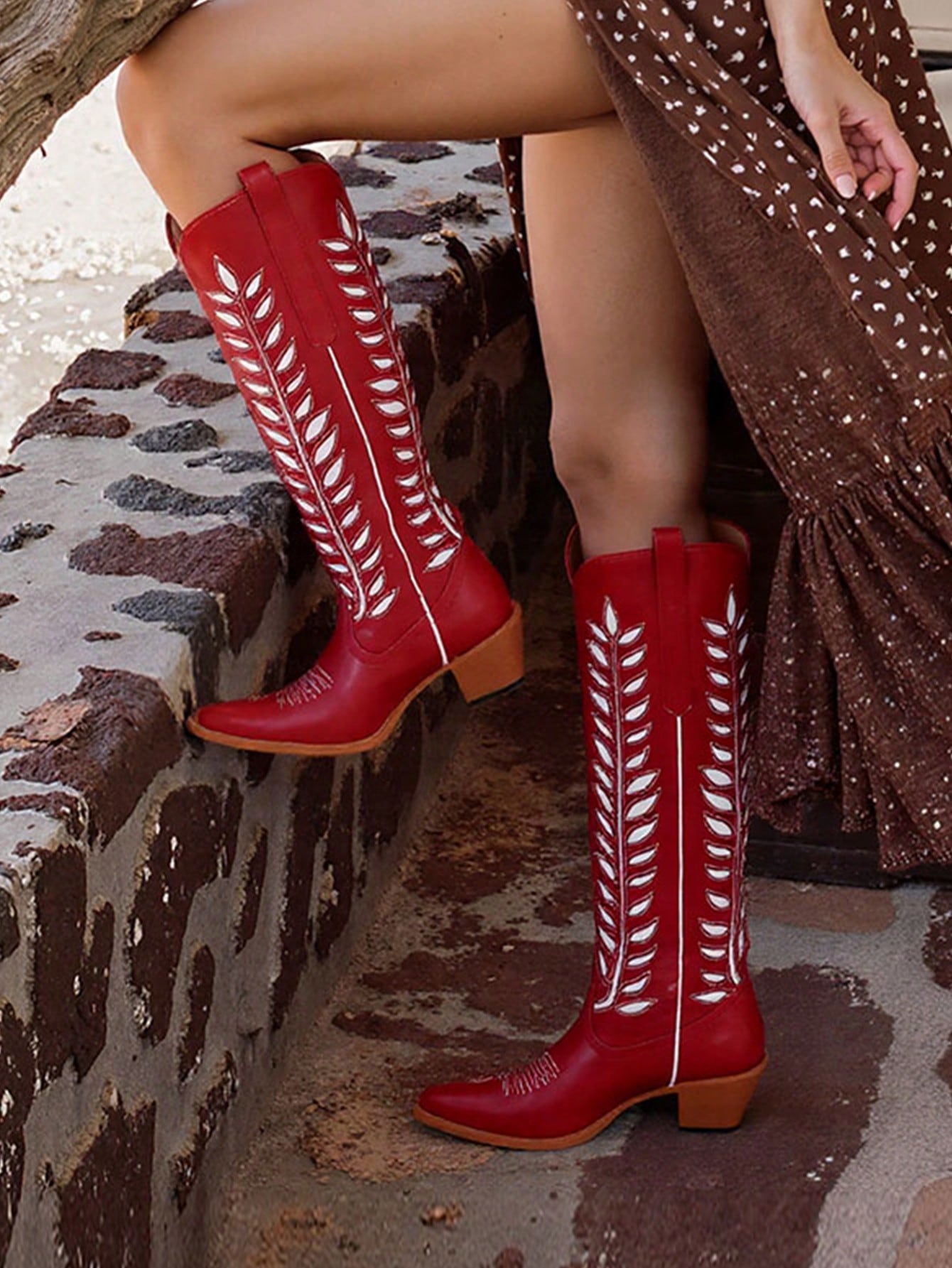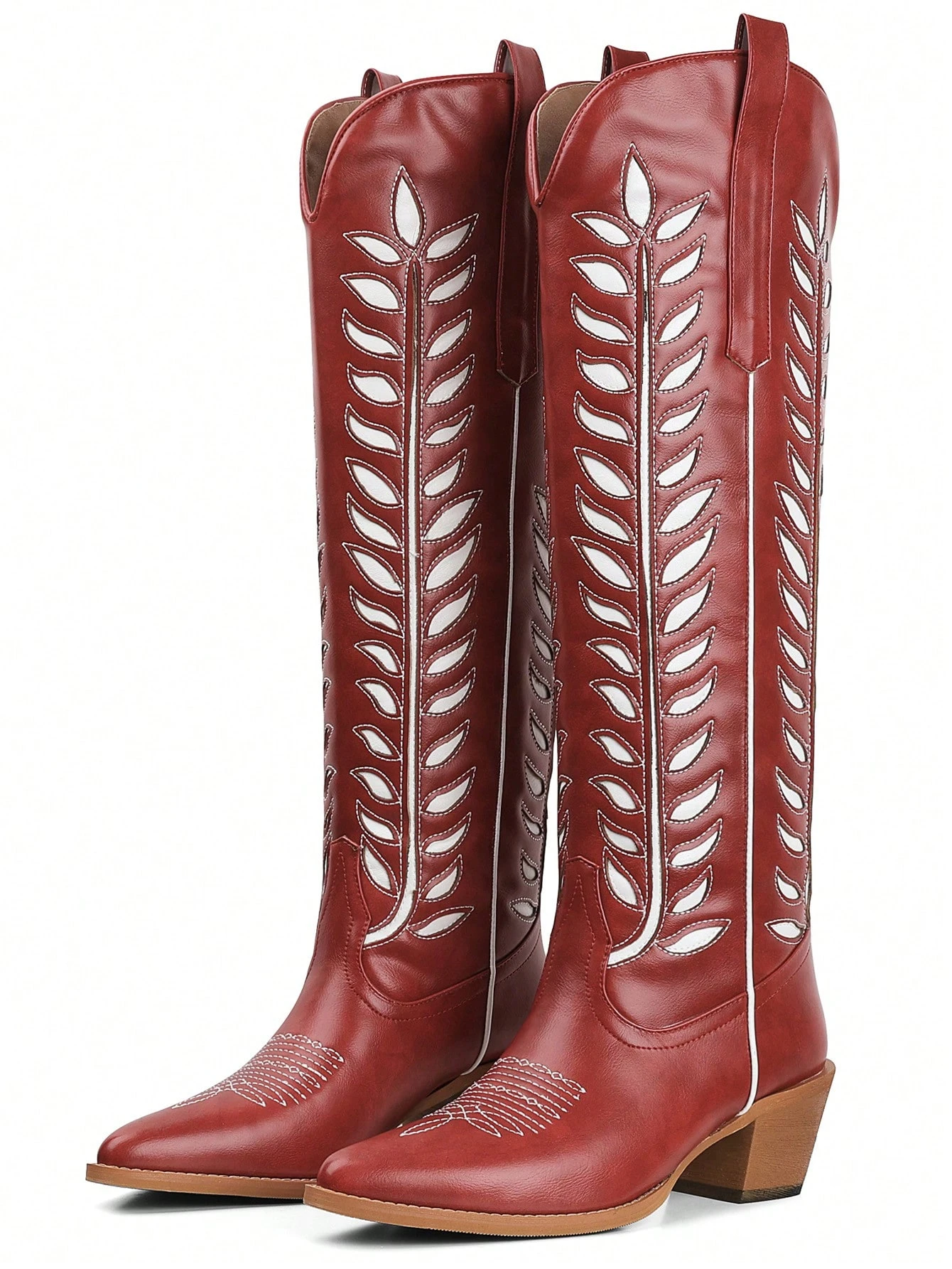 Embroidered Cowboy Boots For Women Almond Round Toe Chunky Heel Cowgirl Boots Pull On Knee High Western Boots With Contrast Foliage Inlay