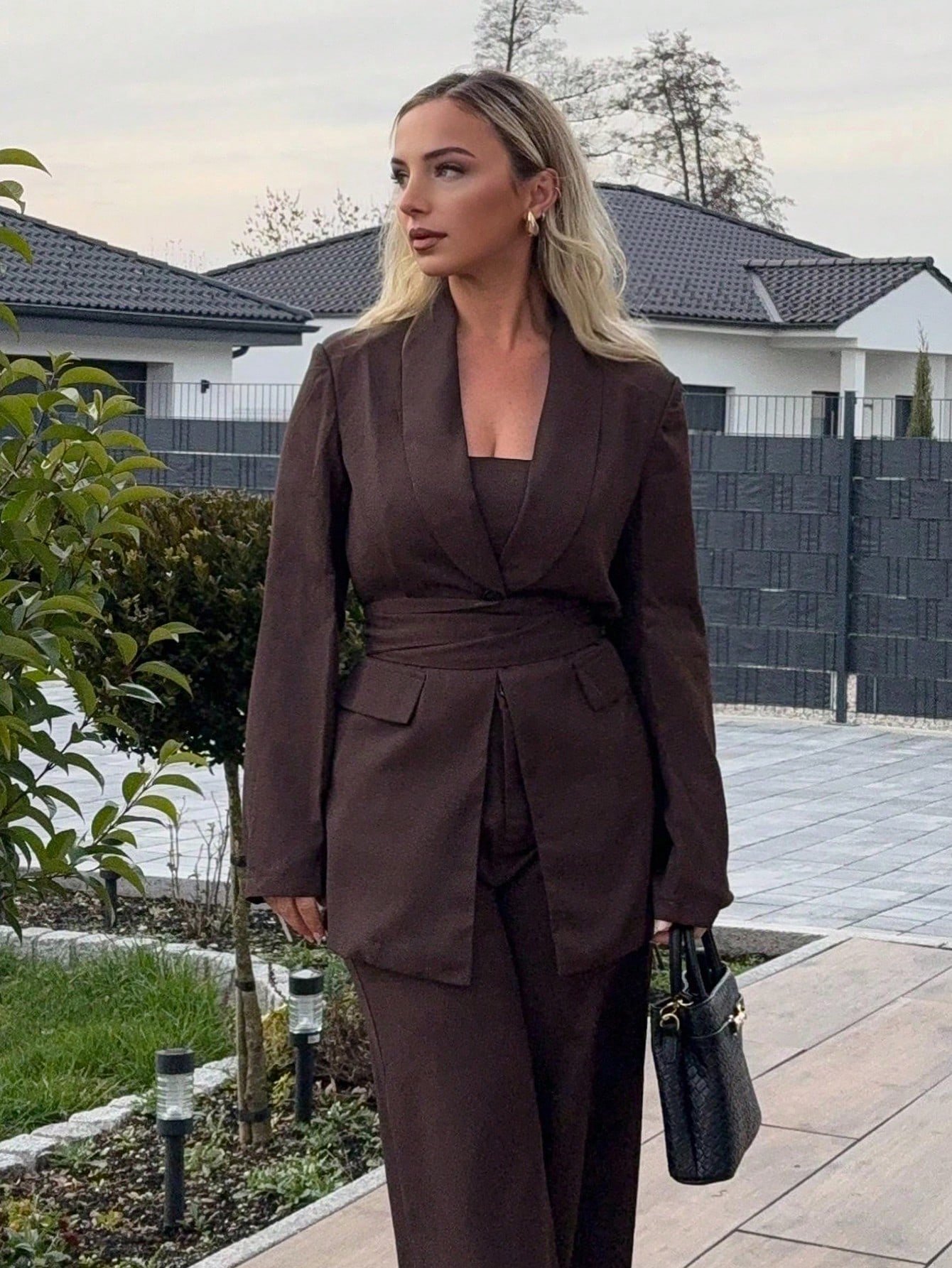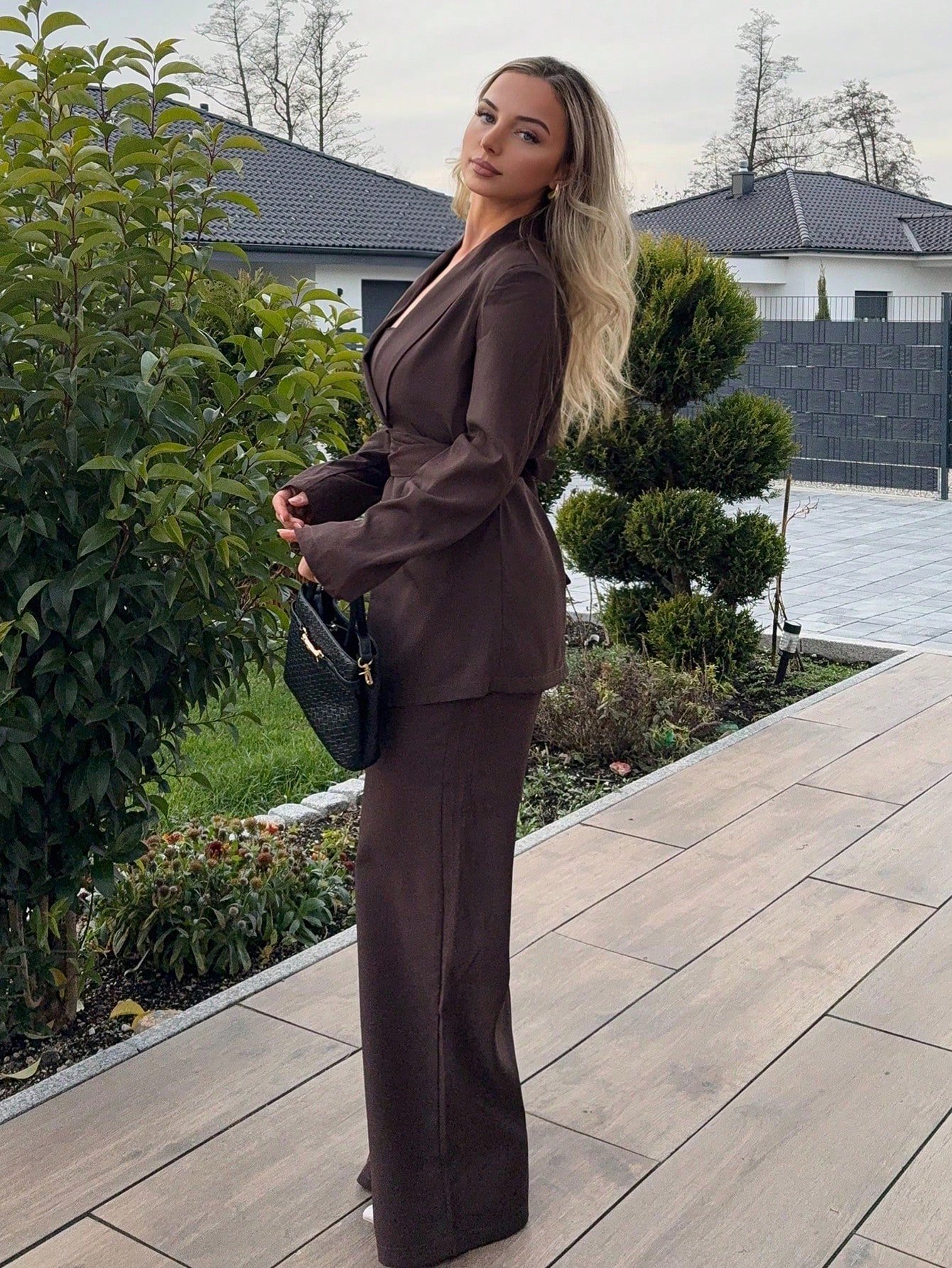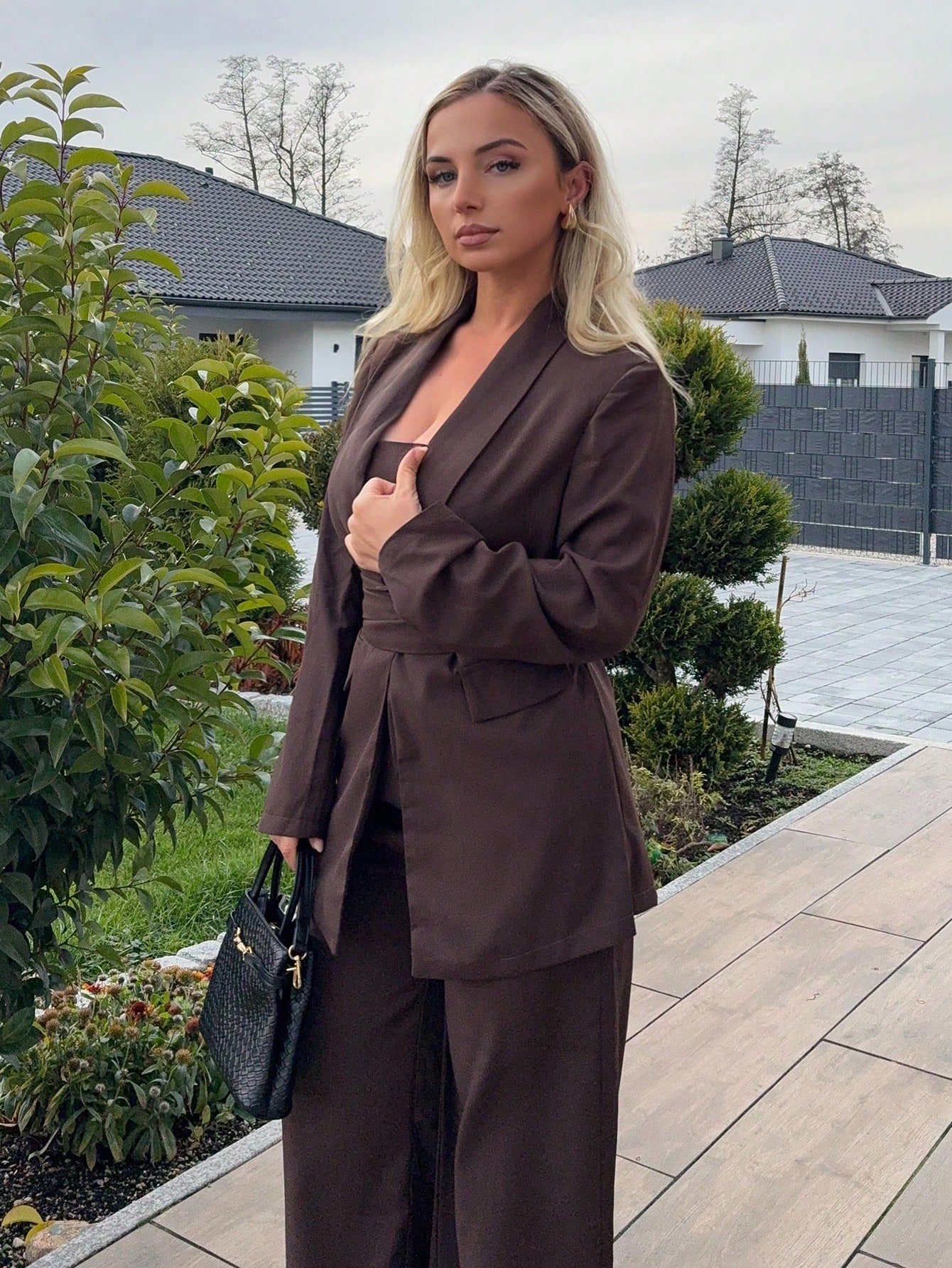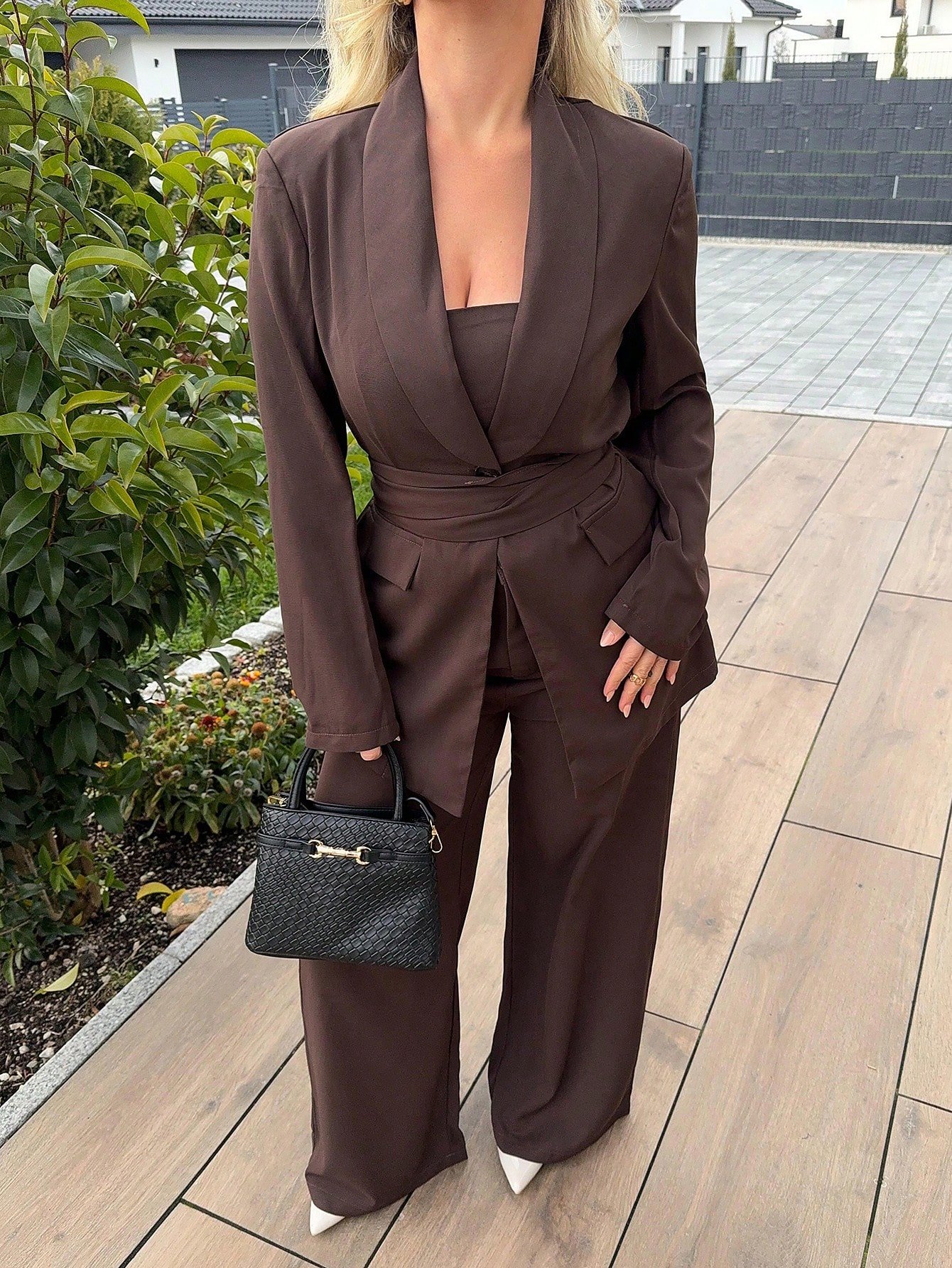 Jeta Ari 3pcs Women's Brown Shawl Neck Suit Set, Women's Casual Commuter Versatile Suit Set, Suitable For Office, Commute, Outing, Loose Casual Suit Set Fall Cloth For Women Women Office Suit Brown Suit Women 3 Pieces Suit Set Classy Women Suit Set