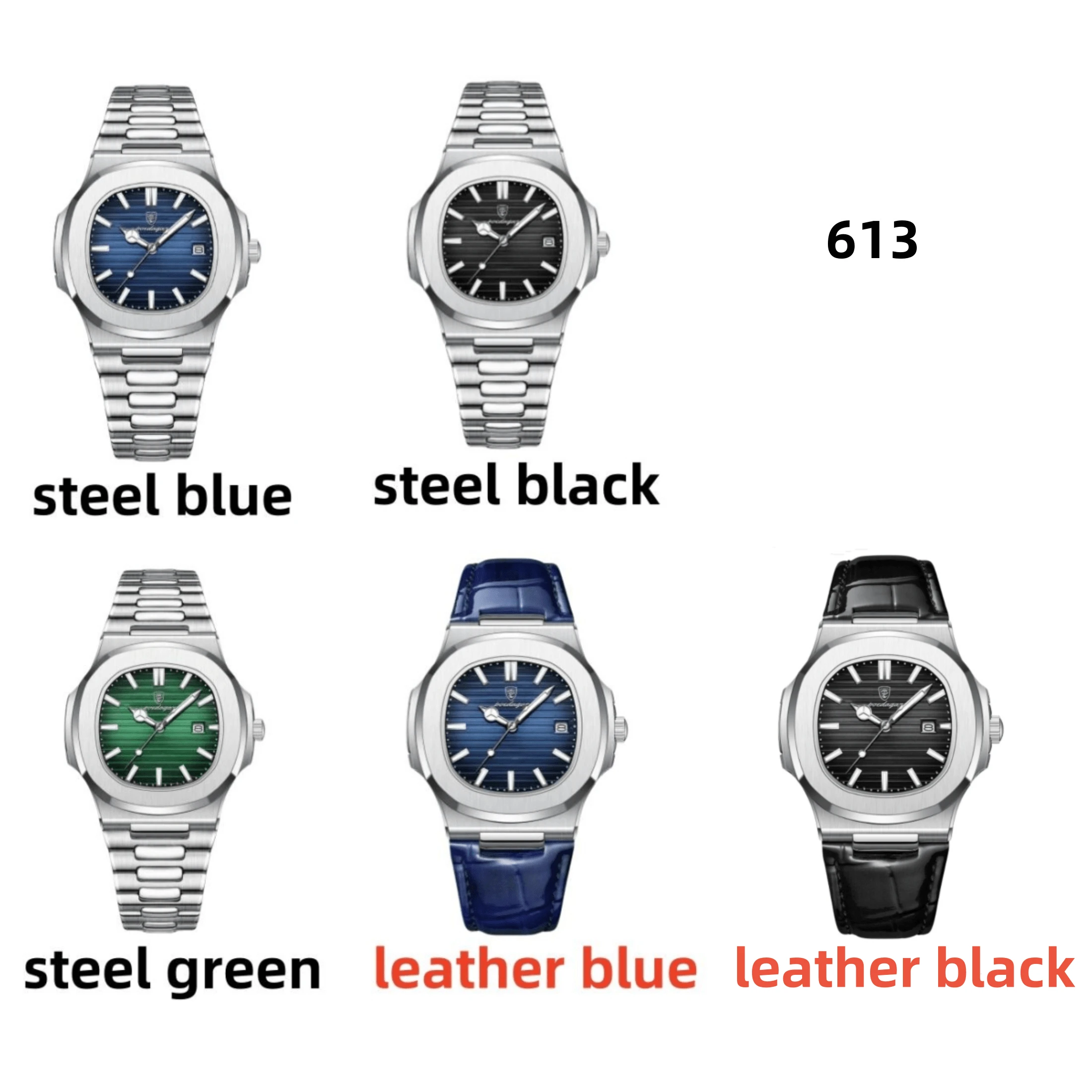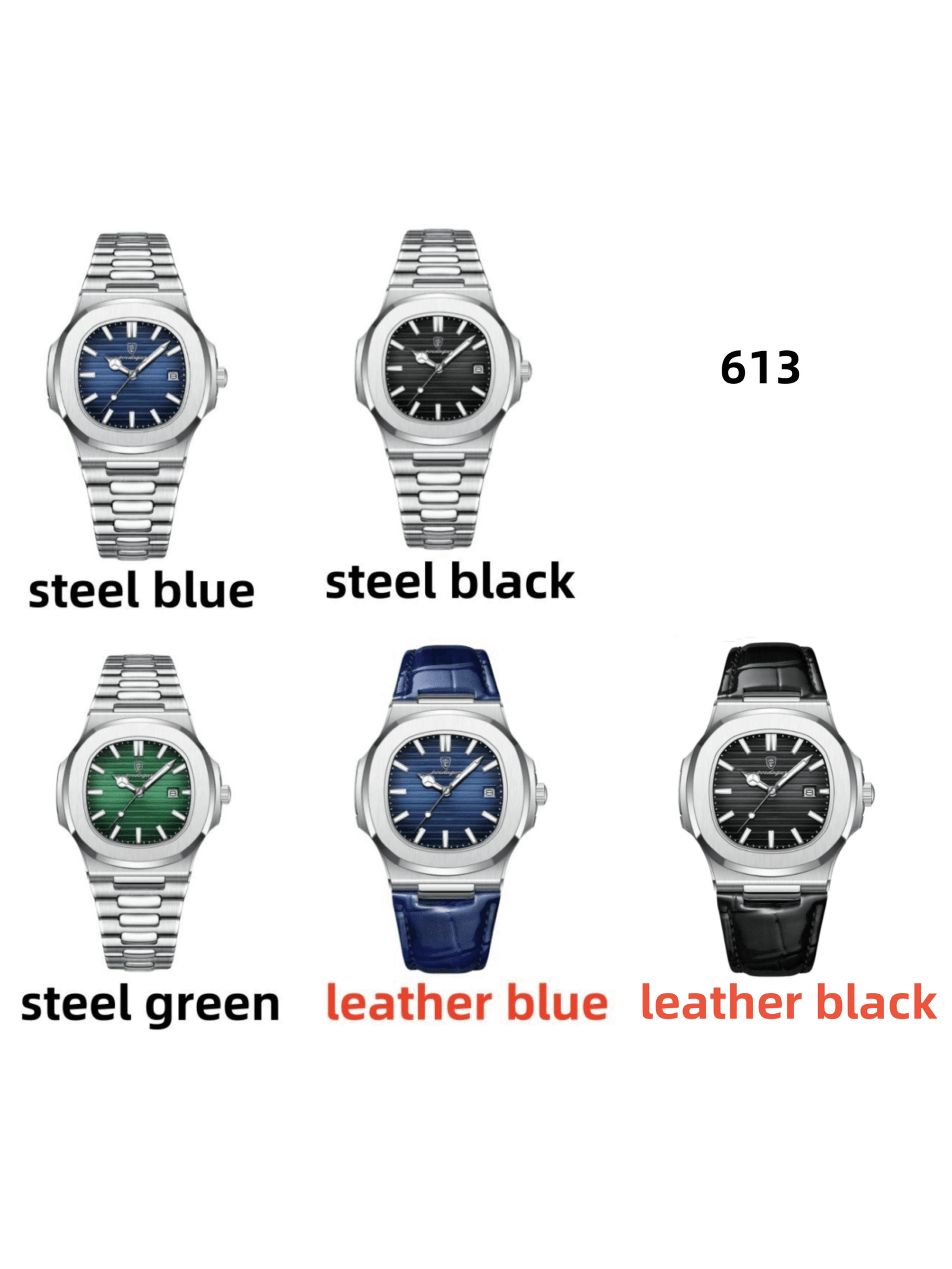 Steel Blue, Leather Blue, Steel Black, Steel Green, Leather Black |