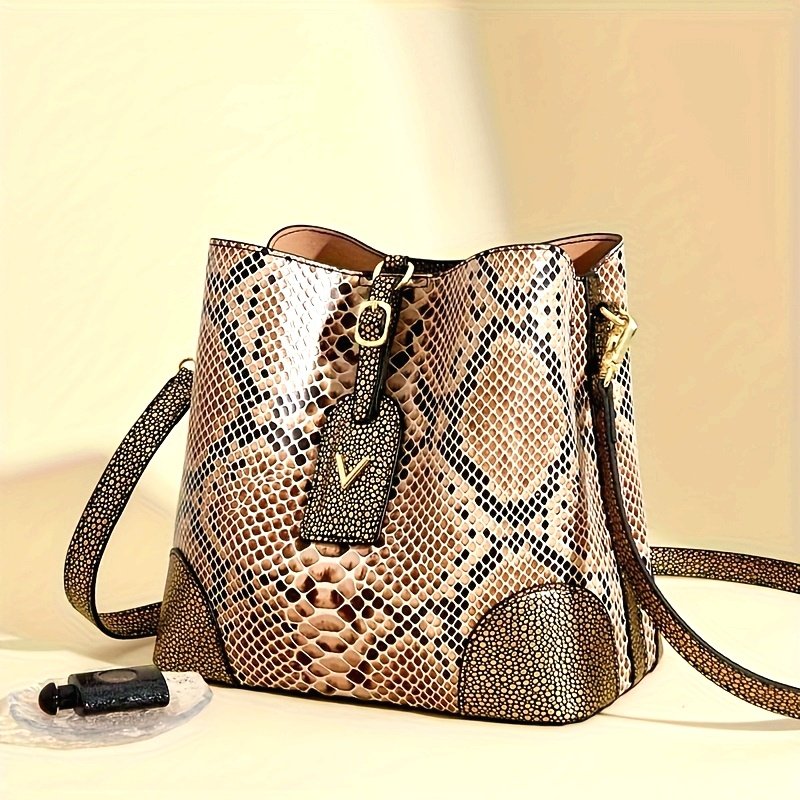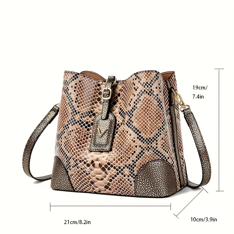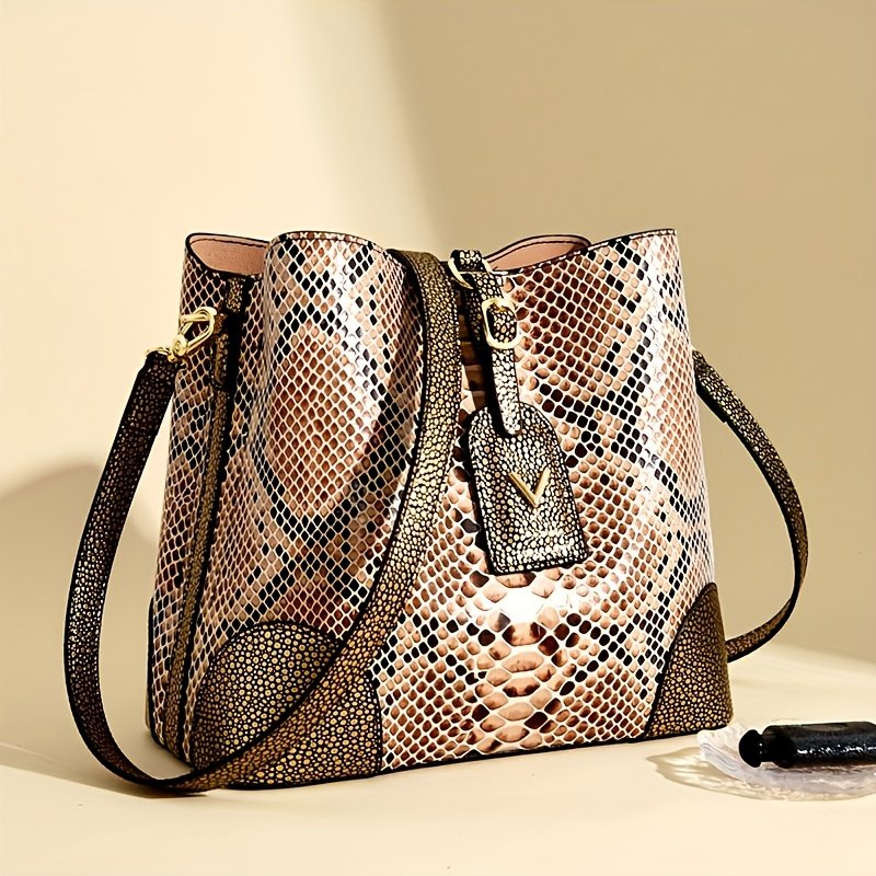 Luxury Brown And Beige Snake Skin Textured Women'S Shoulder Bag: Features an Exquisite Round Metal Buckle Decoration, Stylish Thin Strap Made of The Same Material, And a Zip Pocket with a Square Fastener for Added Practicality