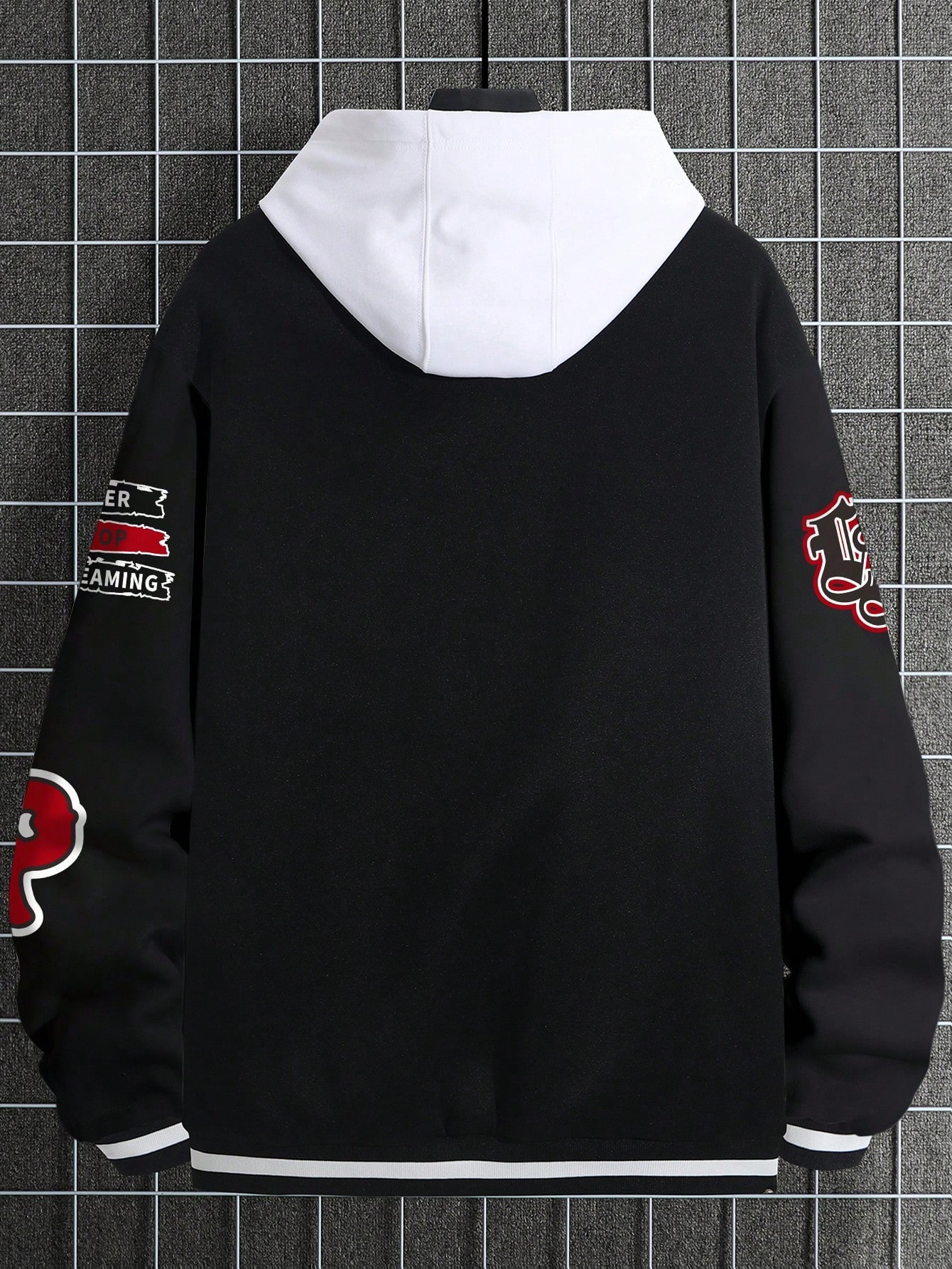 ROMWE MEN Prep Herenjas met kleurblokstiksel, voorkant, nummer, alfabetpatroon en zak, casual ravejack