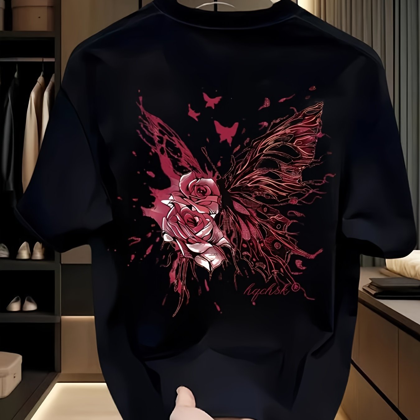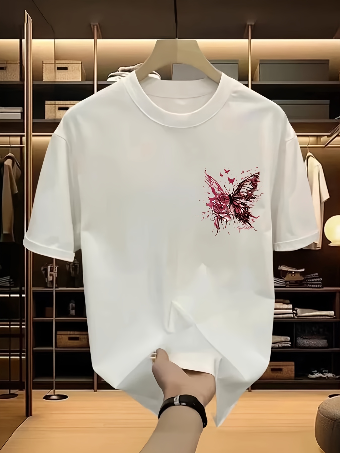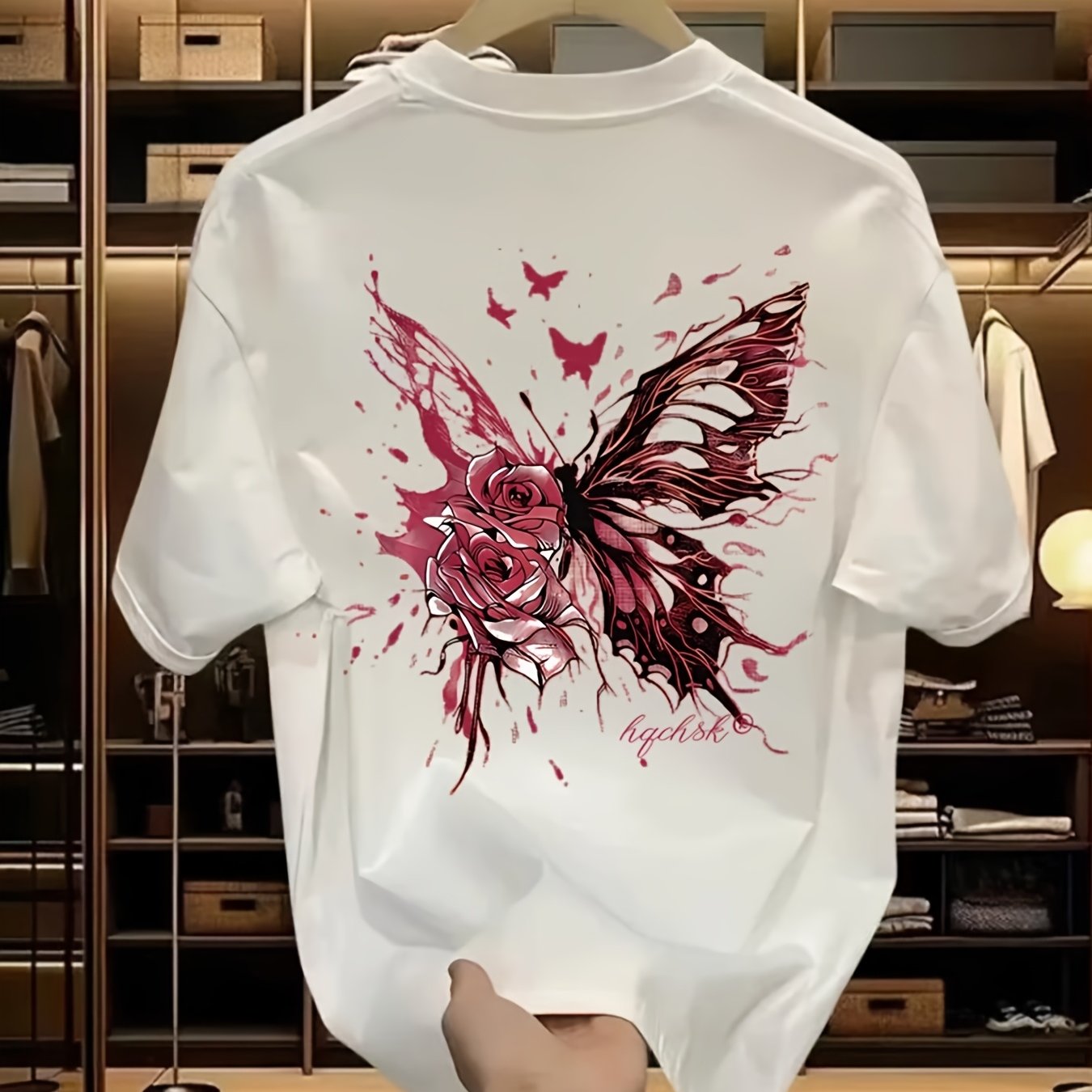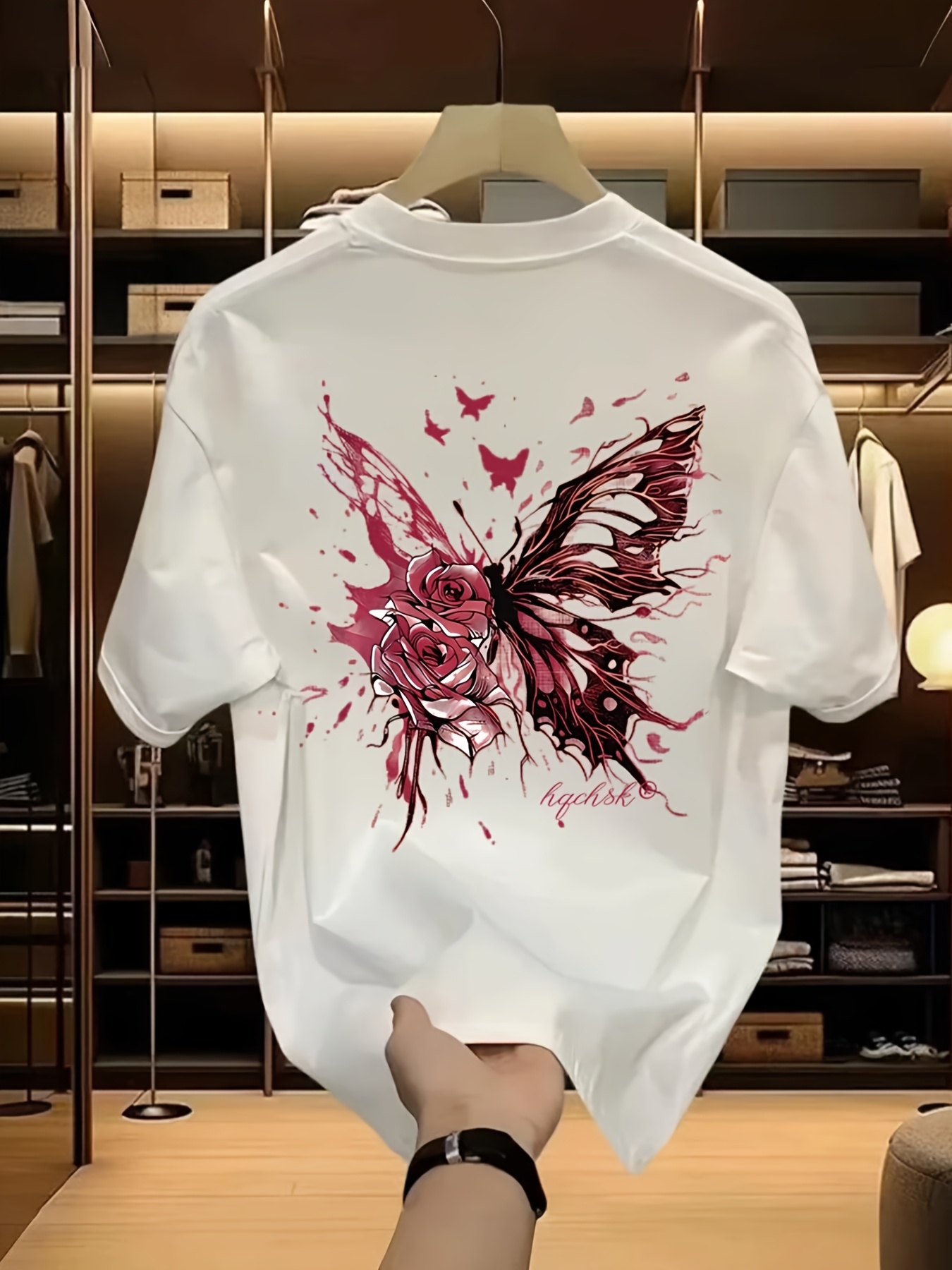 Men's 100% Cotton White T-Shirt with Pink Butterfly & Rose Back Print – Breathable Summer Casual Round Neck Short Sleeve Tee, Semi-Sheer Layered Top for Casual Attire, Parties & Dates – Hand Washable Trendy Men's Fashion Shirt
