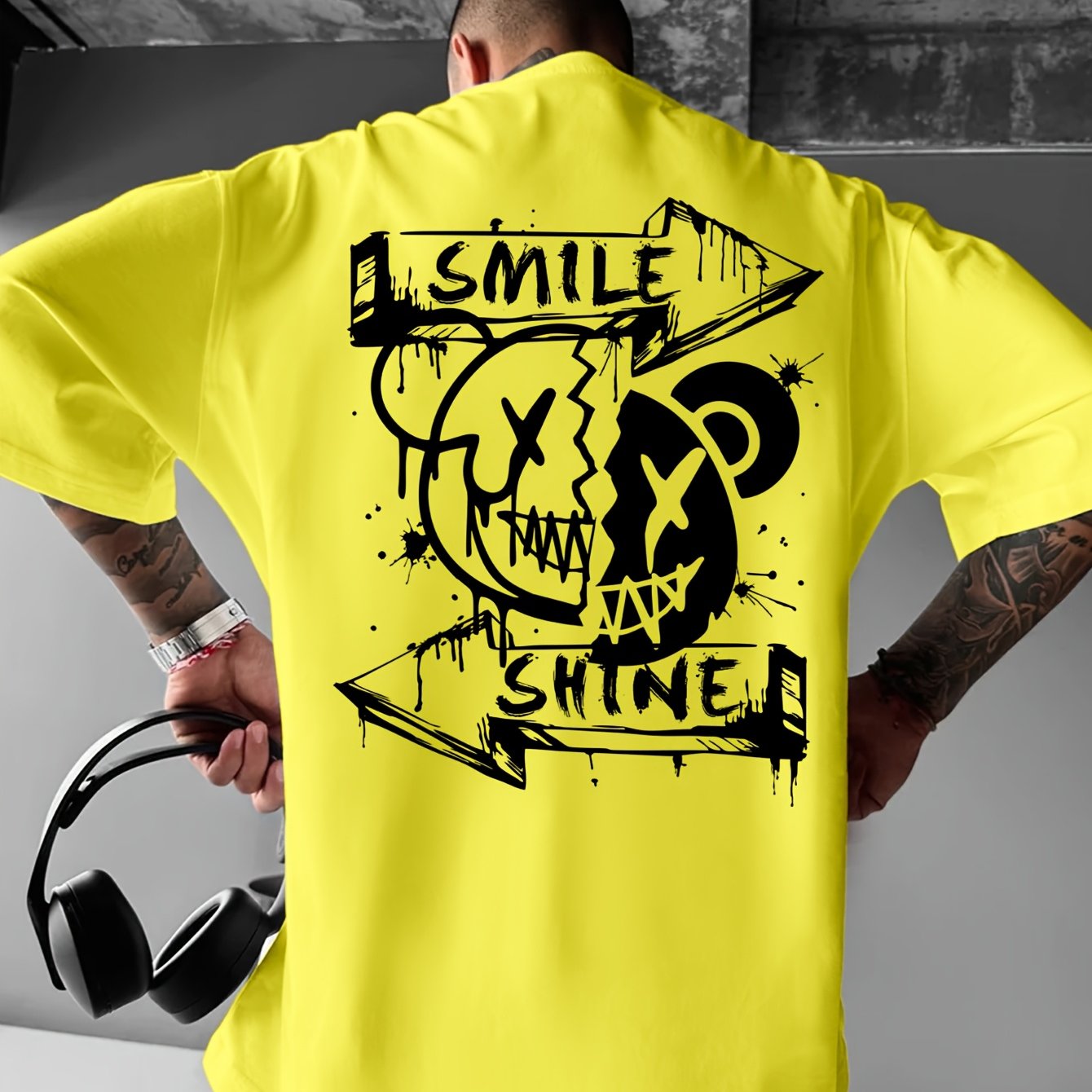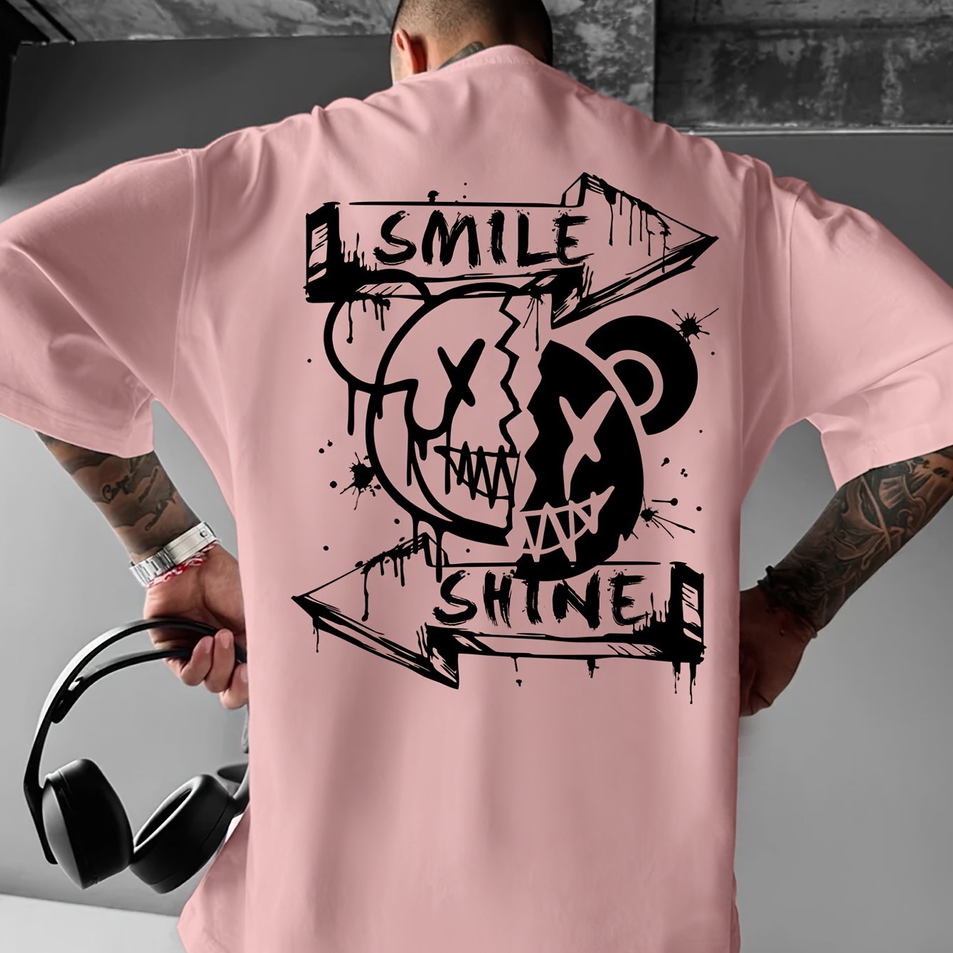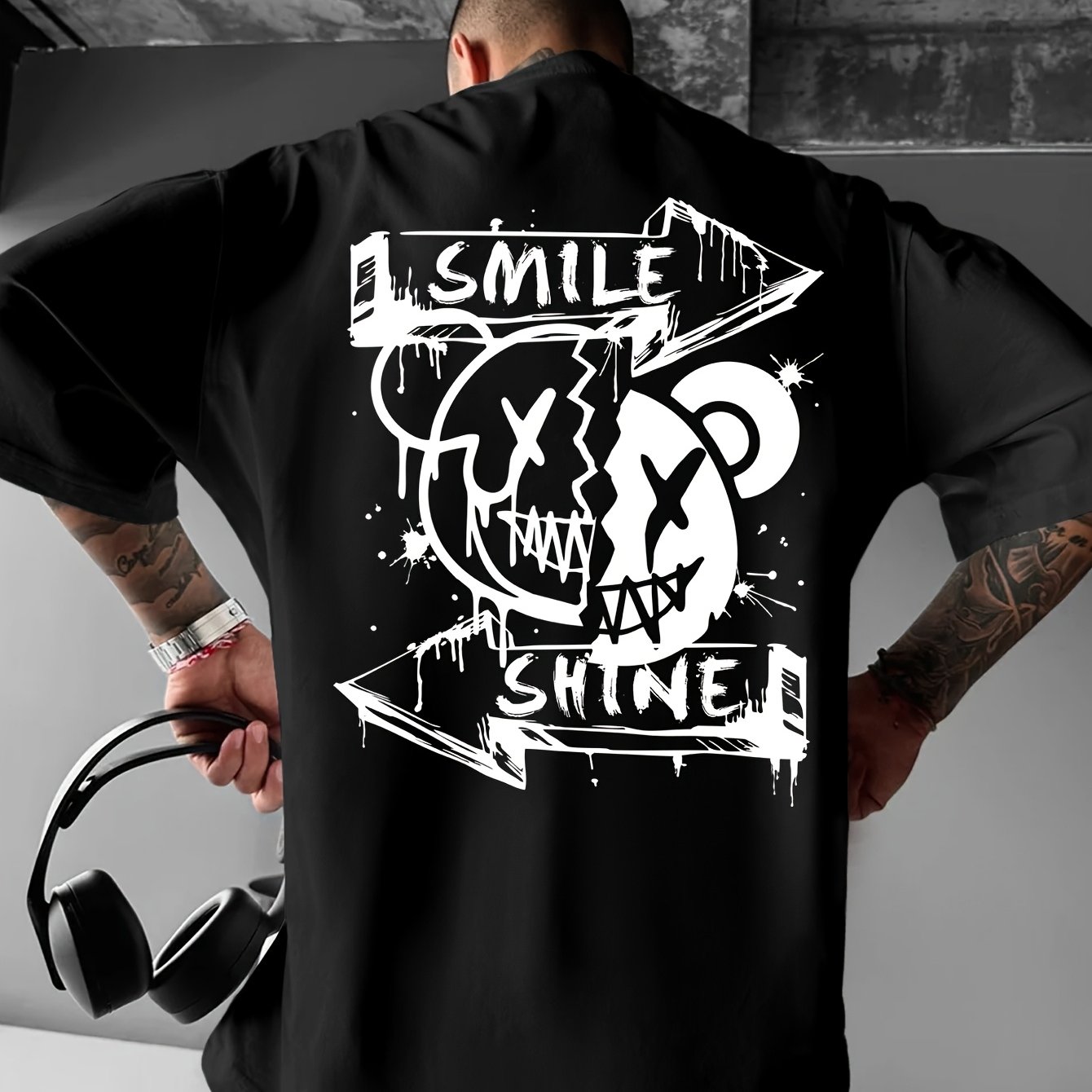 Men's American Streetwear Graphic T-Shirt – Loose Fit Round Neck Summer Tee with SMILE & SHINE Skull Design, Geometric Patterns, Machine Washable Casual Top, Streetwear Fashion, Breathable Fabric, Urban Style, Street Style, Durable Construction, Printed S