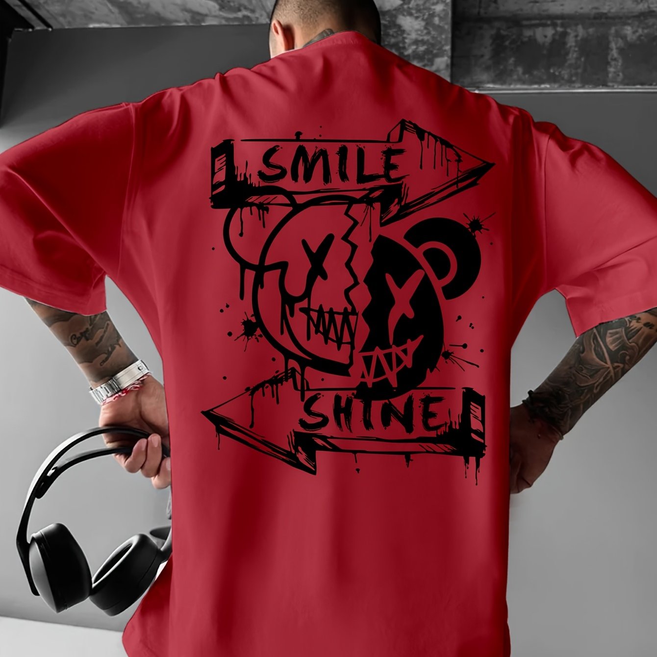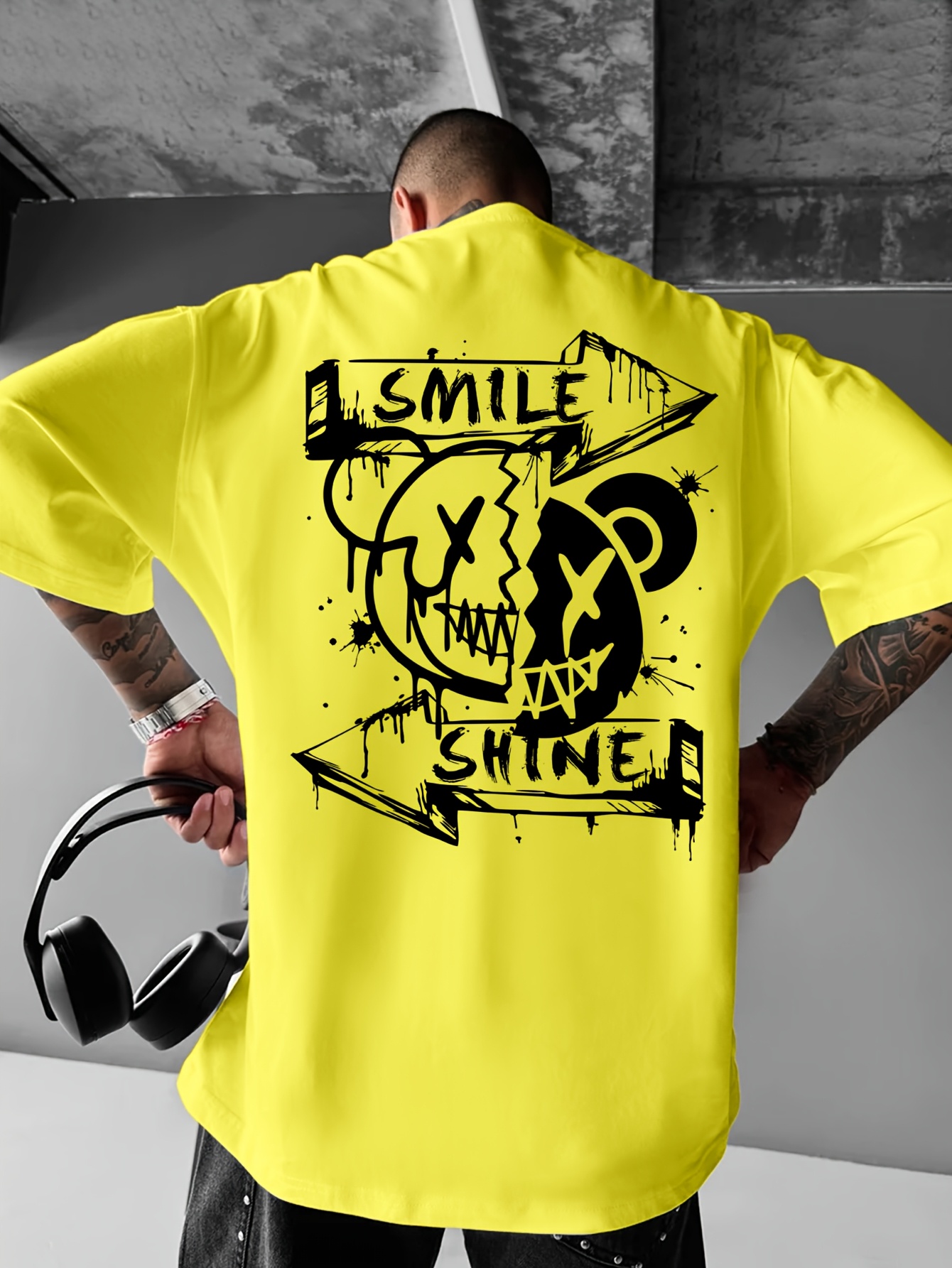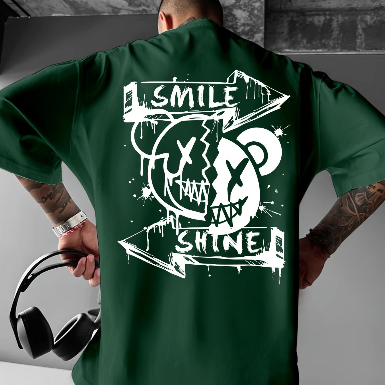 Men's American Streetwear Graphic T-Shirt – Loose Fit Round Neck Summer Tee with SMILE & SHINE Skull Design, Geometric Patterns, Machine Washable Casual Top, Streetwear Fashion, Breathable Fabric, Urban Style, Street Style, Durable Construction, Printed S