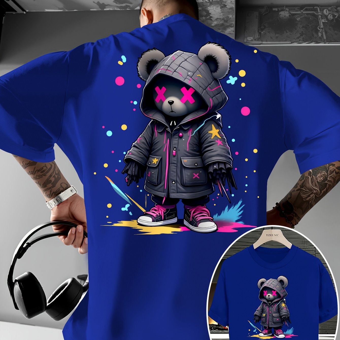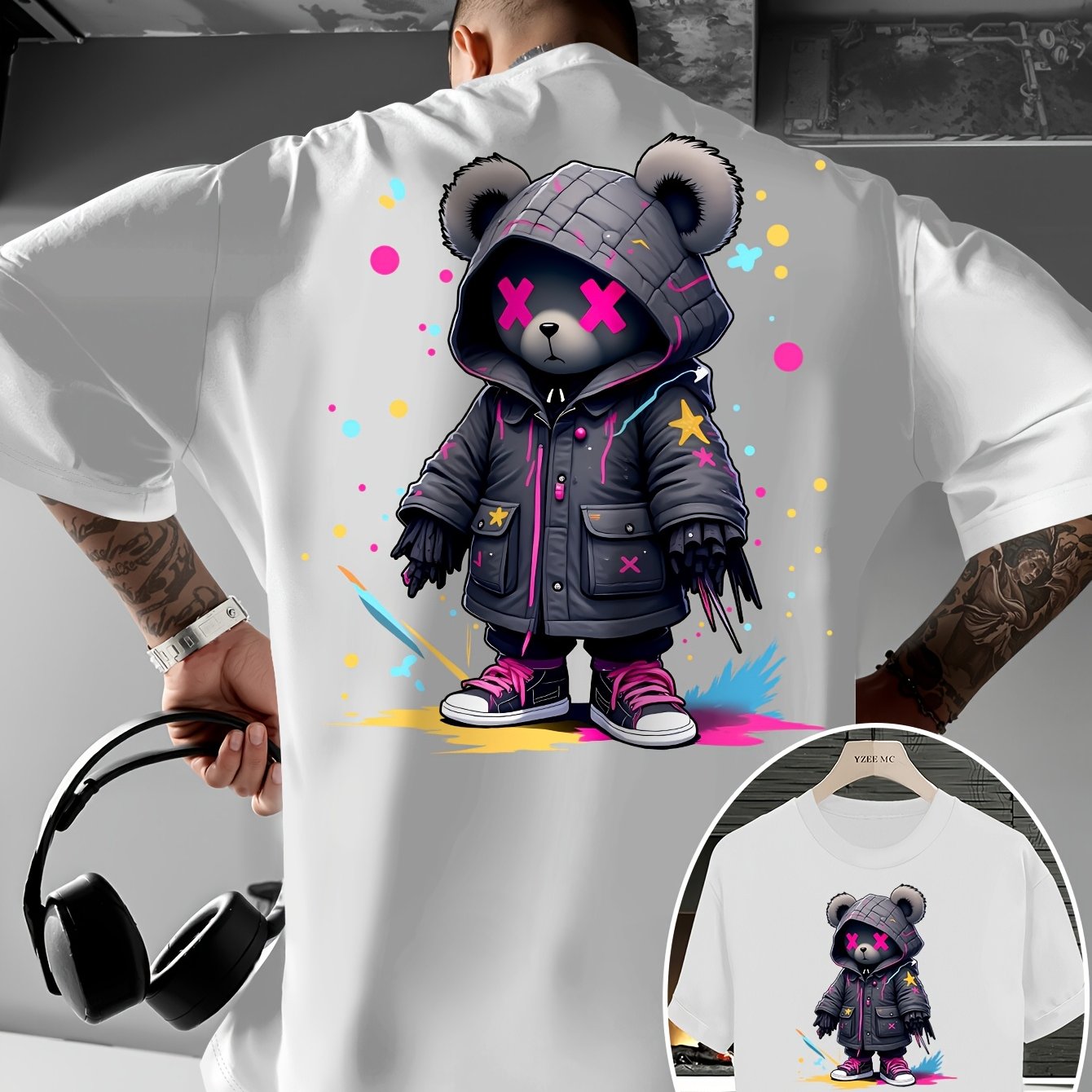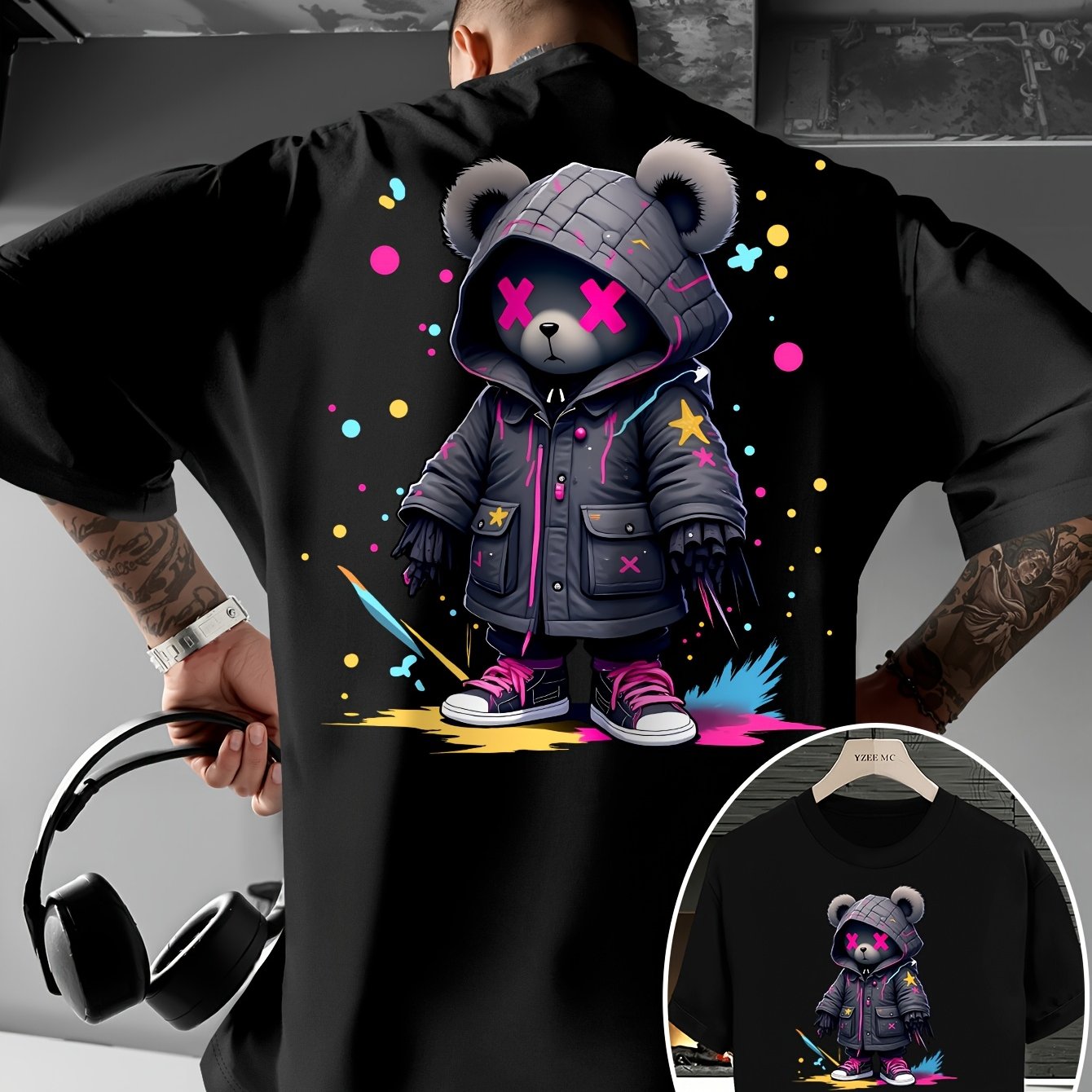 Men'S Casual Graphic T-Shirt with Charming Bear Design – Loose Fit, Crew Neck, Short Sleeve, Summer Streetwear, Black with Colorful Splatter Print, Casual Wear | Playful Design | Asymmetrical Design