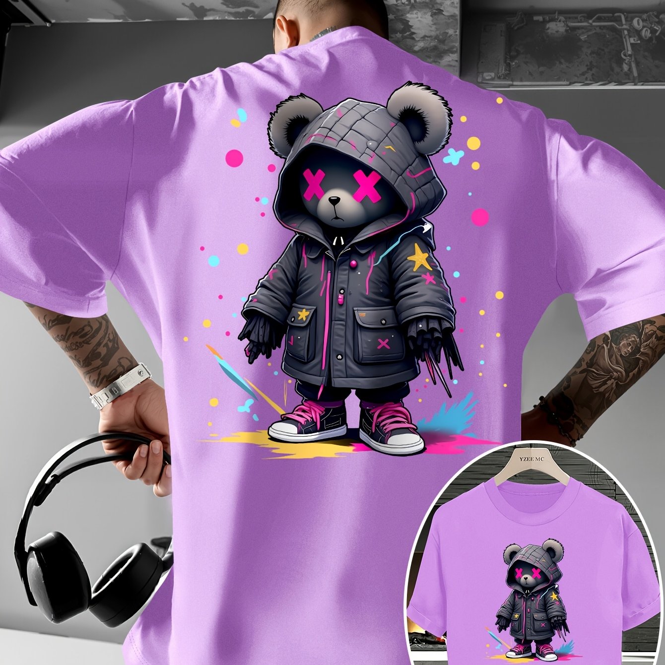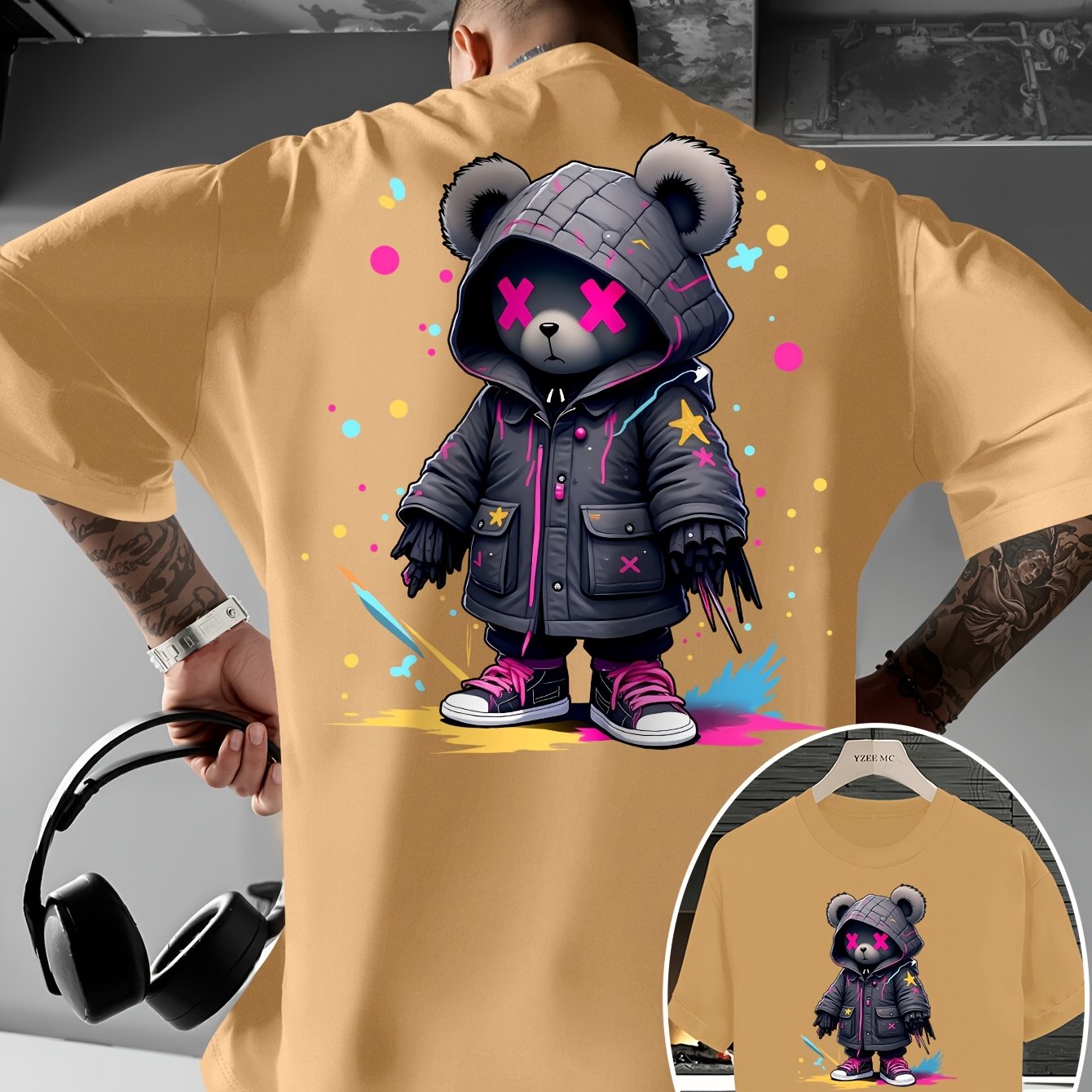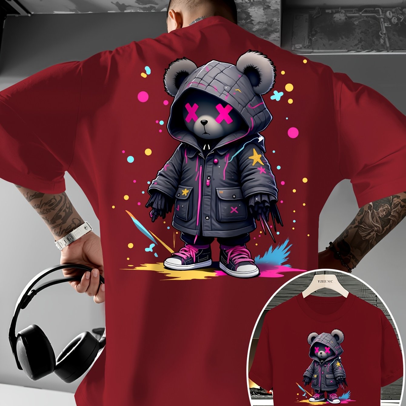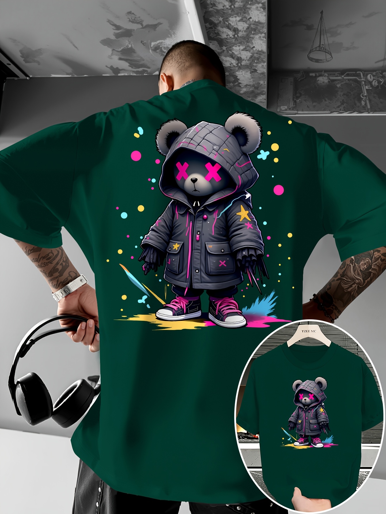 Men'S Casual Graphic T-Shirt with Charming Bear Design – Loose Fit, Crew Neck, Short Sleeve, Summer Streetwear, Black with Colorful Splatter Print, Casual Wear | Playful Design | Asymmetrical Design