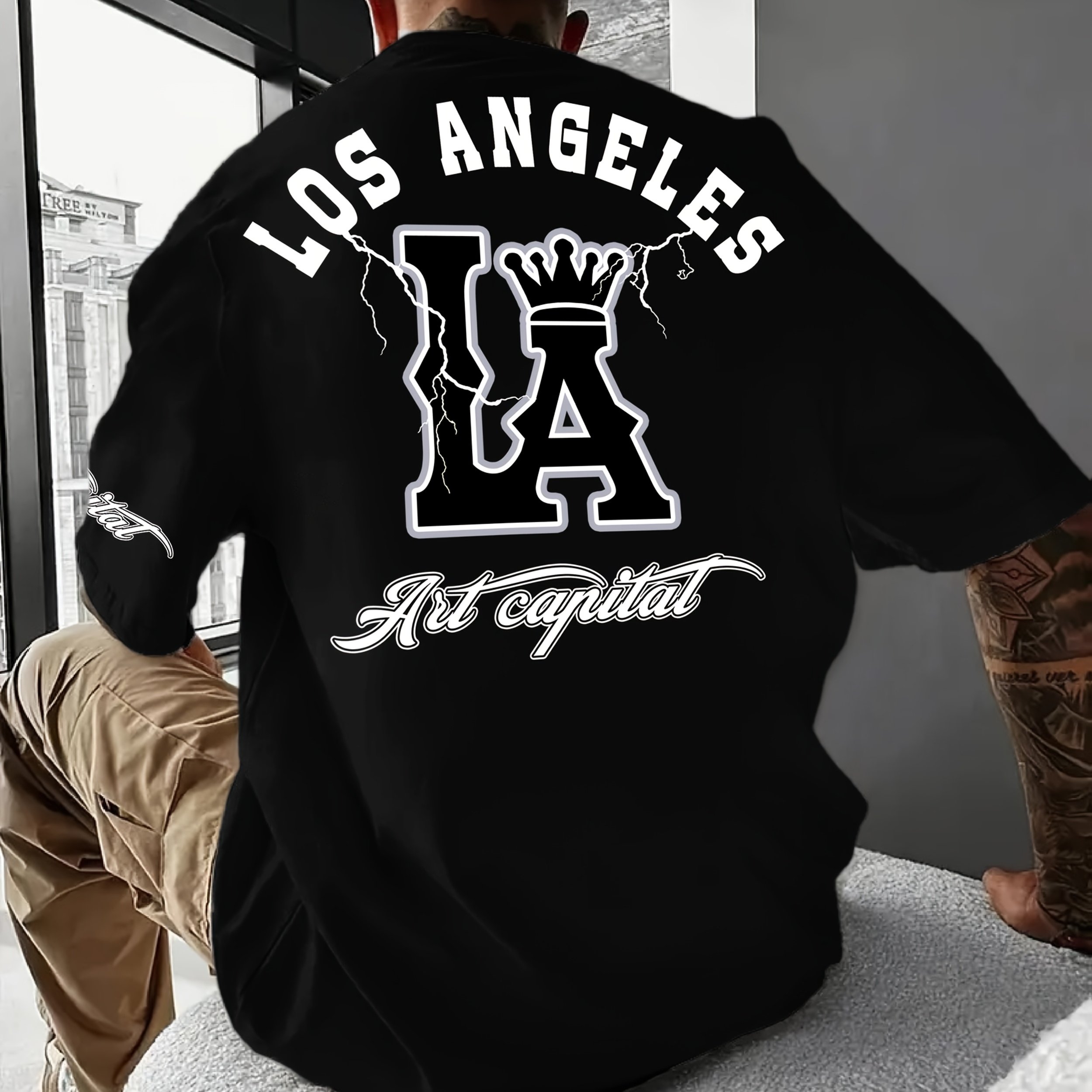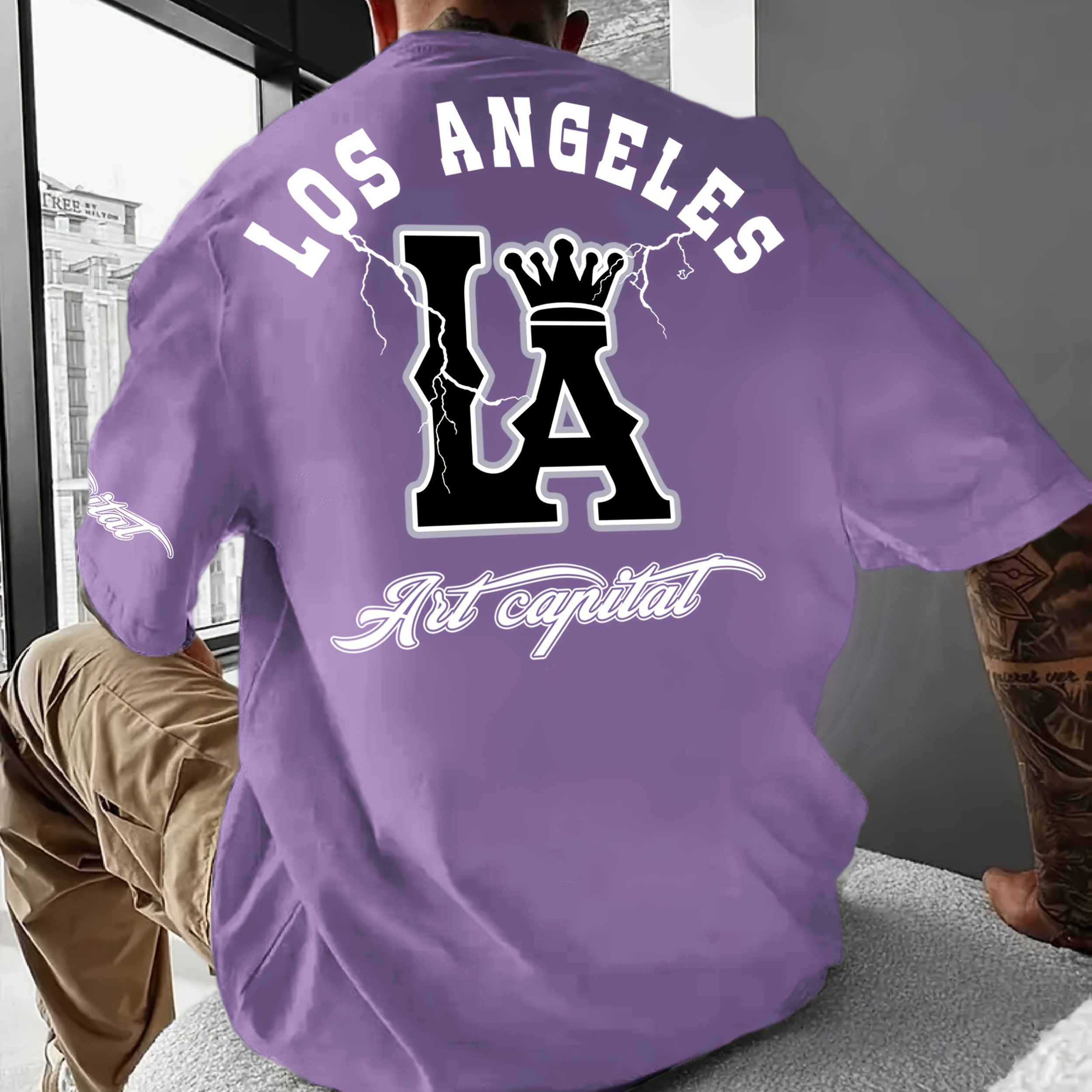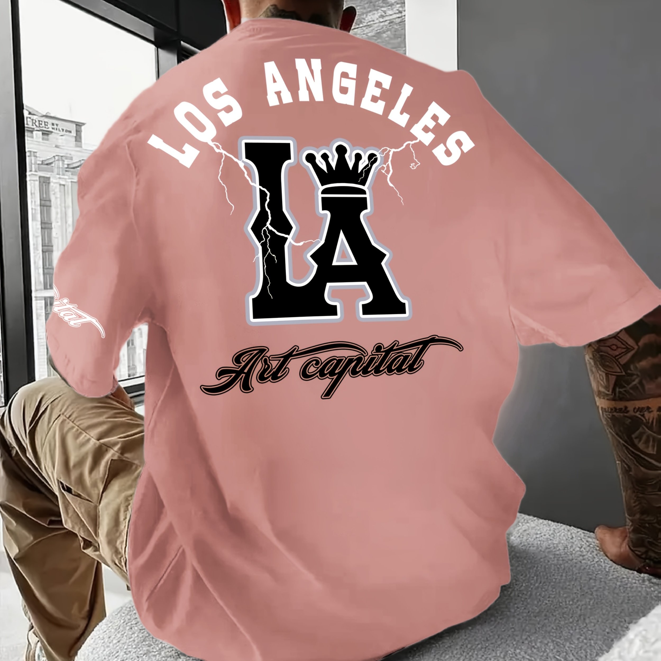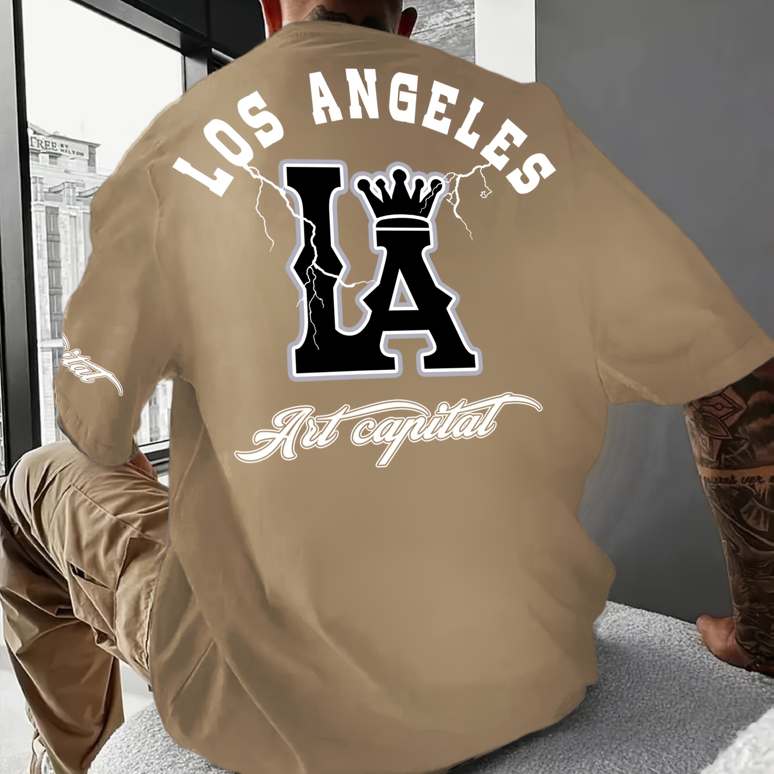 Men's Casual LA Graphic T-Shirt – Breathable Stretch Fabric, Oversized Fit with Crown & Script Lettering, Beige Summer Tee for Outdoor Activities & Casual Attire, Machine Washable, Leisure Clothing, Citythemed Apparel