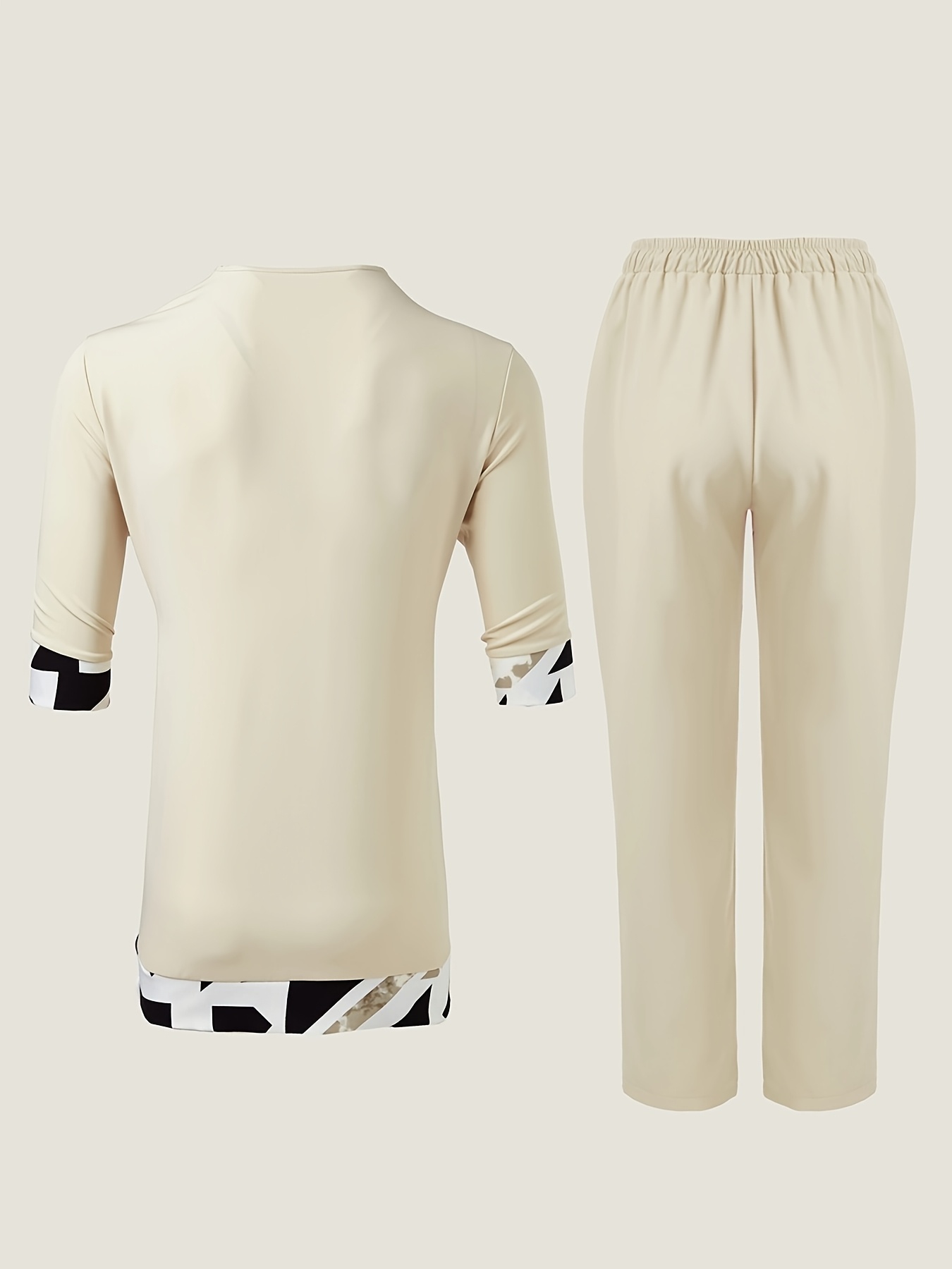 Men'S Casual Crew Neck Long-Sleeve Trousersuit, Geometric Pattern Split Print, Breathable Skin-Friendly Knit Polyester, All-Season Regular Fit with Pockets, 160g/m² Fabric Weight