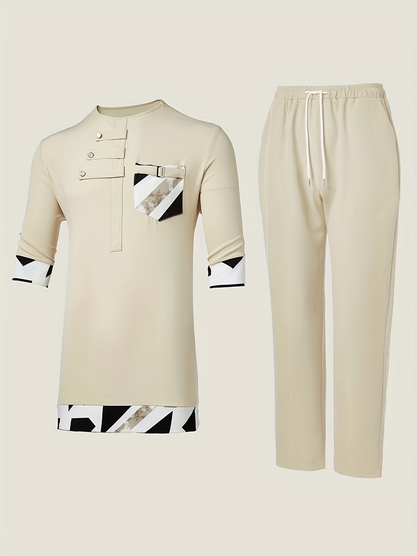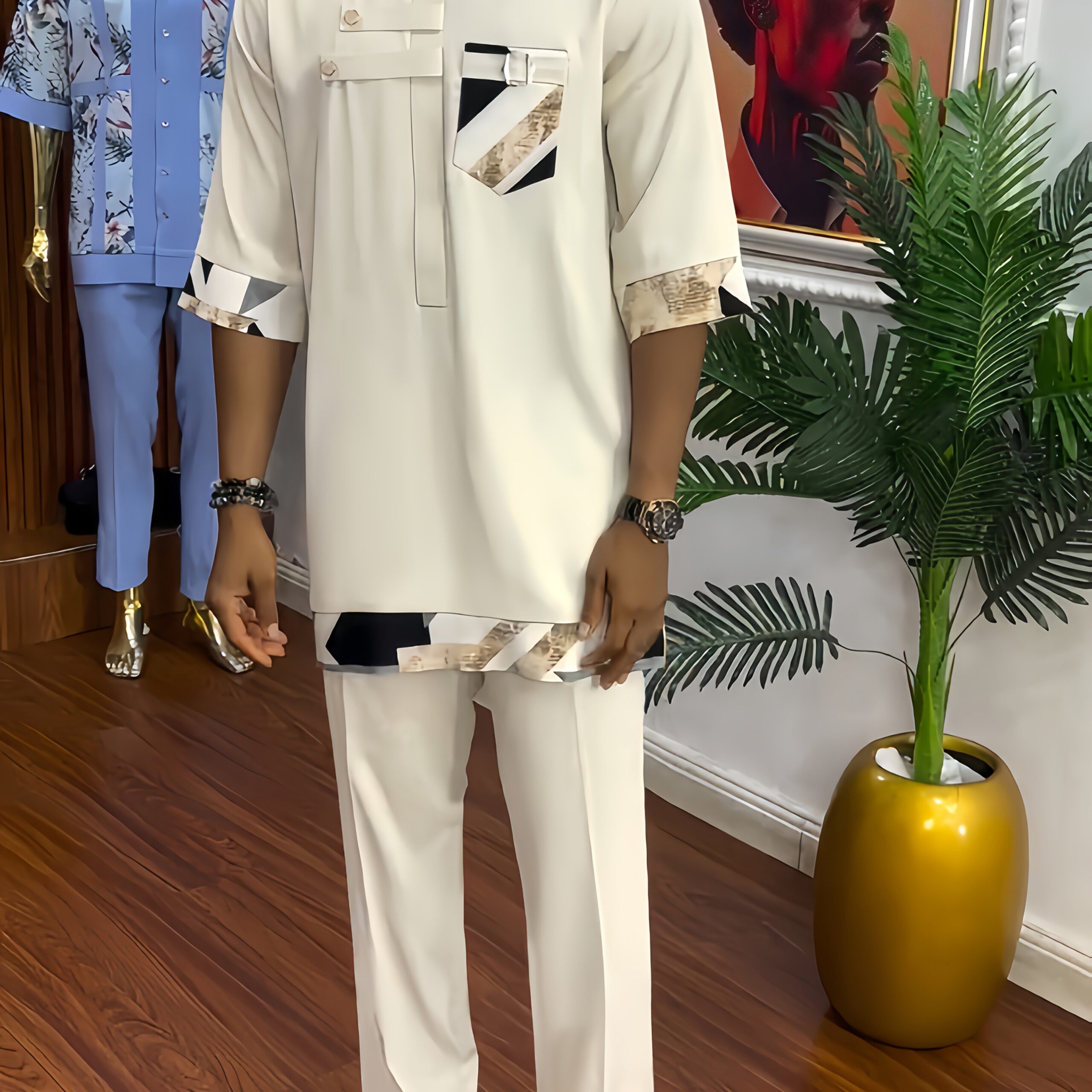 Men'S Casual Two-Piece Ethnic Style Shirt and Drawstring Pants Set – White with Golden Accents, Machine Washable, All-Season Wear, Formal Attire | Elegant Attire | Glossy Texture, Casual Attire|Ethnic Style Shirt|Pocketed Pants