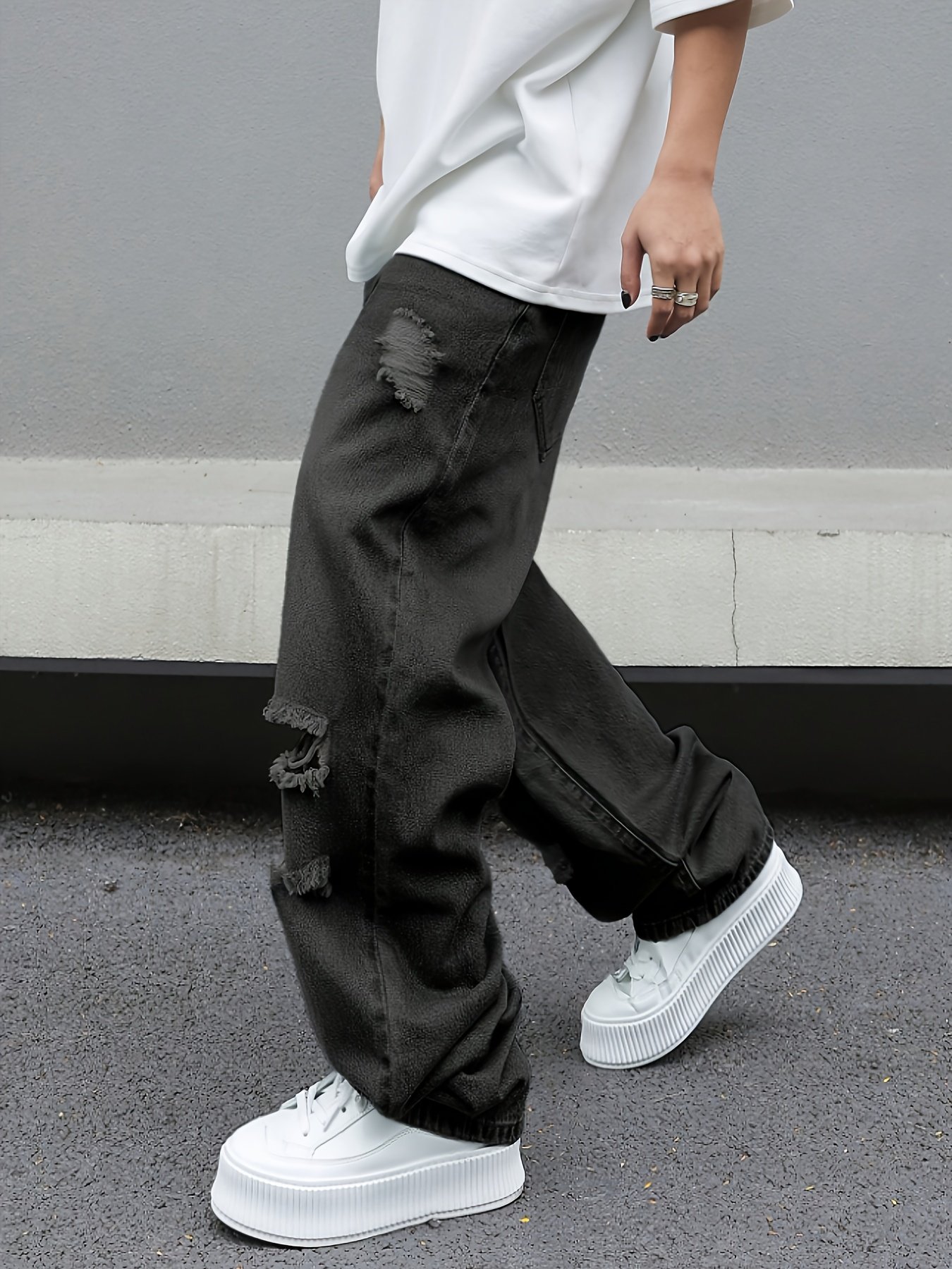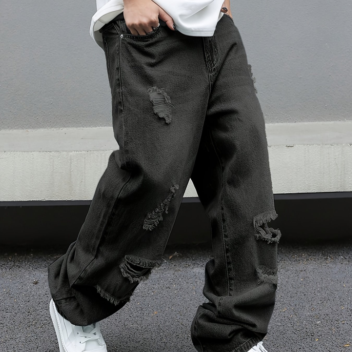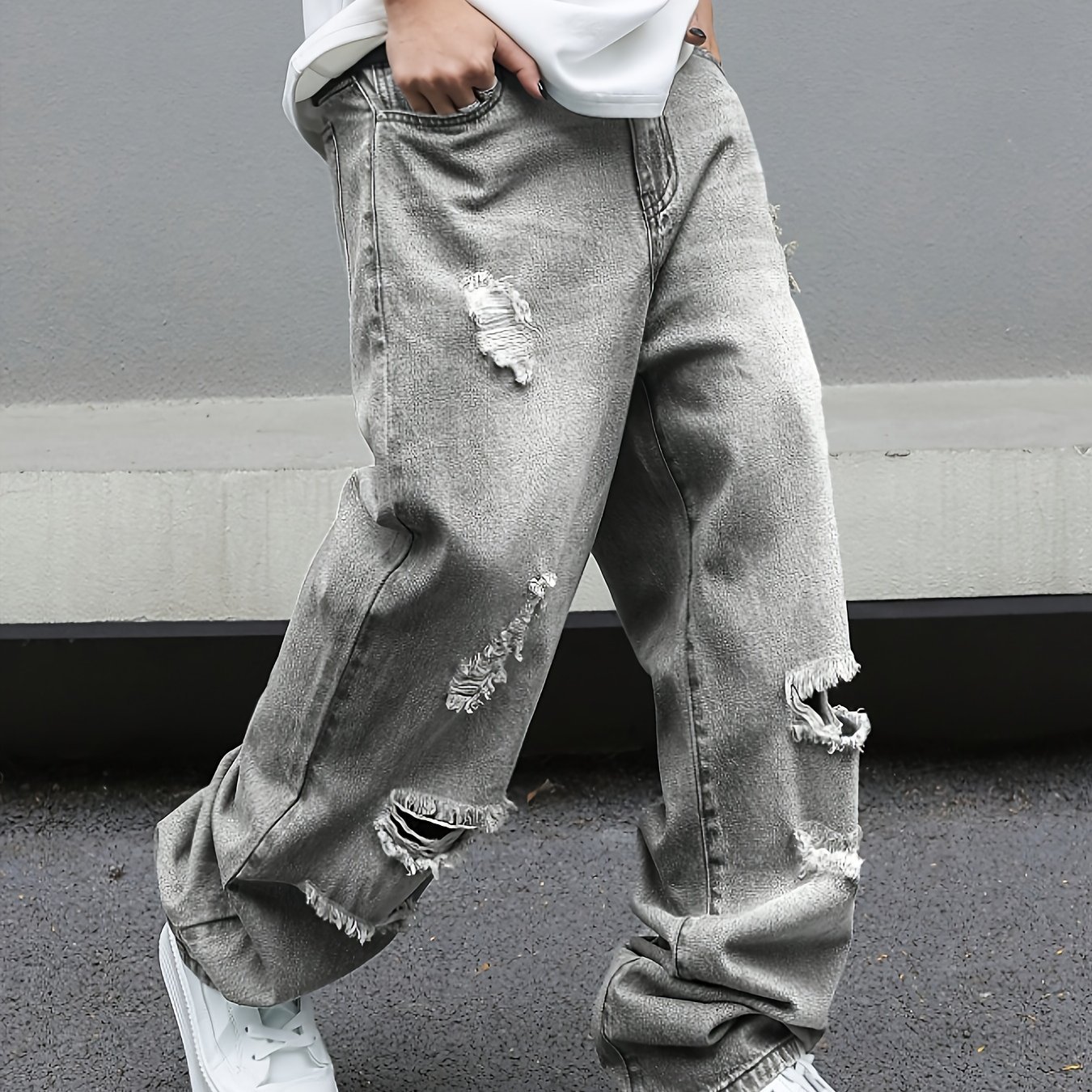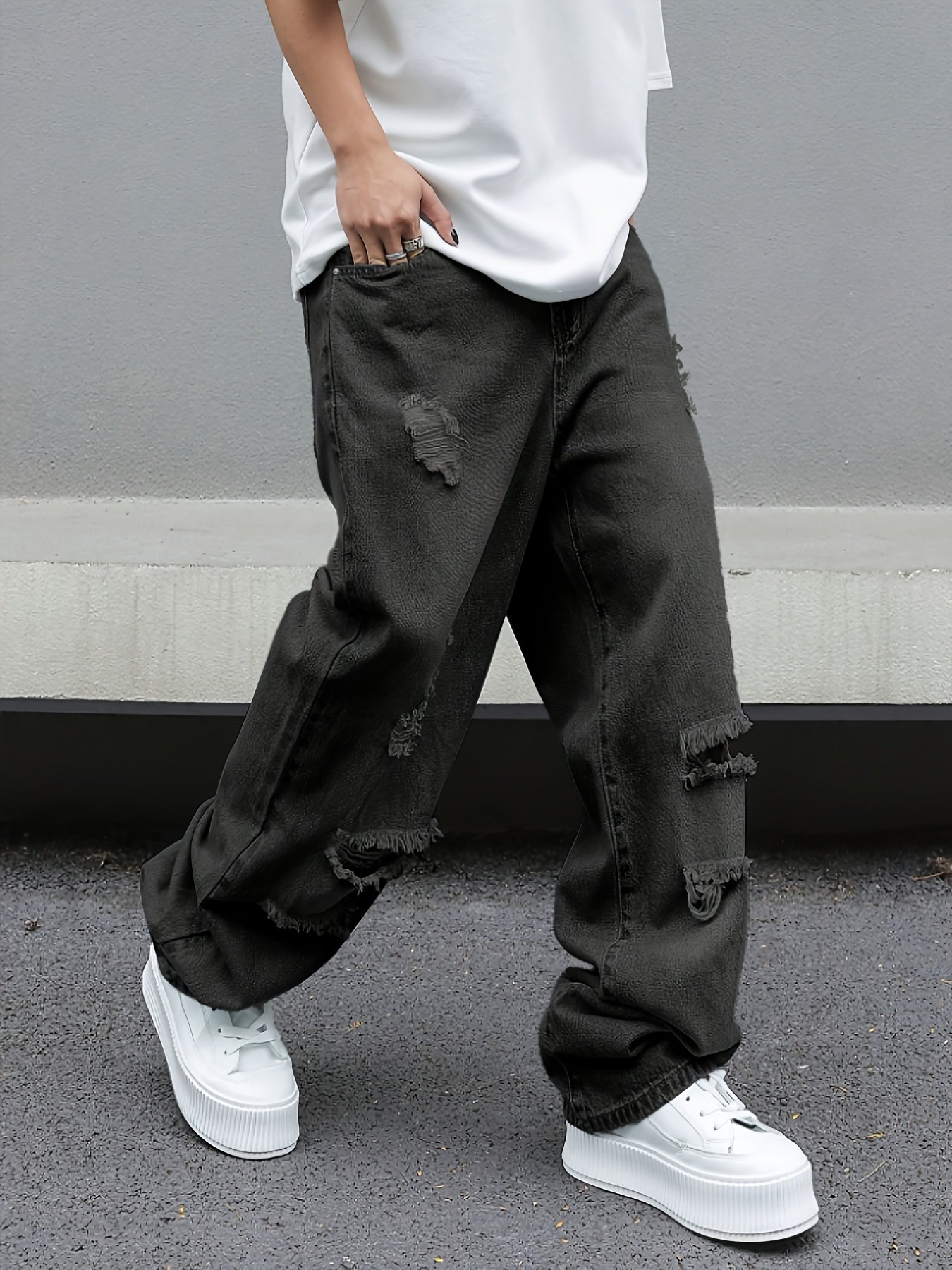 Men's & Women's Wide-Leg Distressed Denim Jeans – Oversized Streetwear Pants with Frayed Hem & Rivet Details, Heavy-Duty Loose Fit, Beltless All-Season Wear No Belt/Accessories – Casual Outfit Staple for Jeanswear Lovers