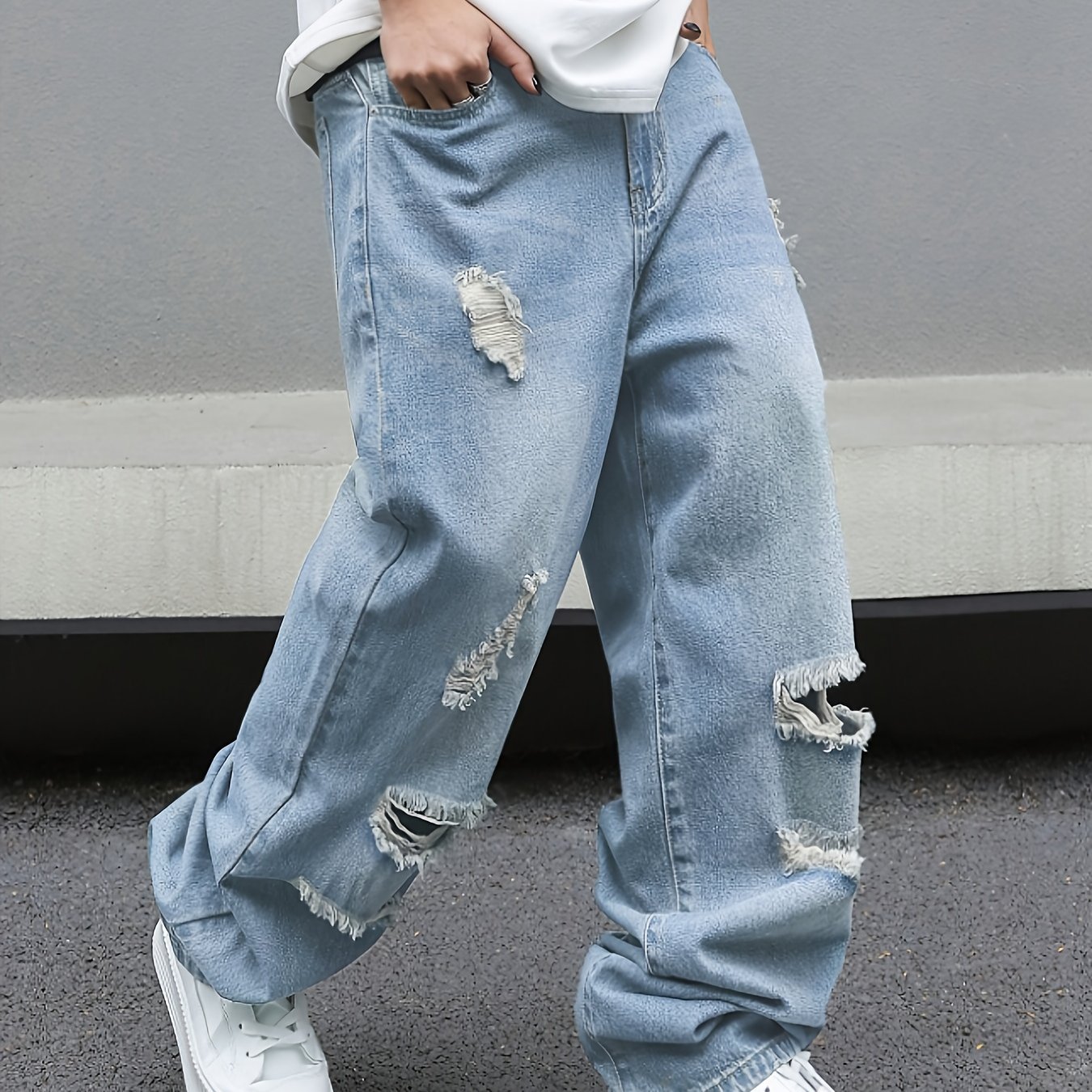 Men's Vintage Distressed Wide-Leg Jeans – Oversized Relaxed Fit Wash Blue, Frayed Hem & Belt Loop Casual Hiphop Streetwear Pants Non-Stretch, Machine Washable for All-Season Wear