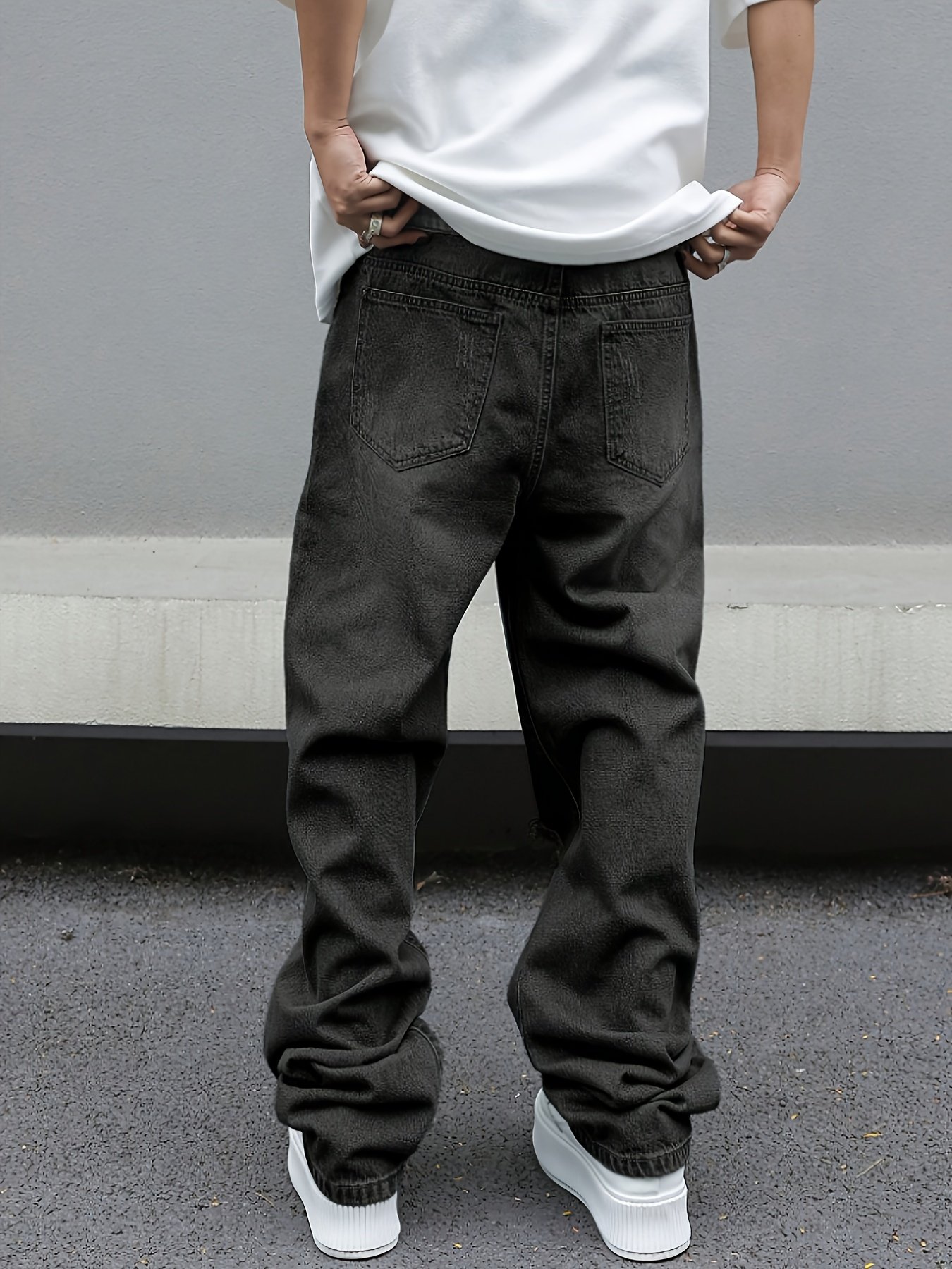 1pc Men'S Heavyweight Vintage Black & Gray Washed Distressed Faux Denim – Oversized Loose-Fit Streetwear Pants with Japanese-Inspired Embroidery