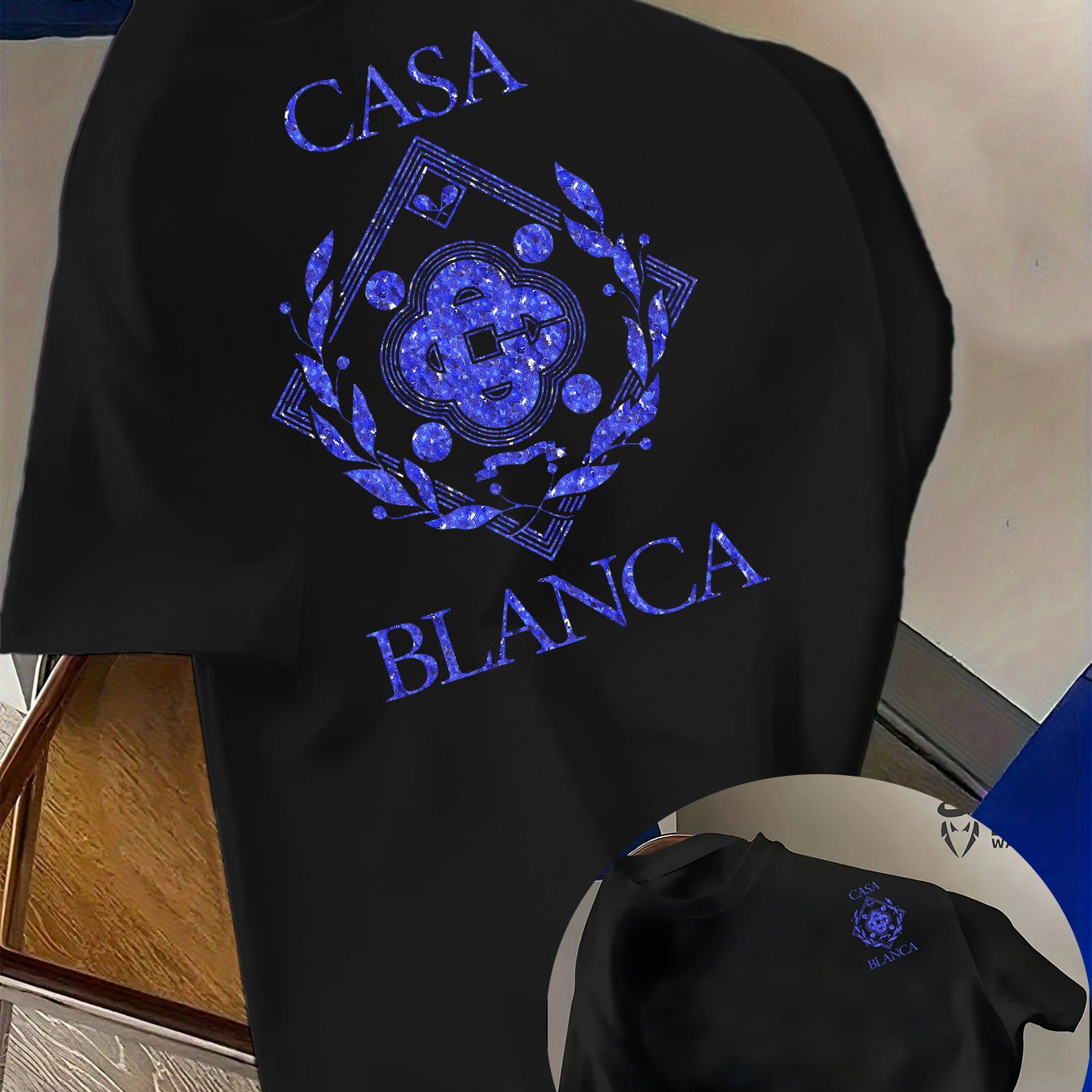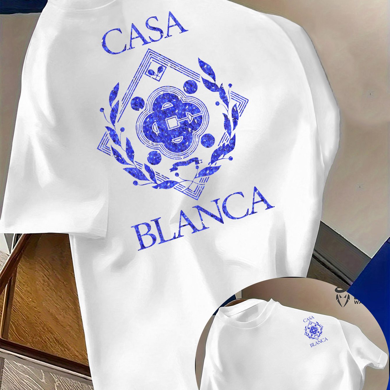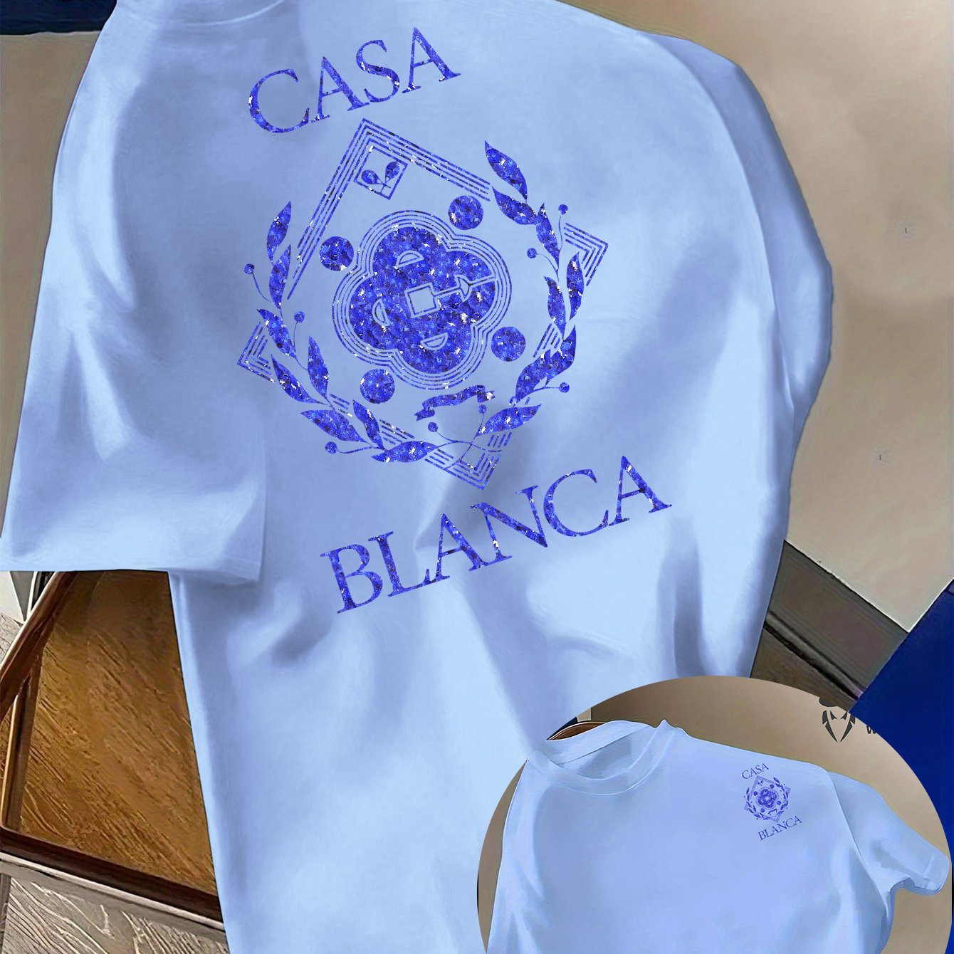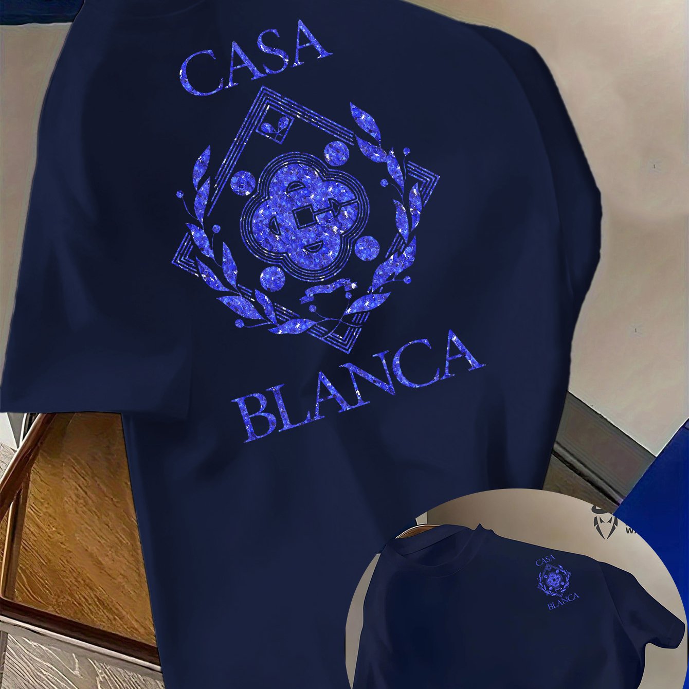 Men'S Graphic T-Shirt – Bold CASA BLANCA Lettering in Blue, Loose Fit Crewneck Tee for Everyday & Formal Events – Machine Washable Casual Shirt for Men, Comfortable Clothing, Artistic Design, Breathable Fabric, Short Sleeve Top, Streetwear Lovers, Knit