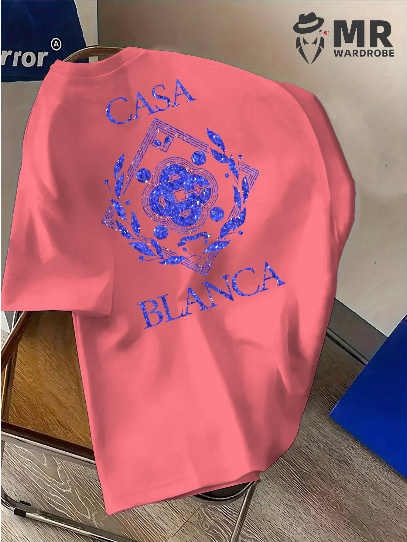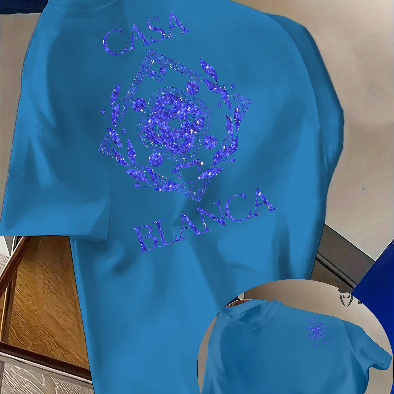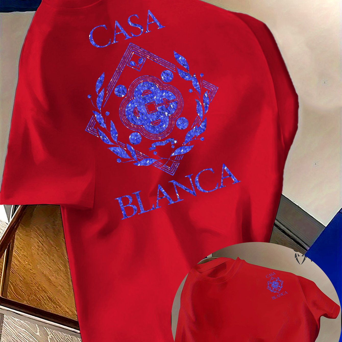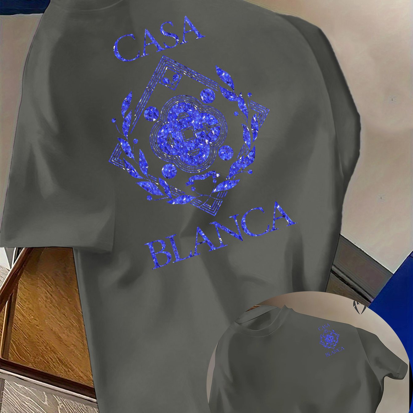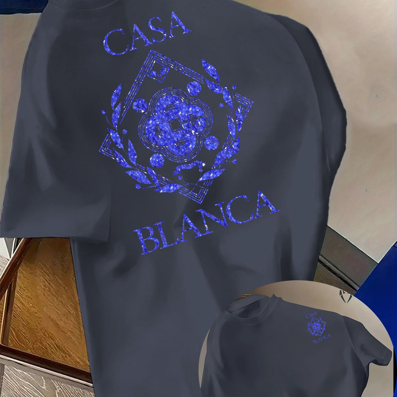 Men'S Graphic T-Shirt – Bold CASA BLANCA Lettering in Blue, Loose Fit Crewneck Tee for Everyday & Formal Events – Machine Washable Casual Shirt for Men, Comfortable Clothing, Artistic Design, Breathable Fabric, Short Sleeve Top, Streetwear Lovers, Knit