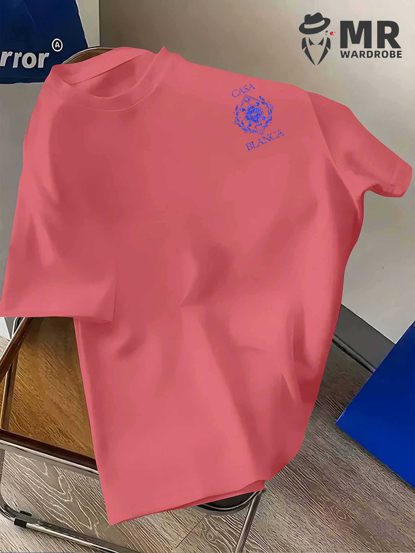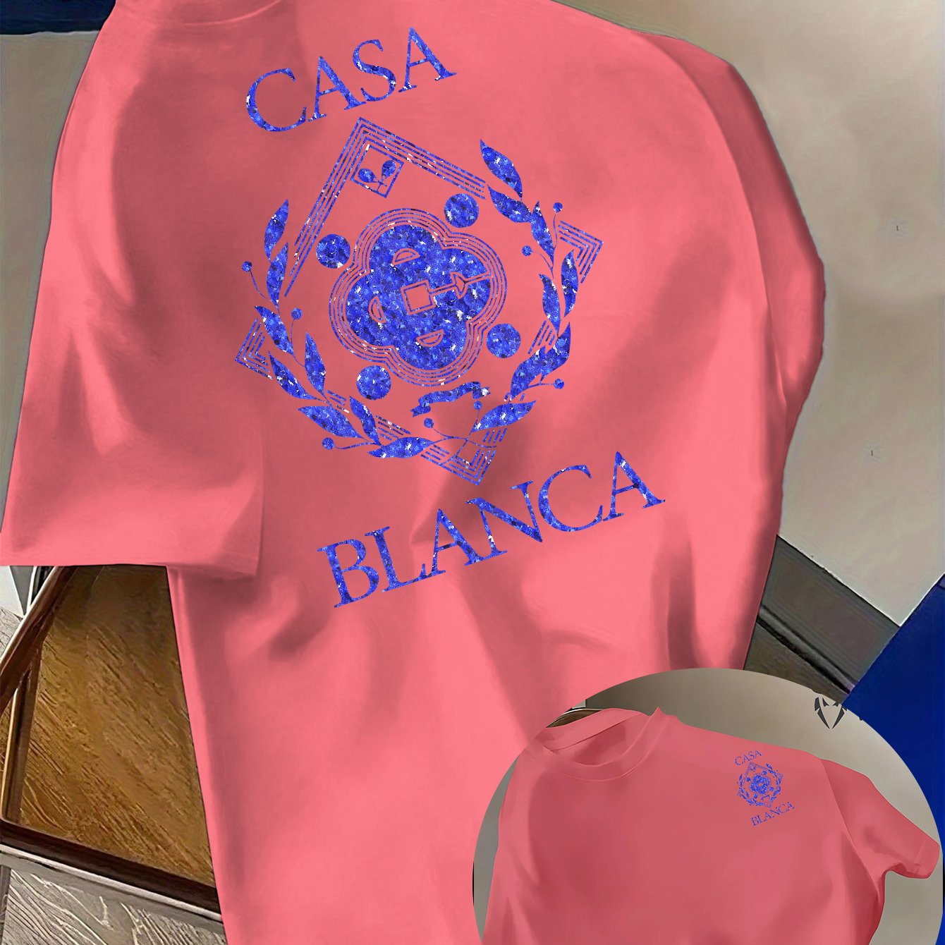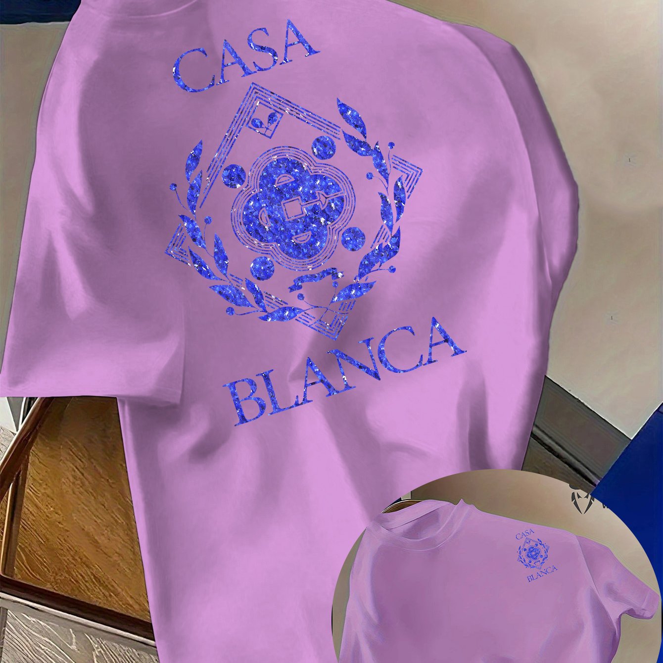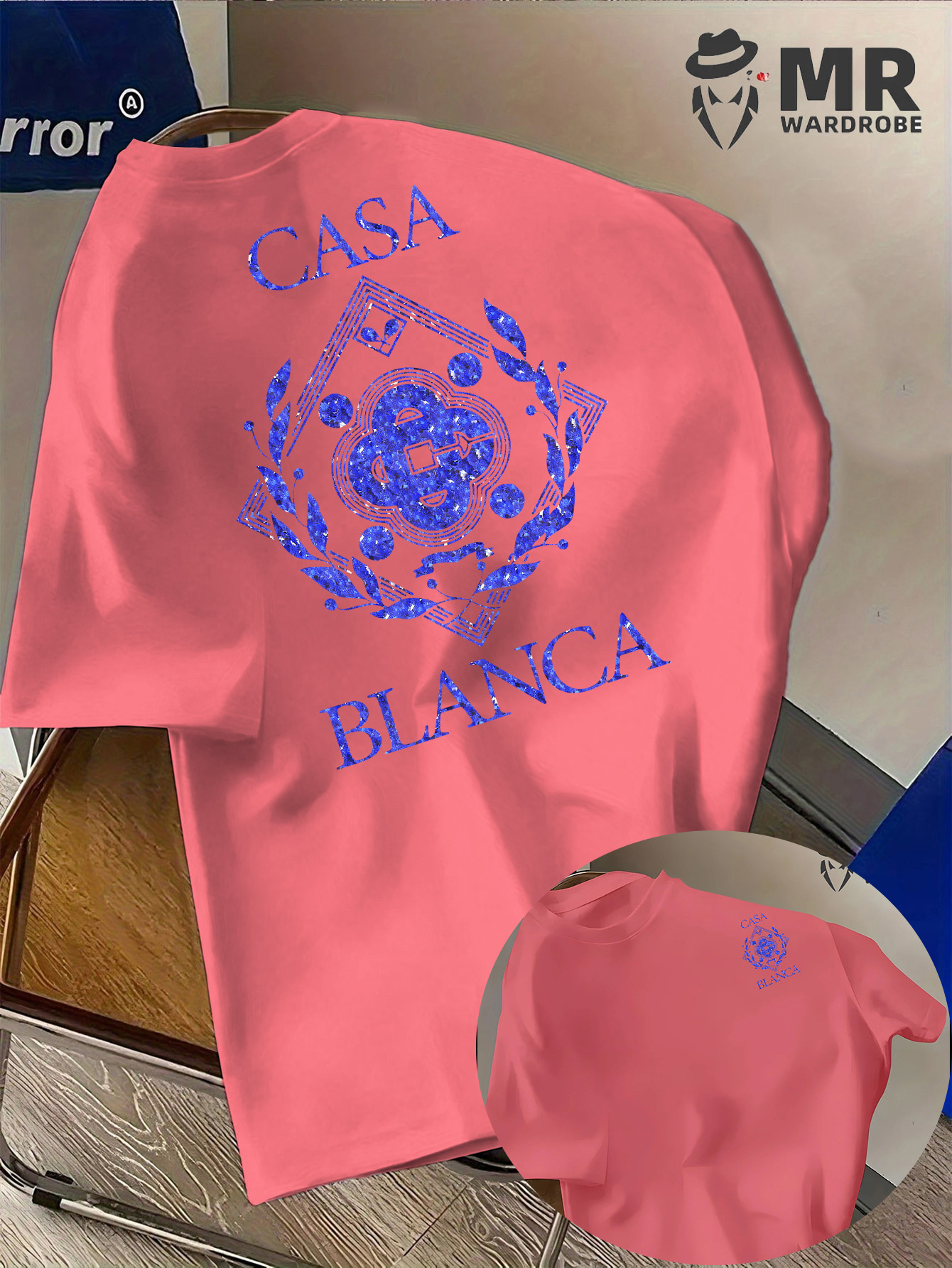 Men'S Graphic T-Shirt – Bold CASA BLANCA Lettering in Blue, Loose Fit Crewneck Tee for Everyday & Formal Events – Machine Washable Casual Shirt for Men, Comfortable Clothing, Artistic Design, Breathable Fabric, Short Sleeve Top, Streetwear Lovers, Knit