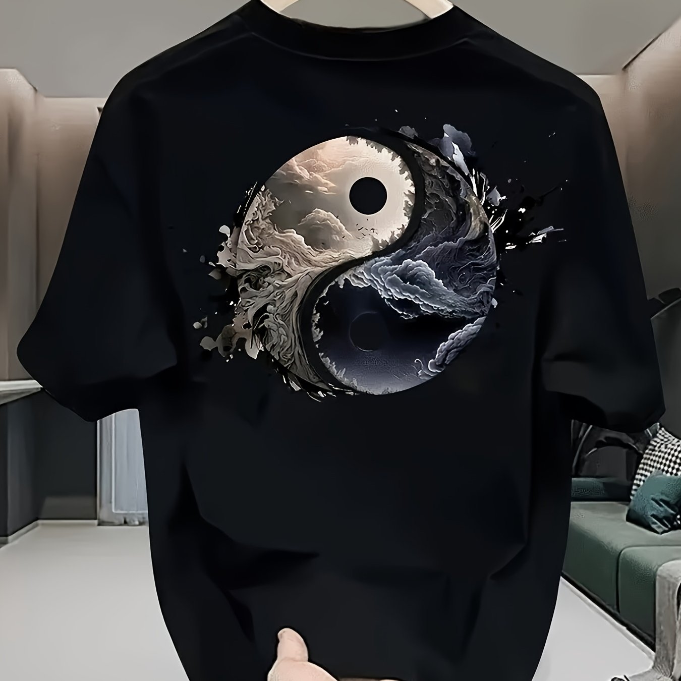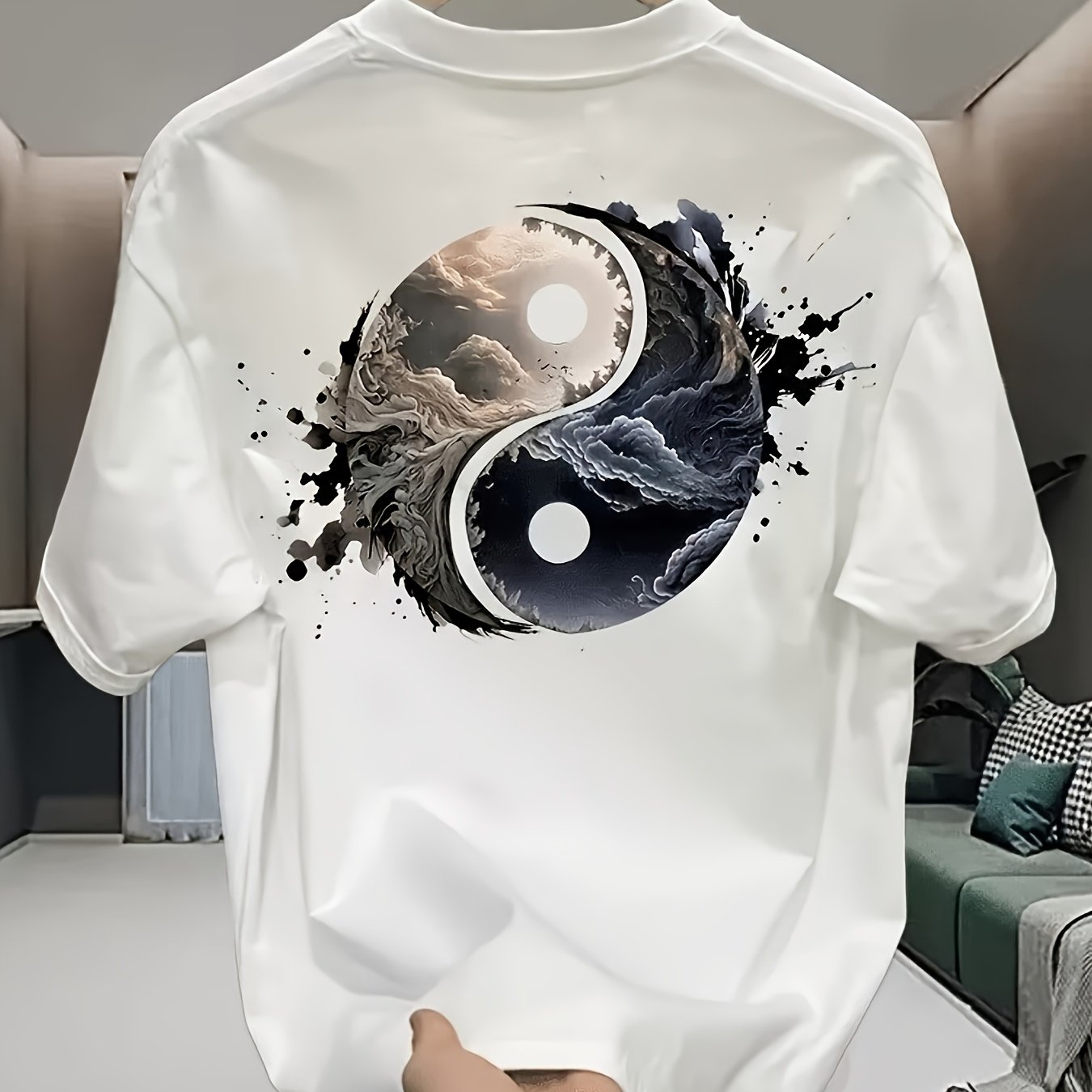 Men's Heavyweight 100% Cotton Oversized T-Shirt – Yin-Yang Graphic Print Black & White Casual Streetwear Tee, Round Neck Short Sleeve Loose Fit for Casual Attire, All-Season Comfort Machine Washable – Trendy Men's Fashion Statement