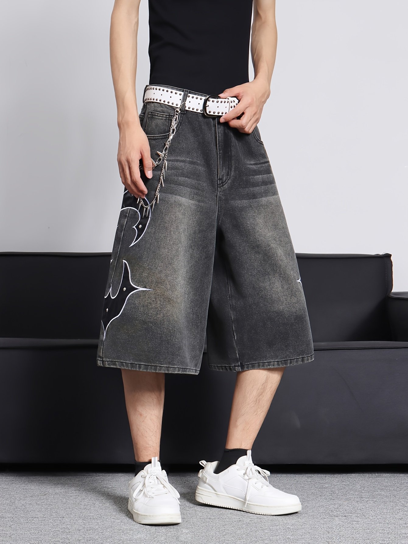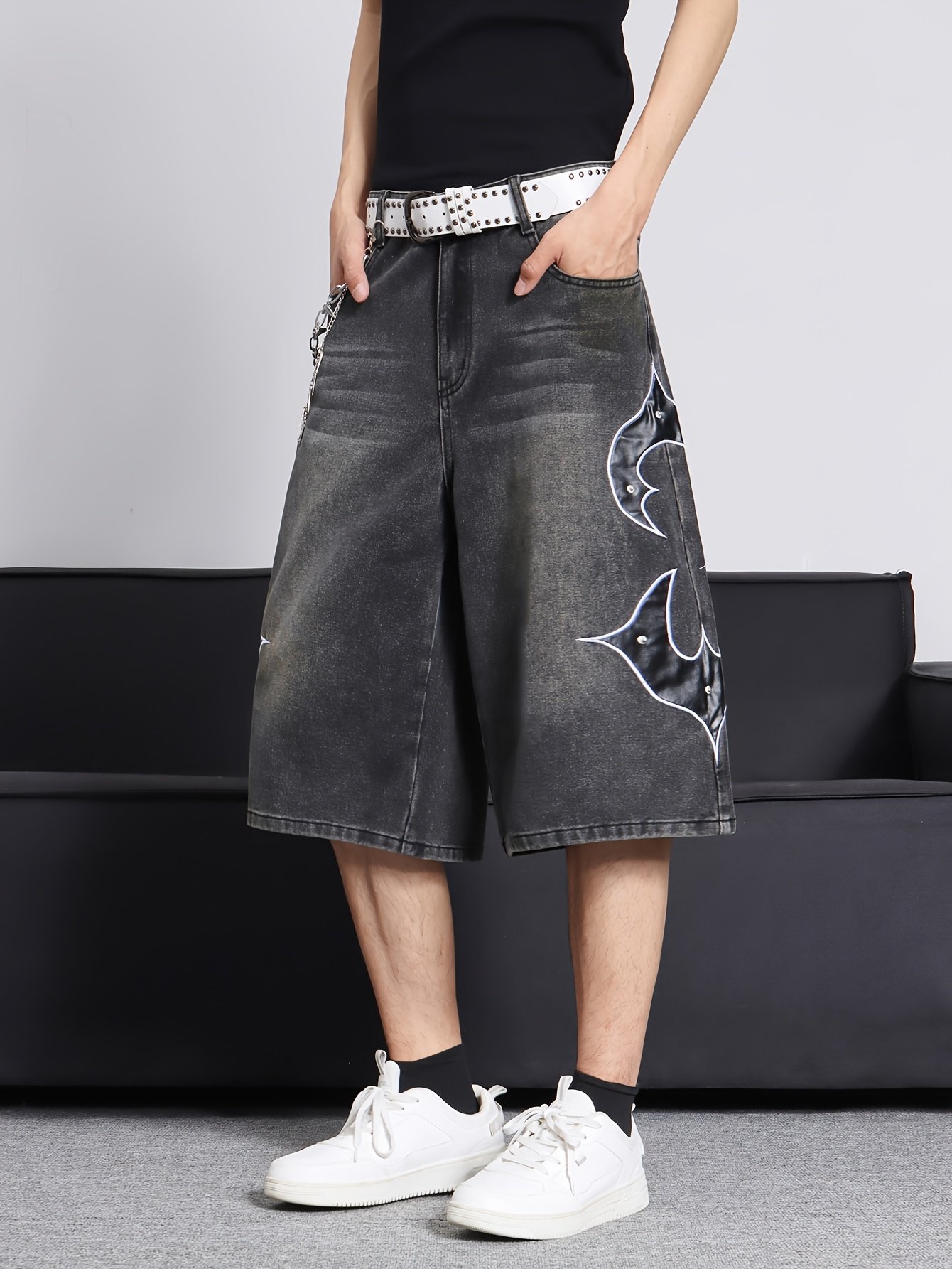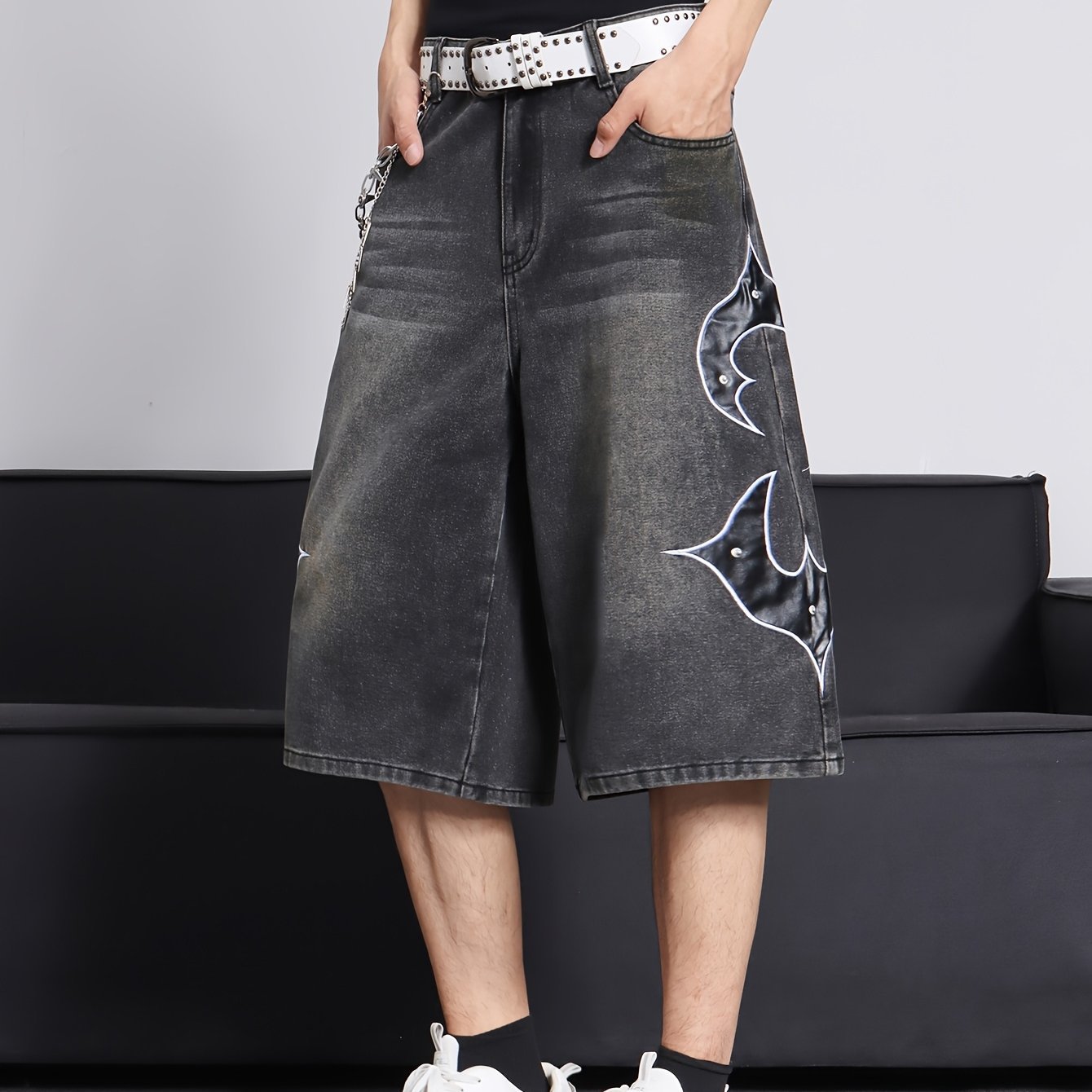 Men's High-Waisted 7/8 Length Denim Shorts – Relaxed Fit Fringe Hem & Geometric Appliqué Design, Mid-Rise Casual Streetwear Shorts with Stitching Details, Machine Washable Loose-Fit Jeans for Casual Attire
