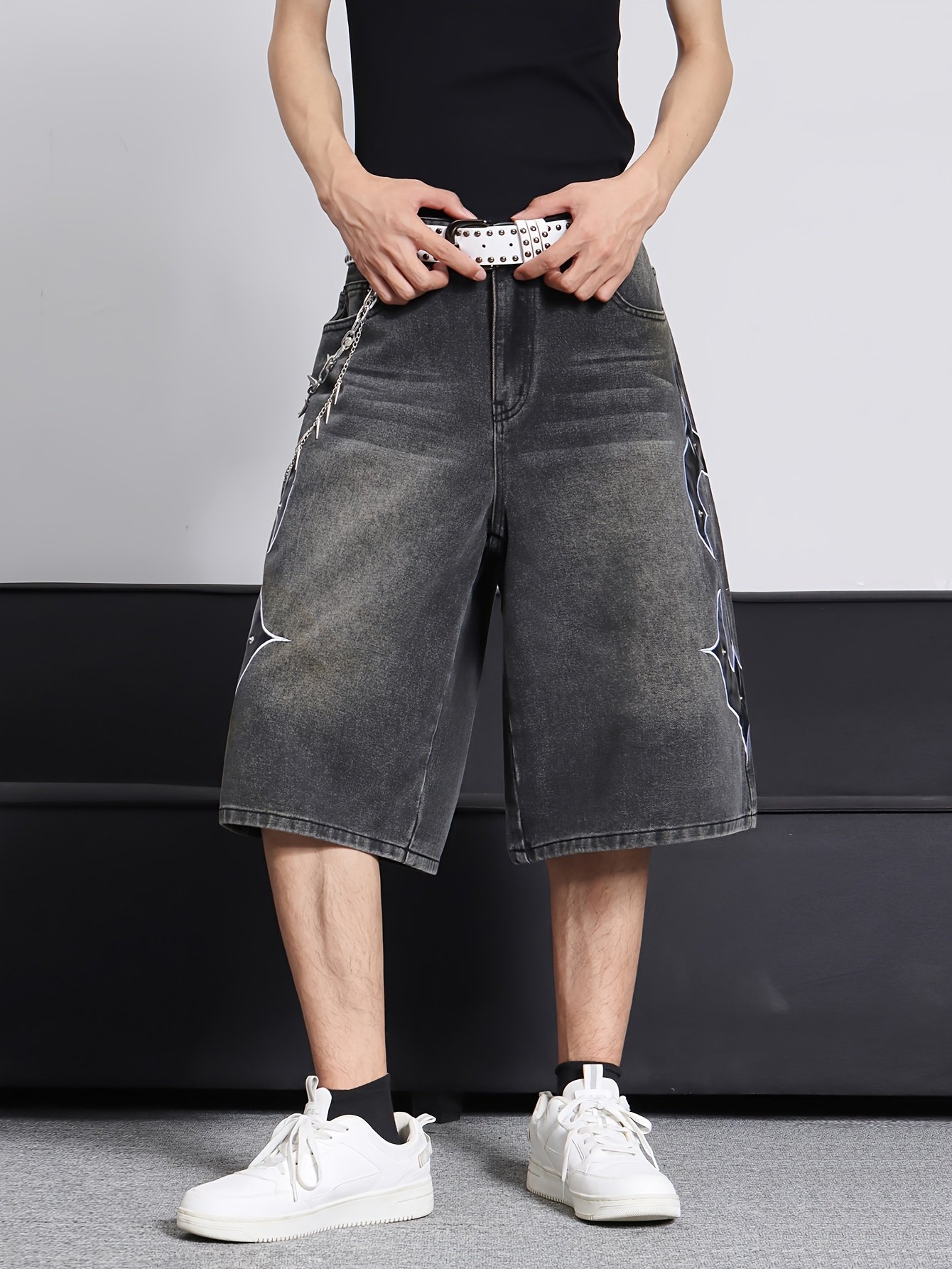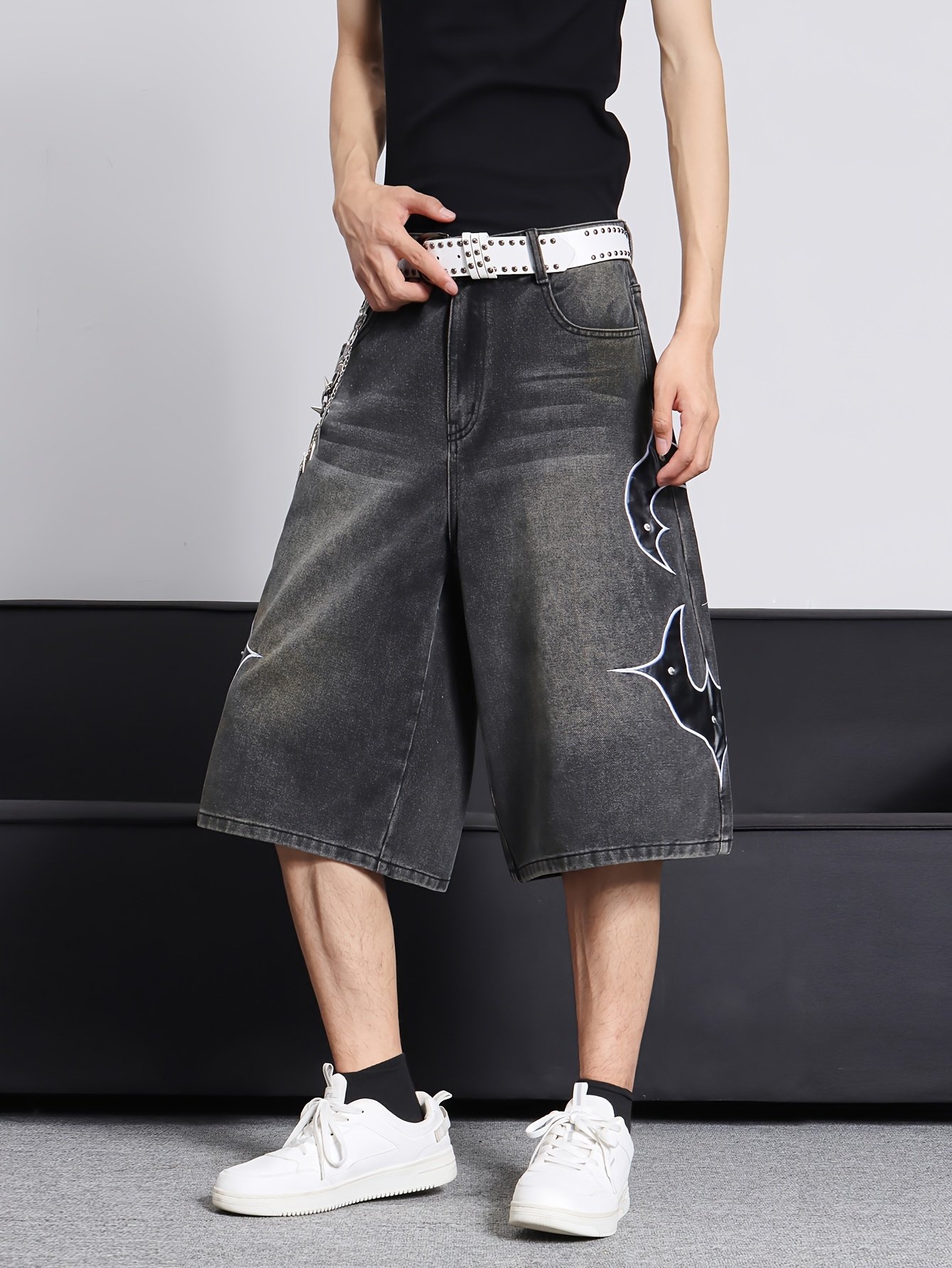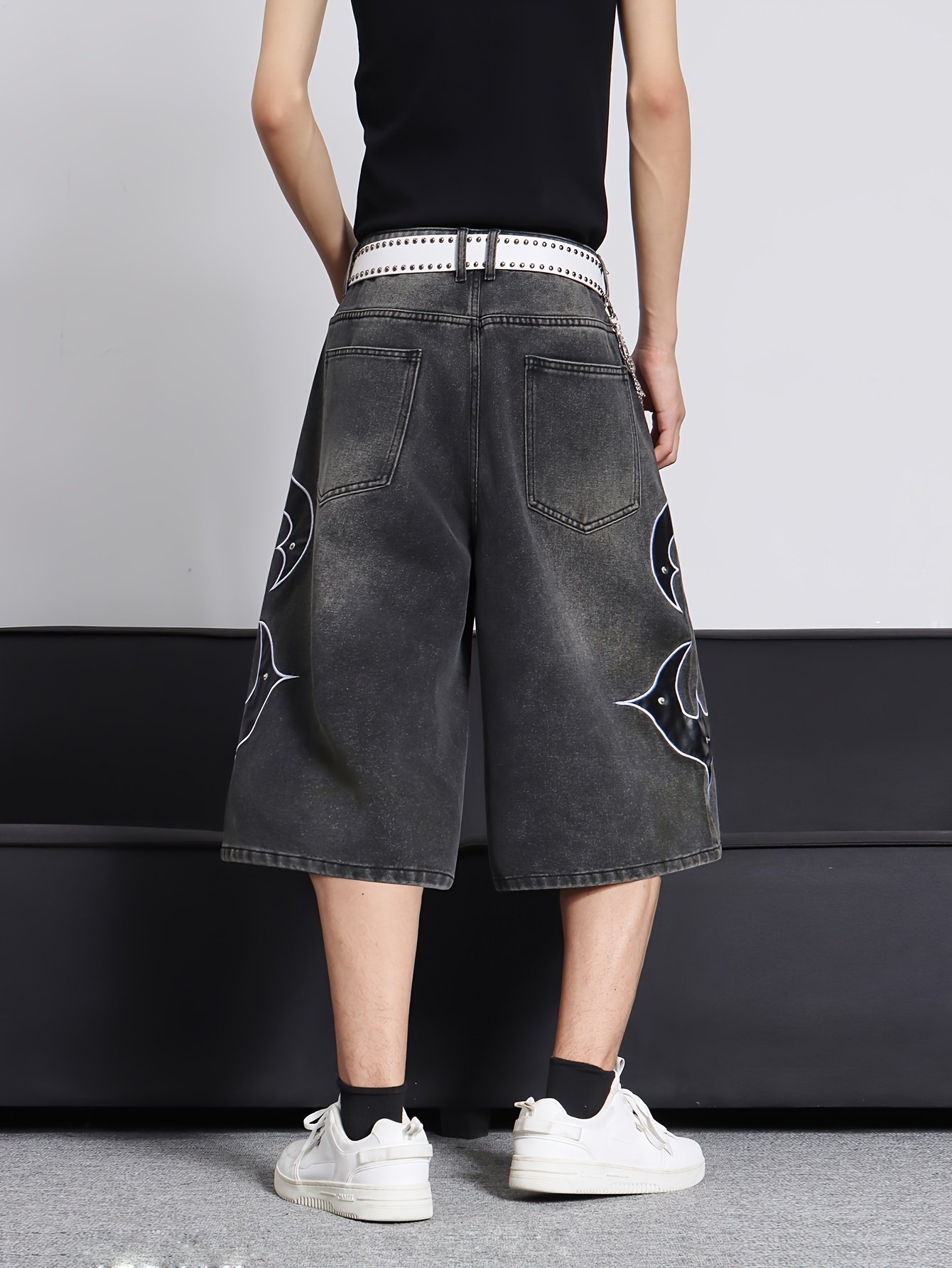 Men's High-Waisted 7/8 Length Denim Shorts – Relaxed Fit Fringe Hem & Geometric Appliqué Design, Mid-Rise Casual Streetwear Shorts with Stitching Details, Machine Washable Loose-Fit Jeans for Casual Attire