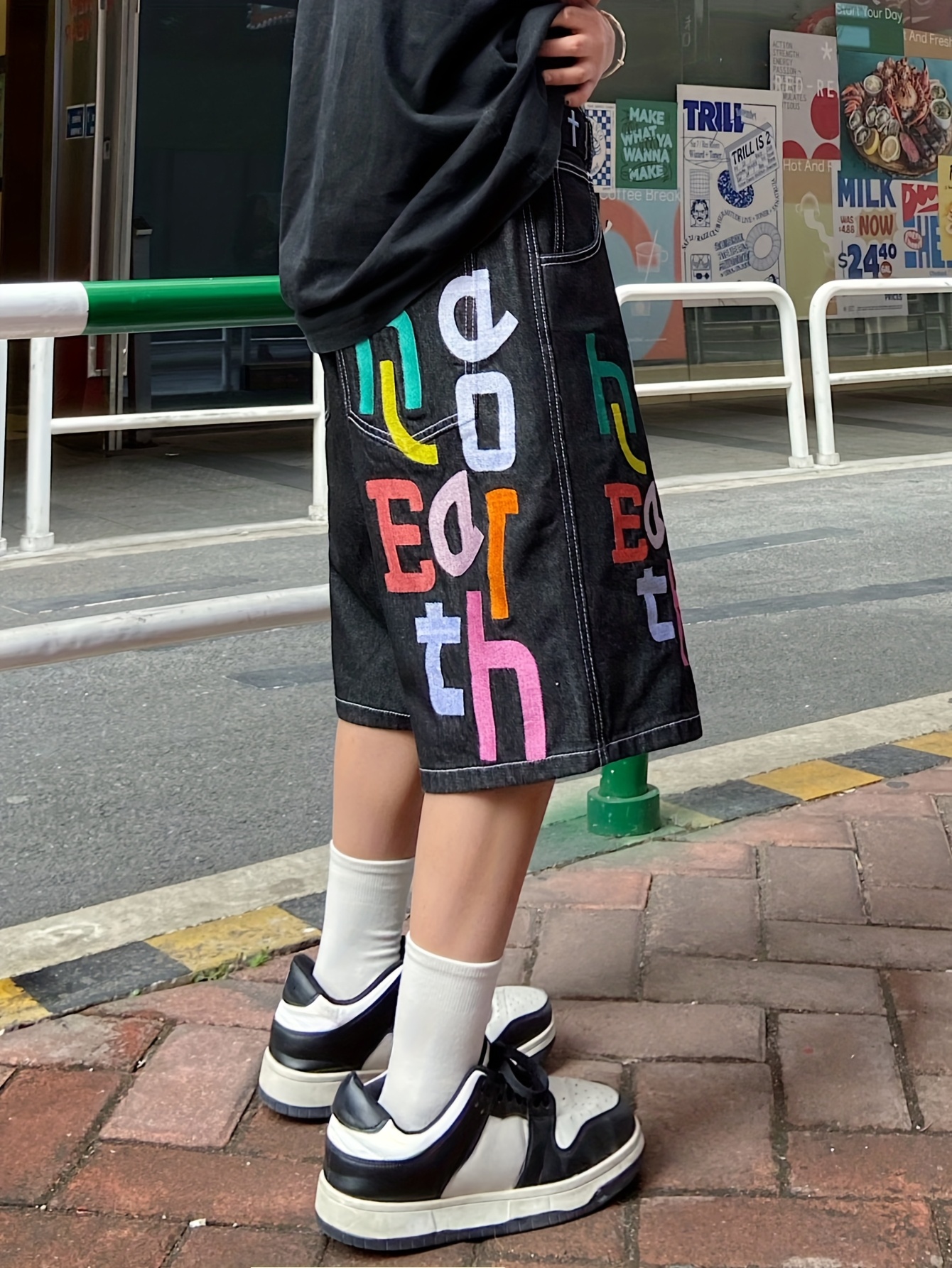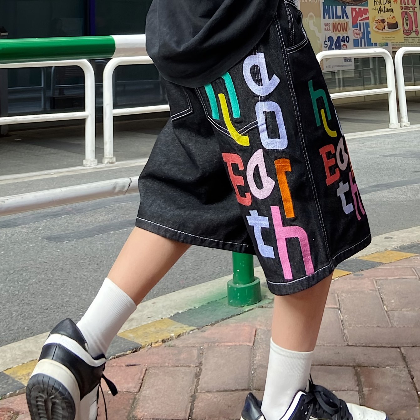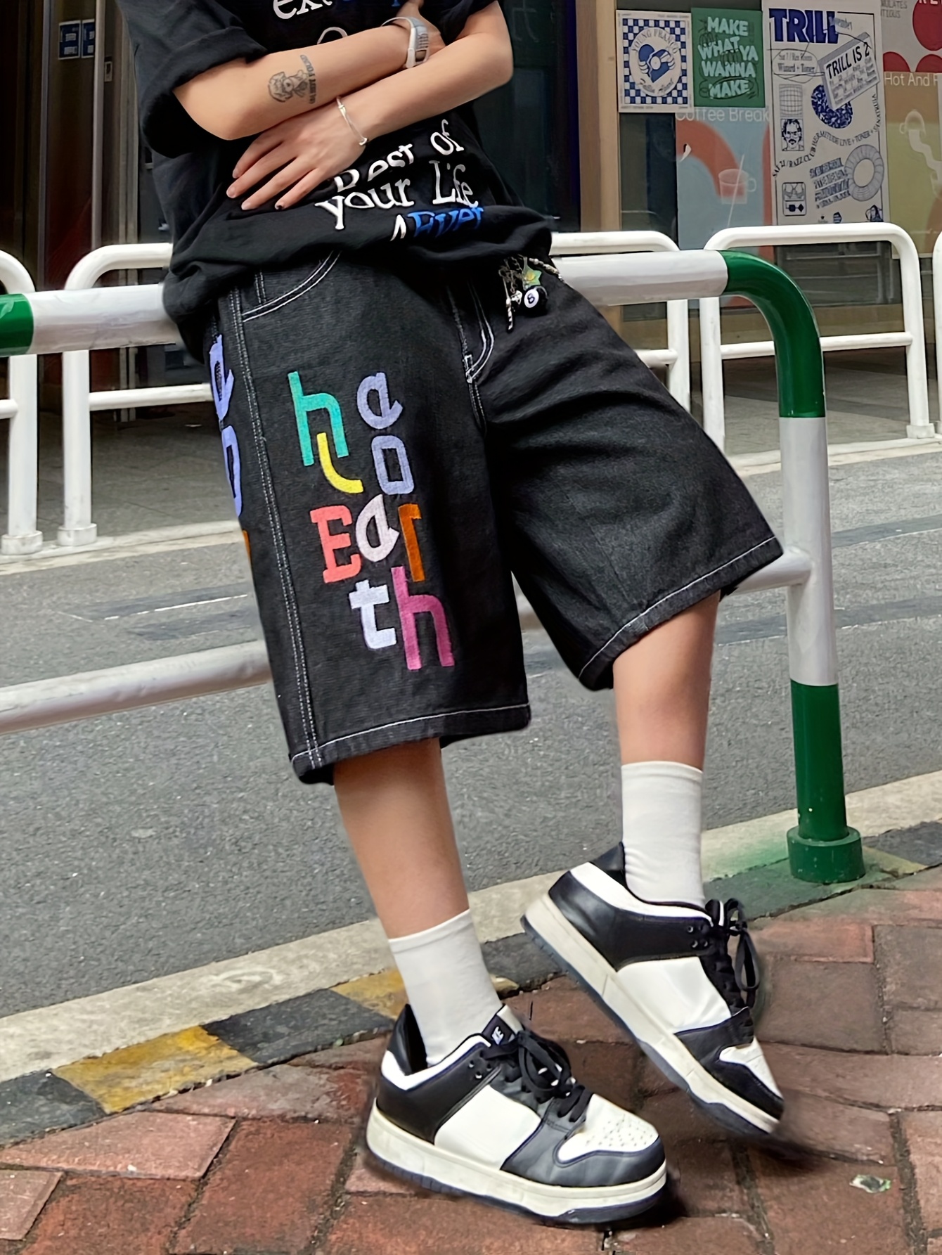 Men's Loose Fit Knee-Length Denim Shorts – Casual Street Style with "e;HEALTH"e; Print, Machine Washable, No Stretch, Black Color, Perfect for Summer Outfits, Jean Shorts