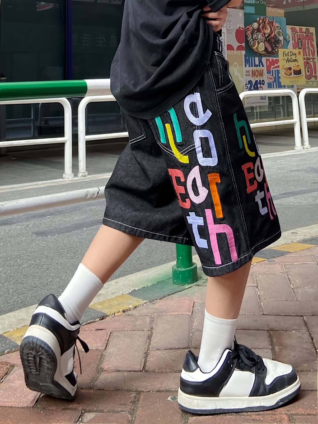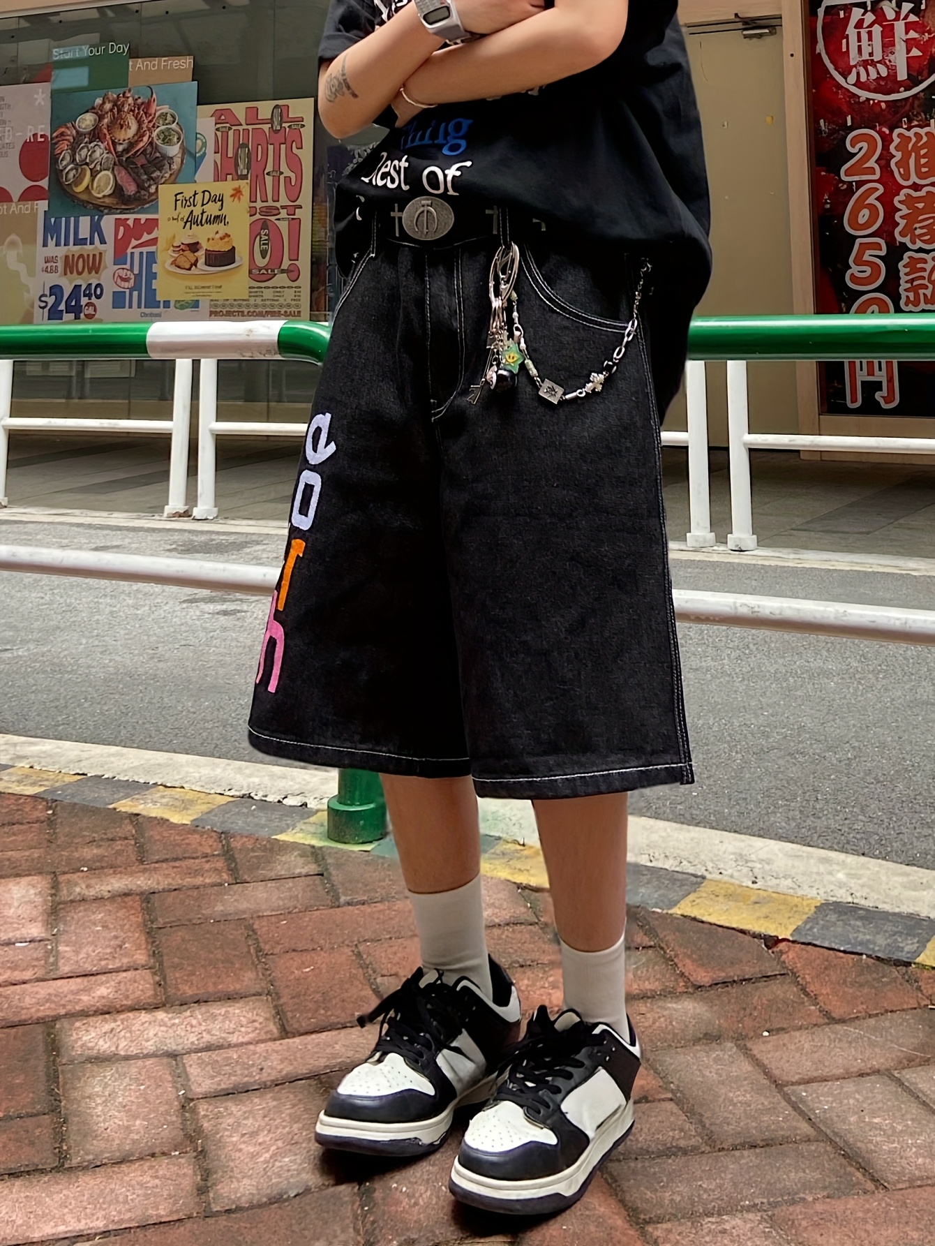 Men'S Black Denim Shorts with Embroidered Skull Logo – Streetwear Style Loose Fit Wide-Leg Pants, Casual Jean Shorts for Casual Attire, Casual Wear Shorts | Embroidered Shorts | Nonstretch Fabric