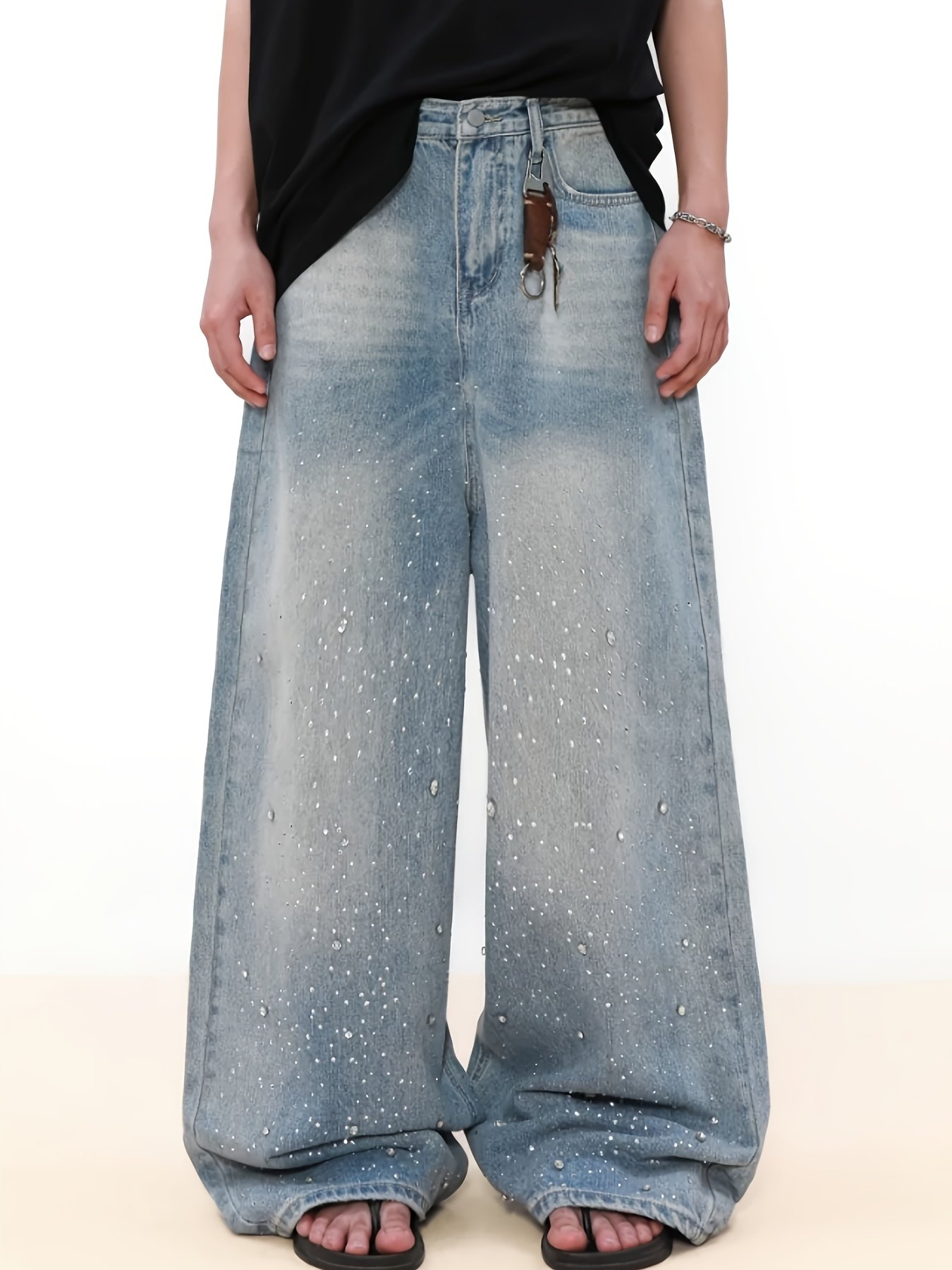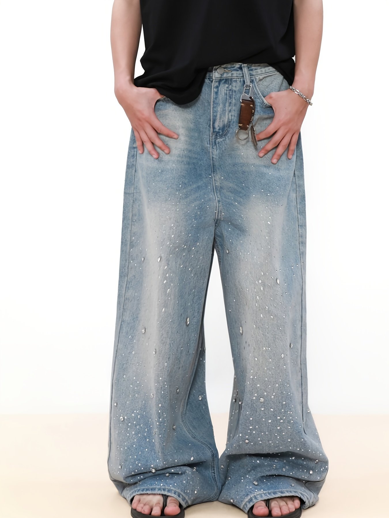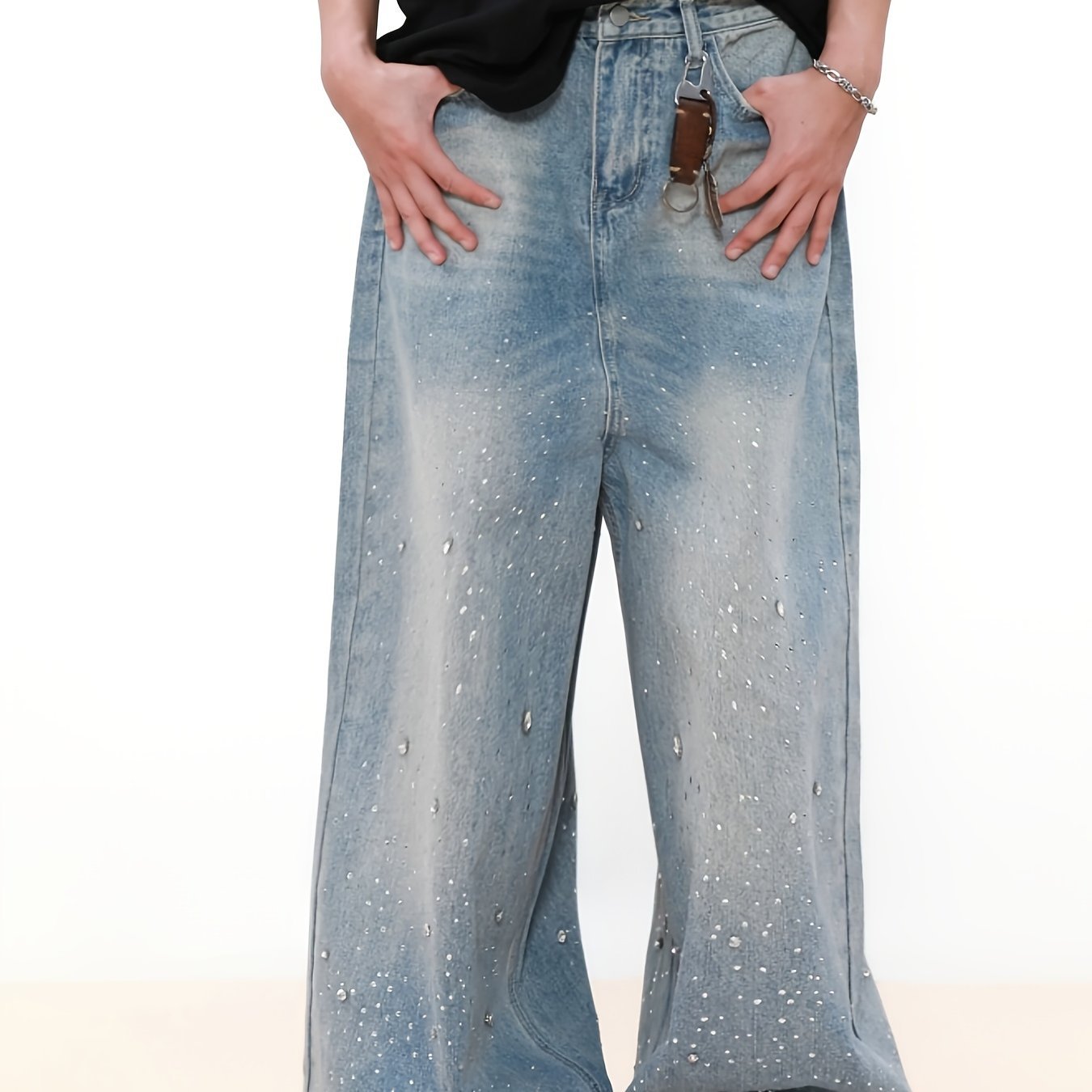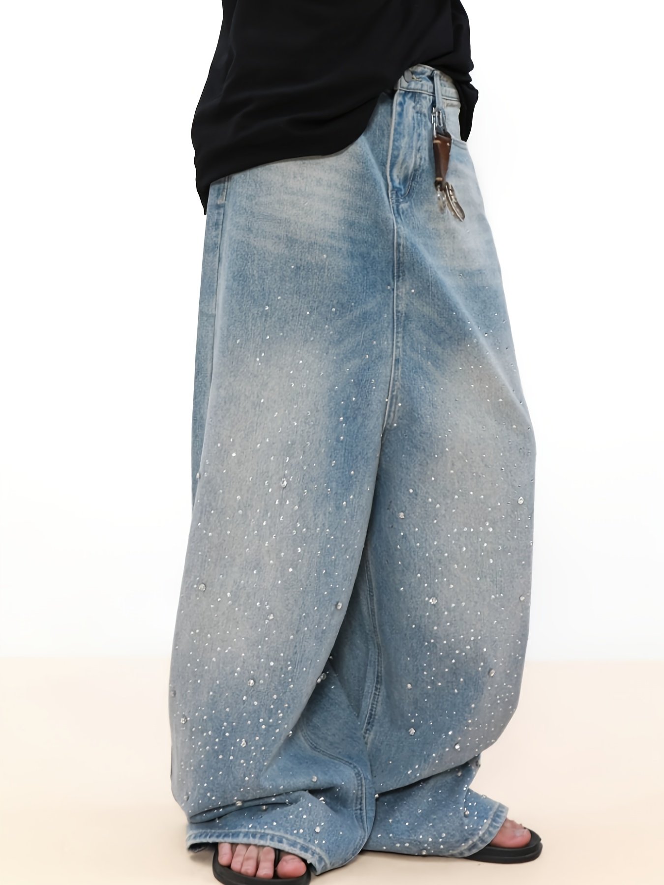 Men's Loose Wide-Leg Jeans Unisex Boyfriend Skateboard Y2K Rhinestone Denim Pants, High Stretch Jeans For Men, Mens Plus Size Jeans, Cool Jeans, Fashion Jeans For Men, Pants Jeans, Casual Wear, Unisex Clothing, Loose Fit, Rhinestone Detailing, Durable Fab