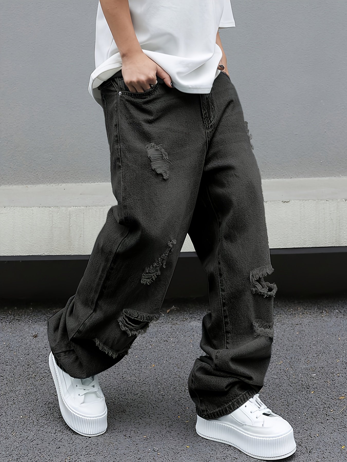 Men's Gothic Light Gray Distressed Denim Jeans – Oversized Loose-Fit Straight-Leg Tapered Hem with Zipper Closure, All-Season Casual Streetwear Pants for Hip-Hop, Gothic & Casual Attire – Machine Washable Vintage Style Light Gray to Black Gradient – Rel