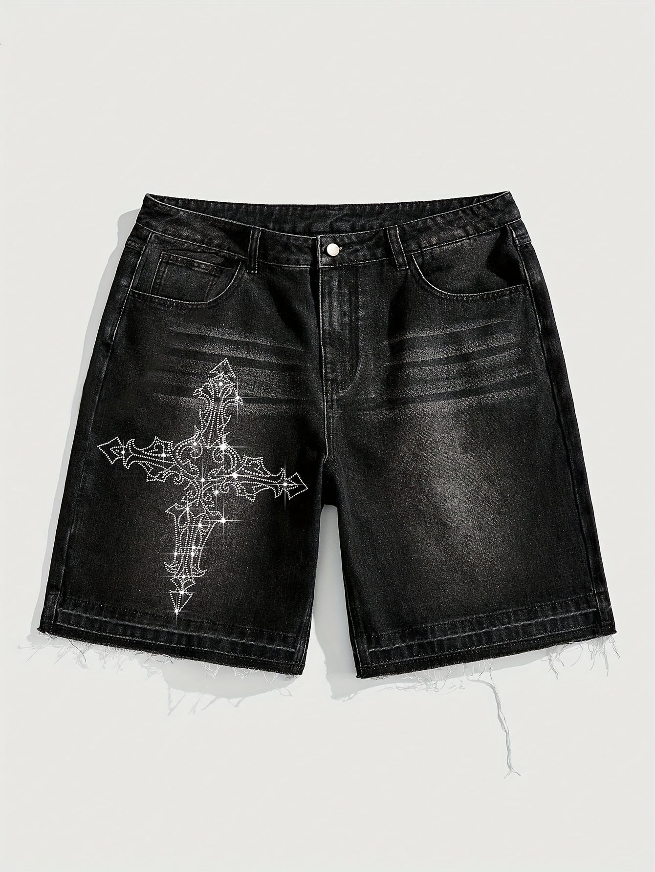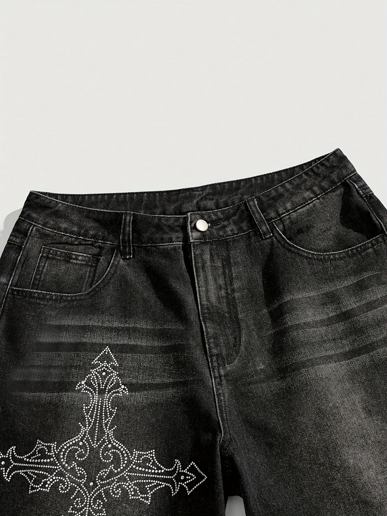 Men's Non-Stretch Jeans-like Pants – Heavy-Duty Formal Casual Black Mid-Thickness with Knee-Length, Machine Washable Loose Fit for Everyday & Special Occasions, Straight Leg Jeans, Knee-Length Shorts, Durable Fabric, Embellished Denim