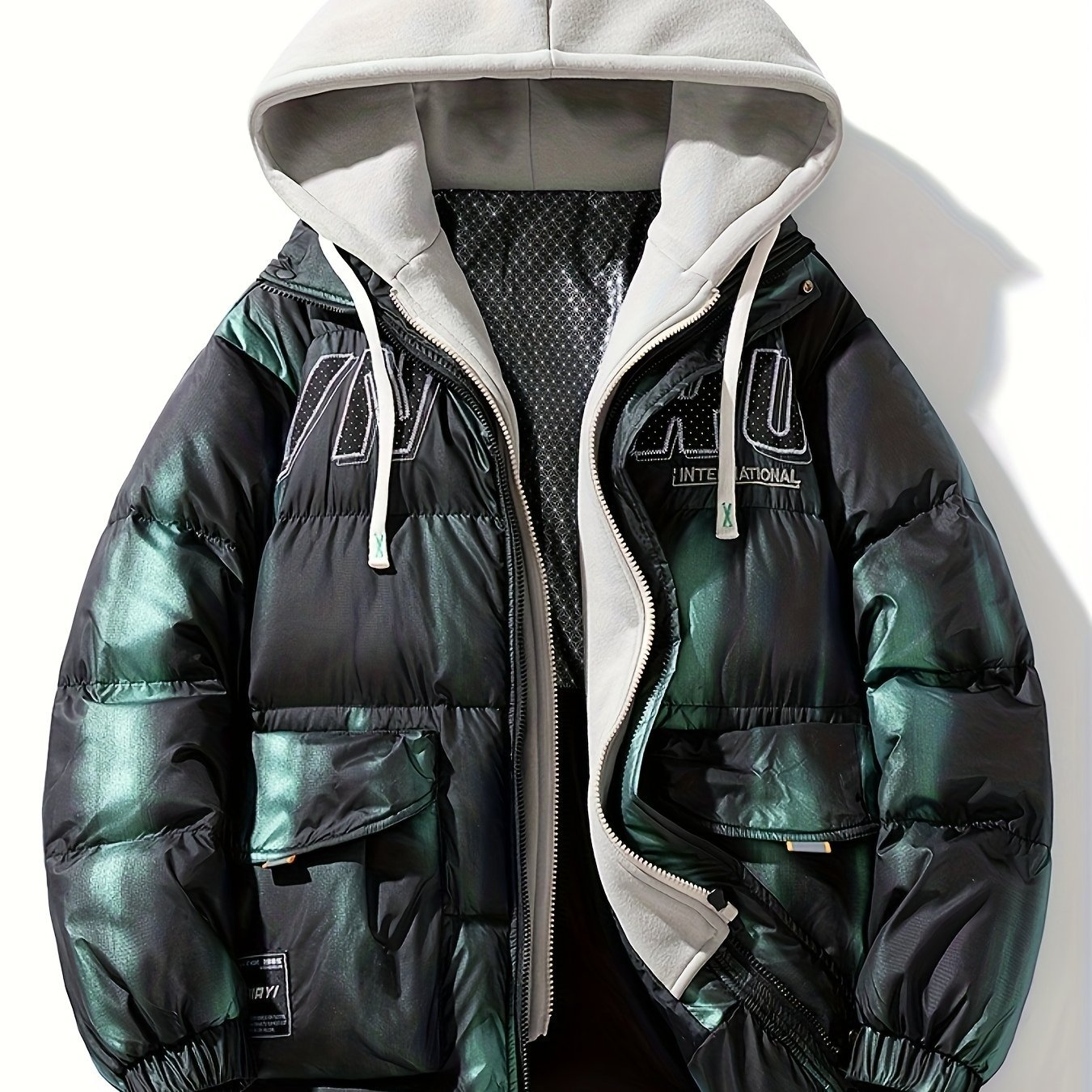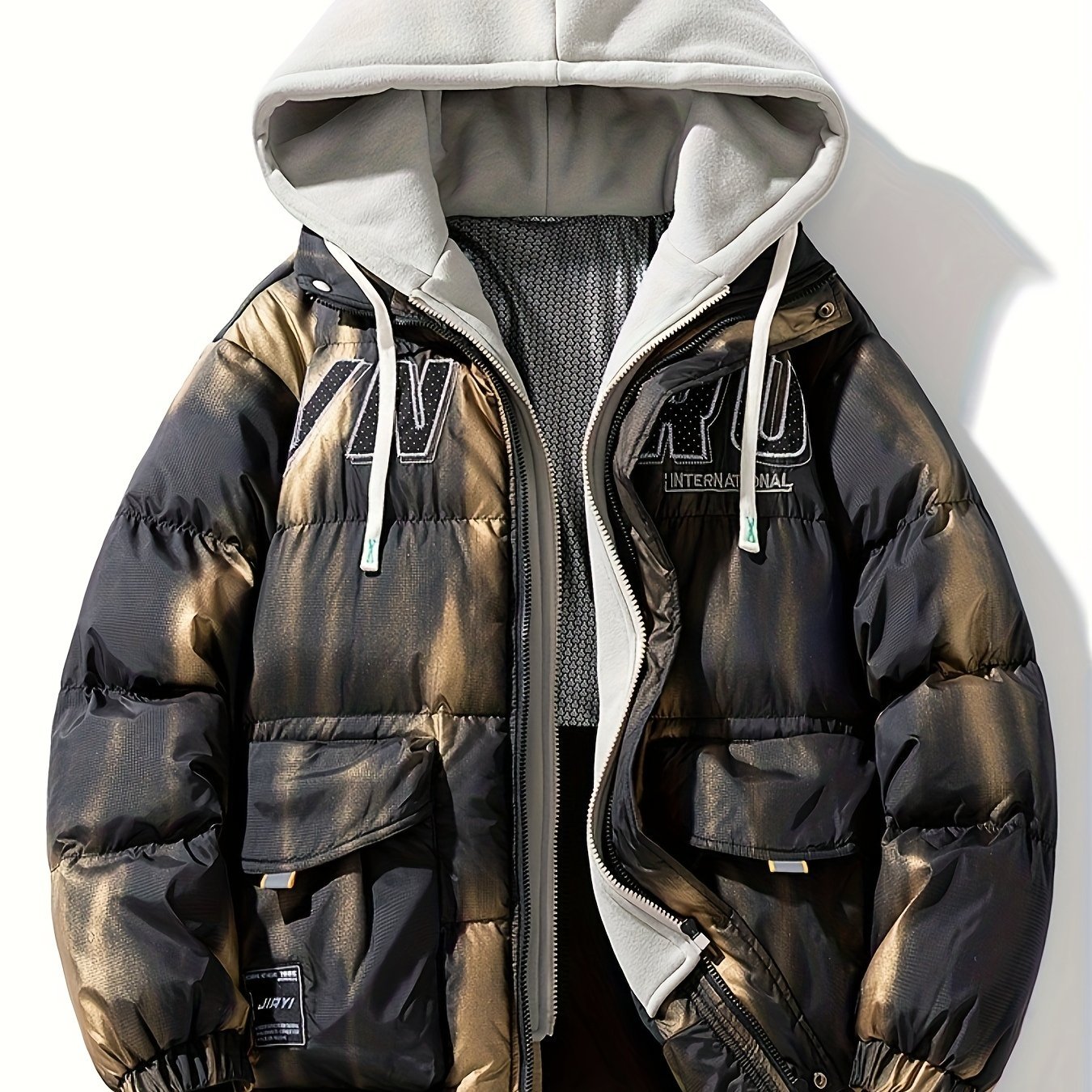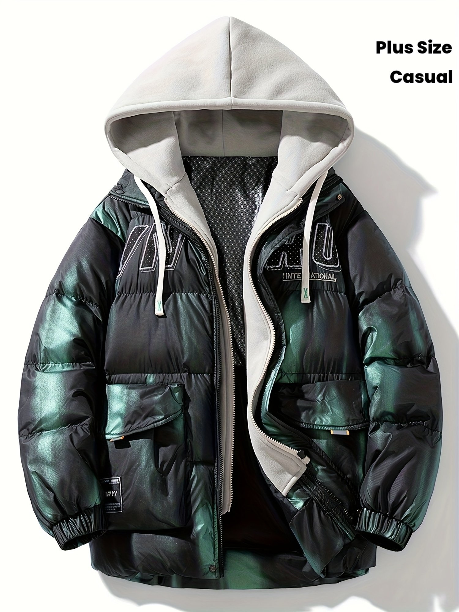 Men's Plus Size Jacket with Letter Embroidery, Hooded -Lined Thickened Trend Casual Loose Outdoor Sports Coat in Gradient Color, PLUS SIZE