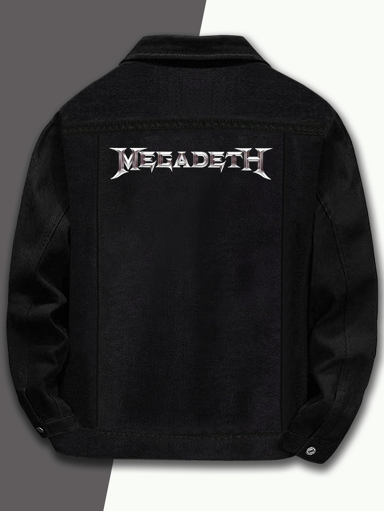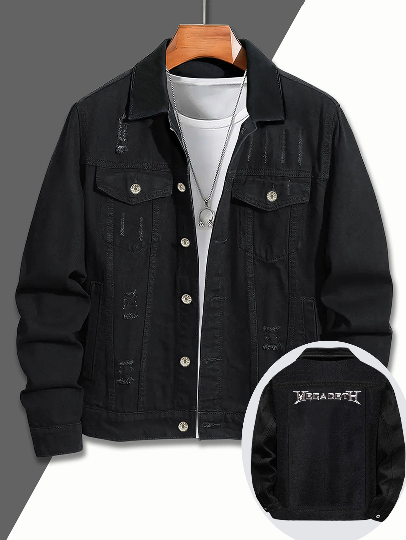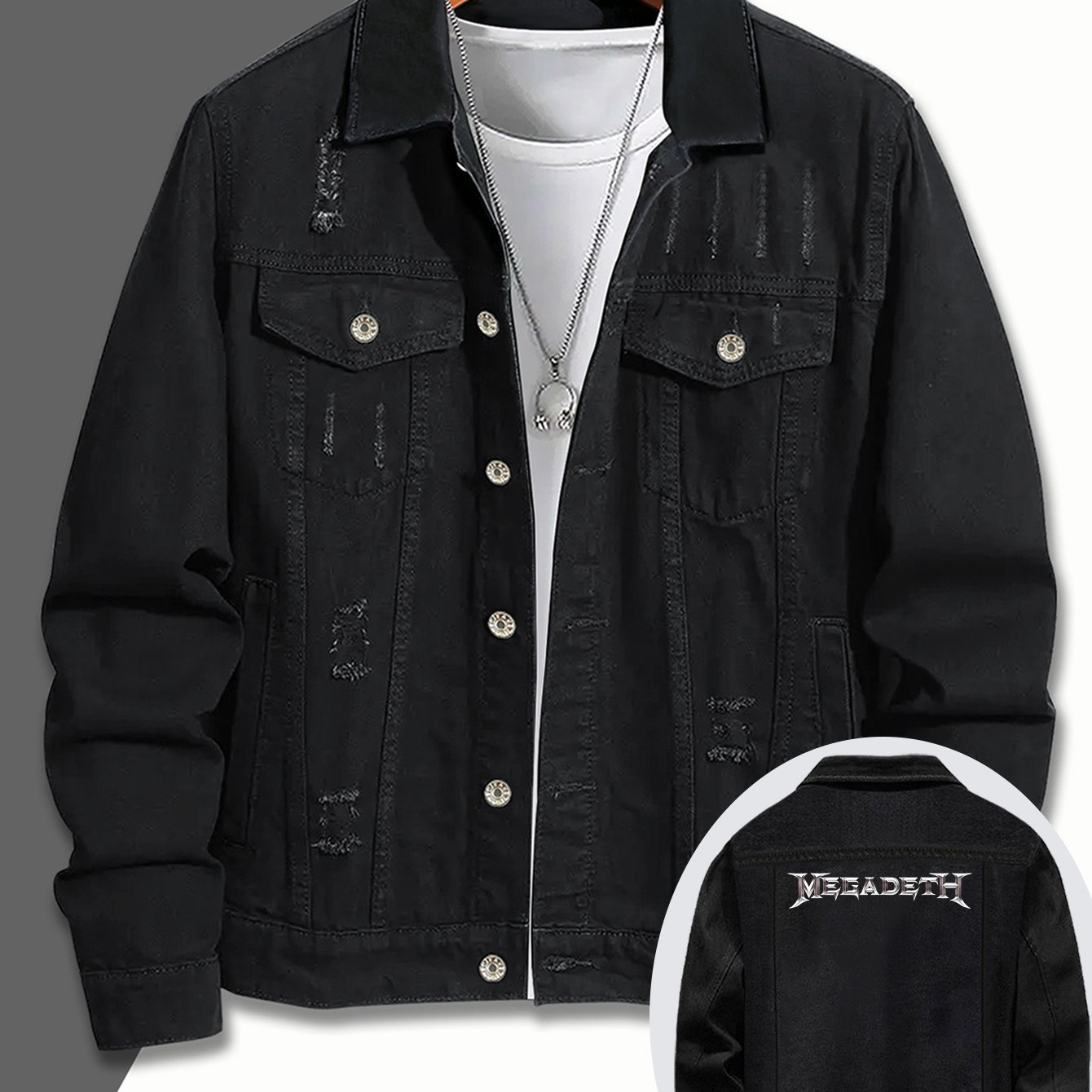 Men's Slim-Fit Ripped Denim Jacket with Megadeth Logo Print – Vintage Streetwear Button-Front Coat, Collar & Belt-Free Closure for Spring/Fall Machine Washable – Iconic Logo Jacket for Fans