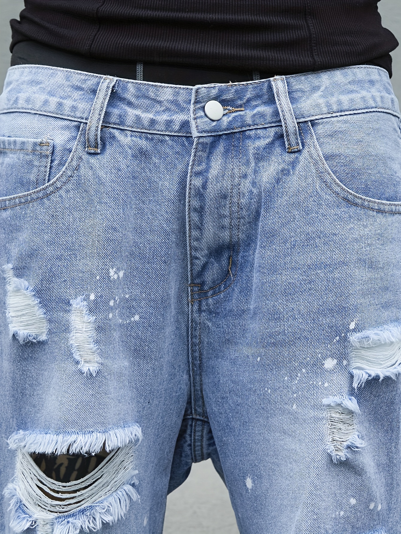 American High Street Distressed Washed Ripped Loose Shorts, Colorful Design Wide Leg Mid-Length Pants, Unisex No Belt/No Hanging Ornament