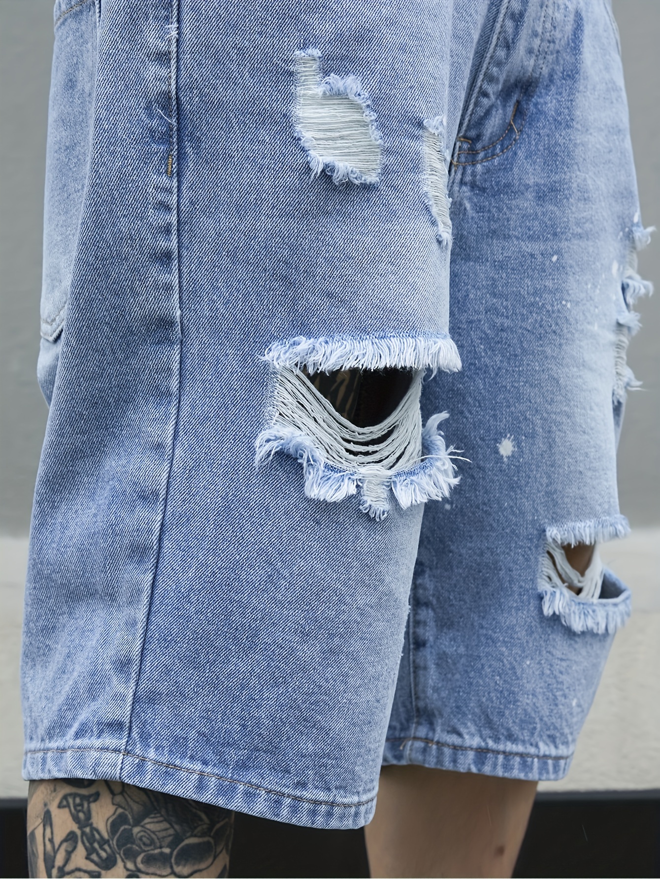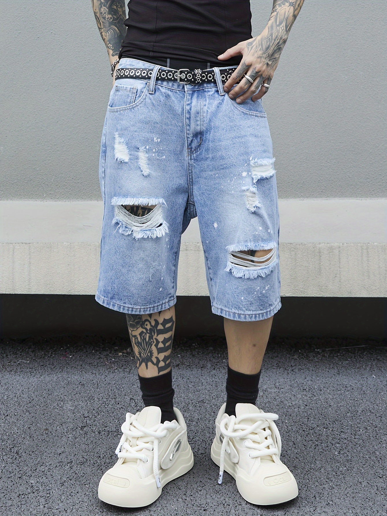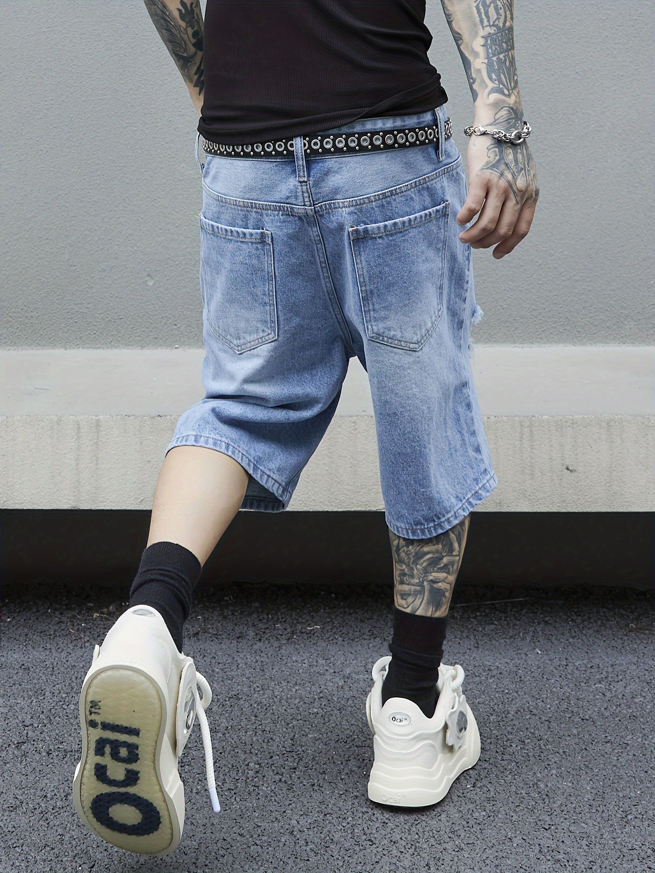 Men's American Streetwear Distressed Knee-Length Denim Shorts – Relaxed Fit Mid-Rise Casual Shorts with Pockets, Machine Washable for Casual Attire