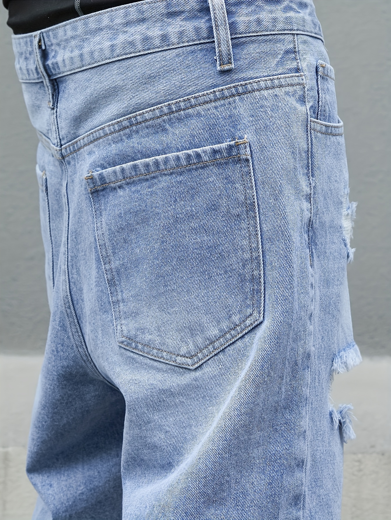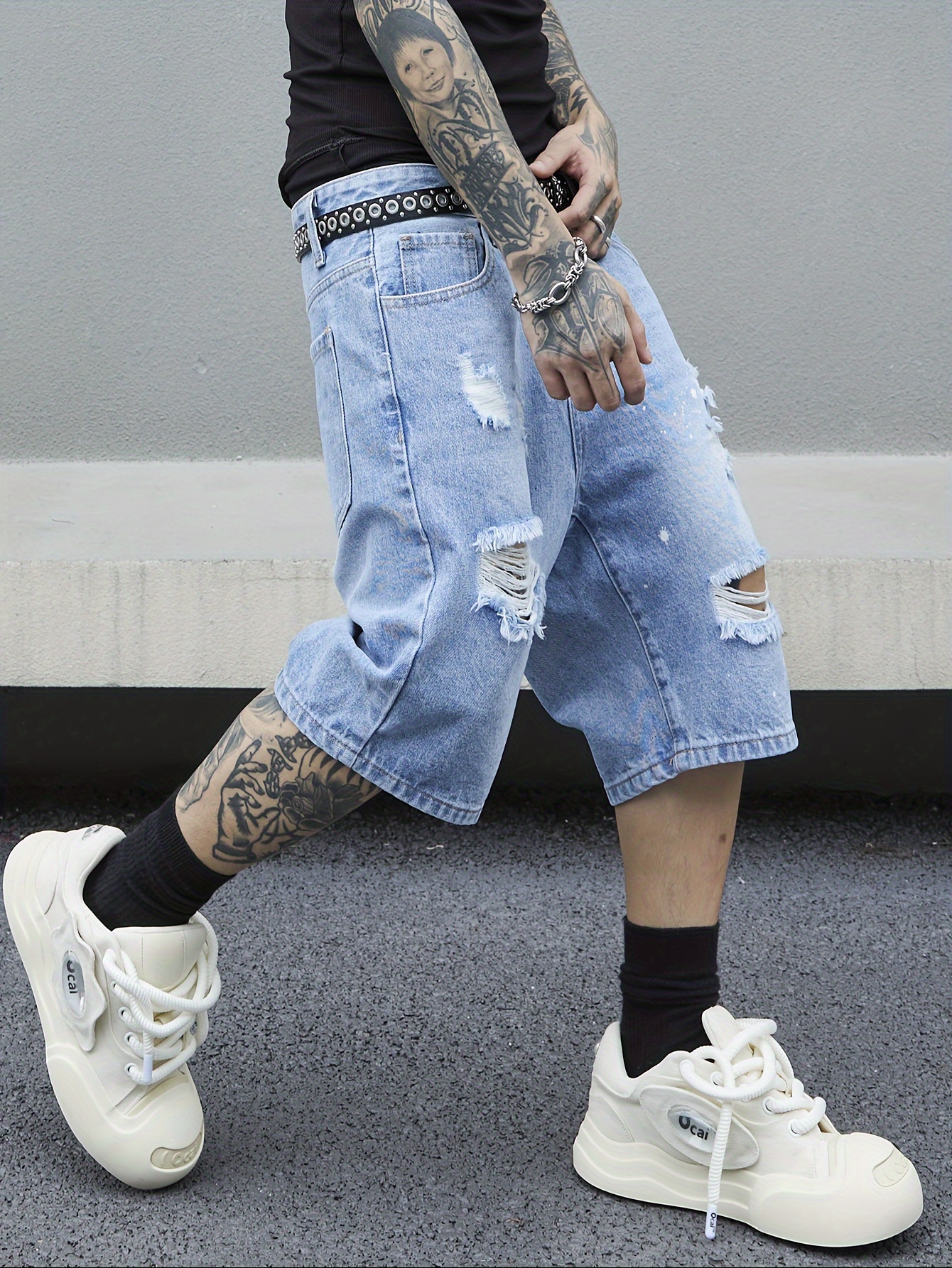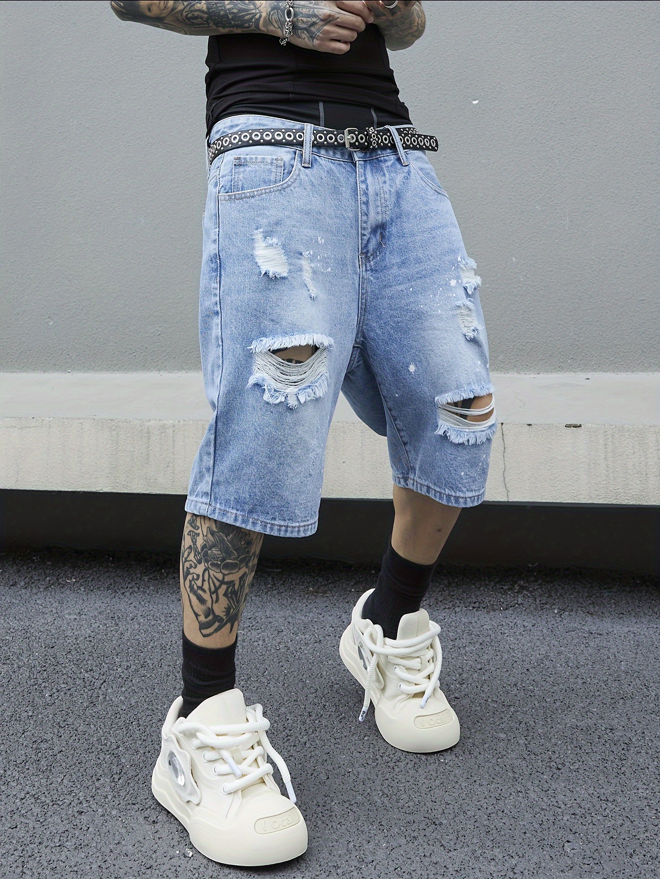 Men's American Streetwear Distressed Knee-Length Denim Shorts – Relaxed Fit Mid-Rise Casual Shorts with Pockets, Machine Washable for Casual Attire
