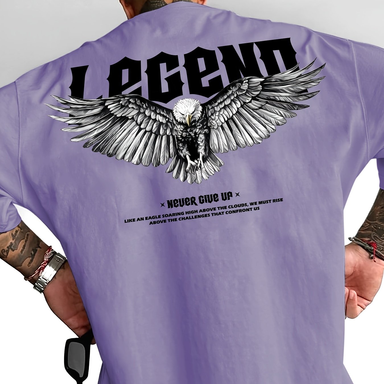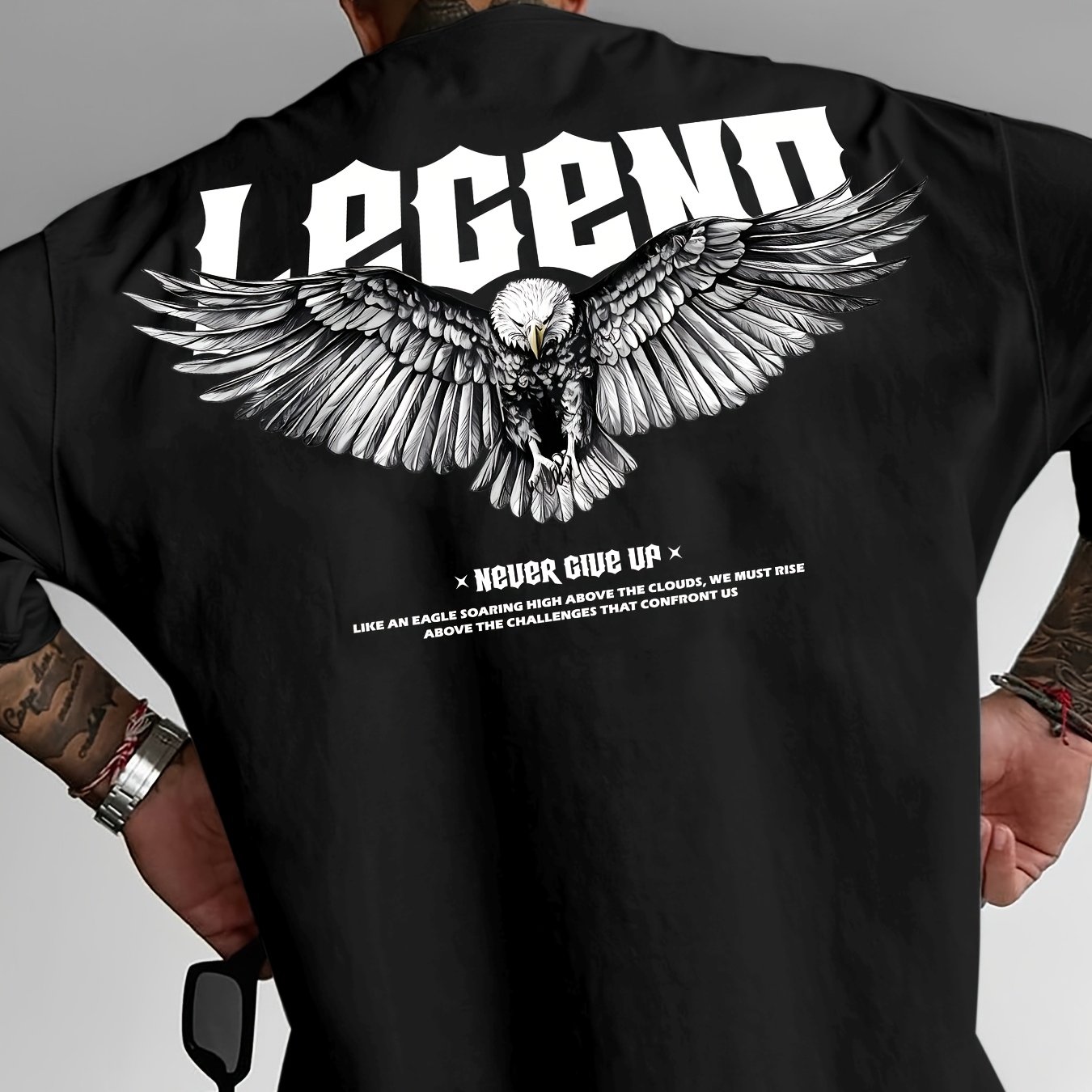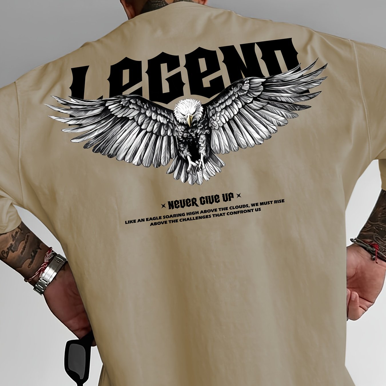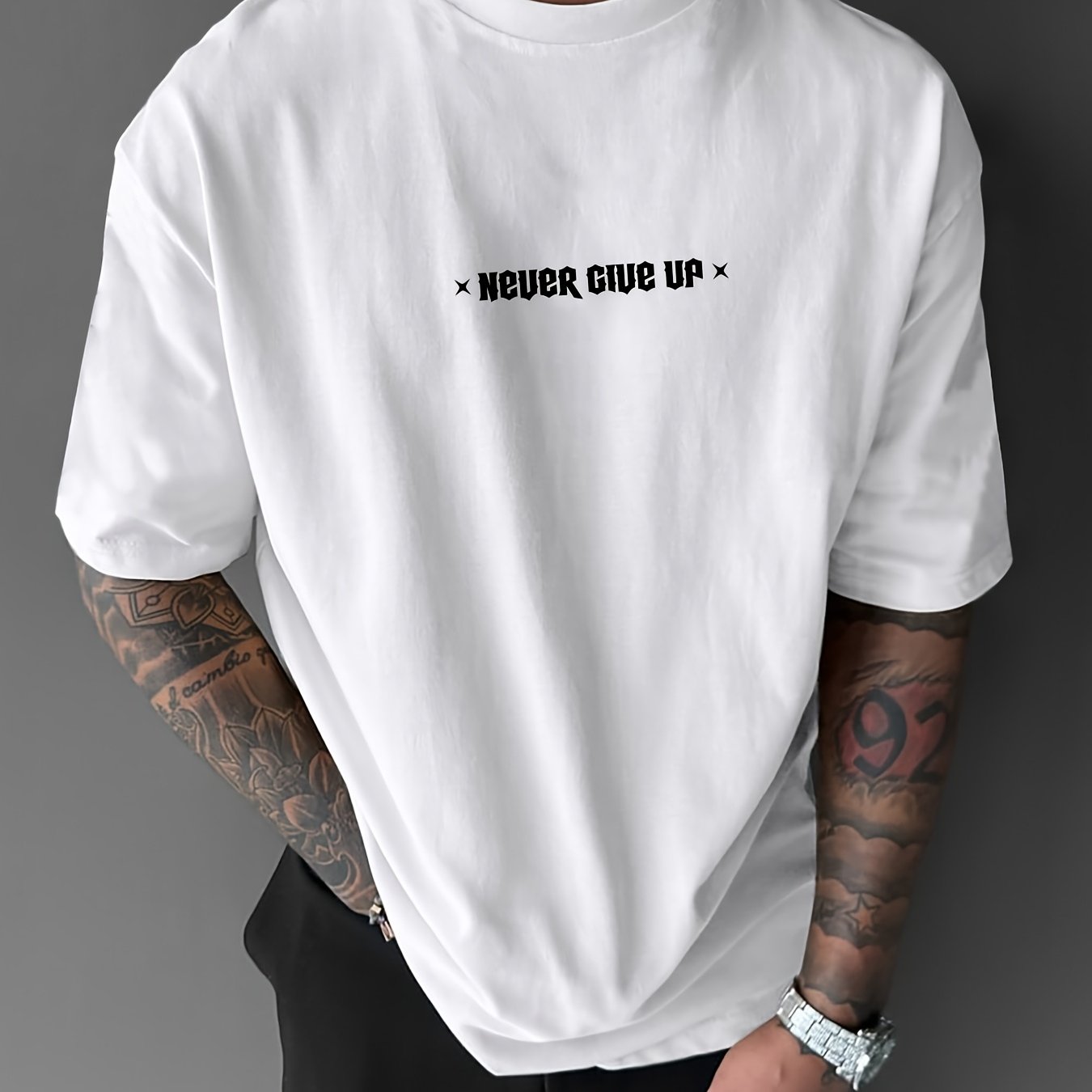 Men's Streetwear Graphic T-Shirt – "e;Never Give Up"e; Motivational Print with Wing & Skull Design, Loose Fit Casual Short Sleeve, Light Beige Summer Top, Machine Washable, Motivational Wear | Graphic Back Tshirt | Durable Casualwear