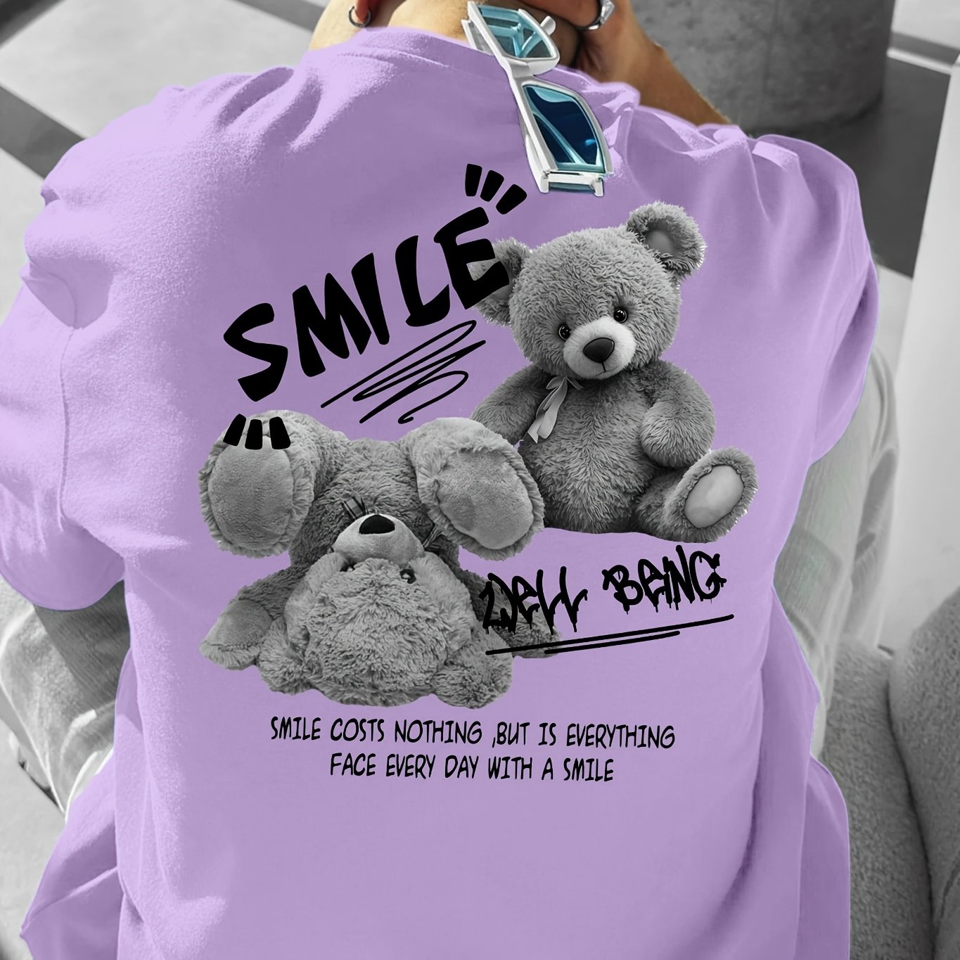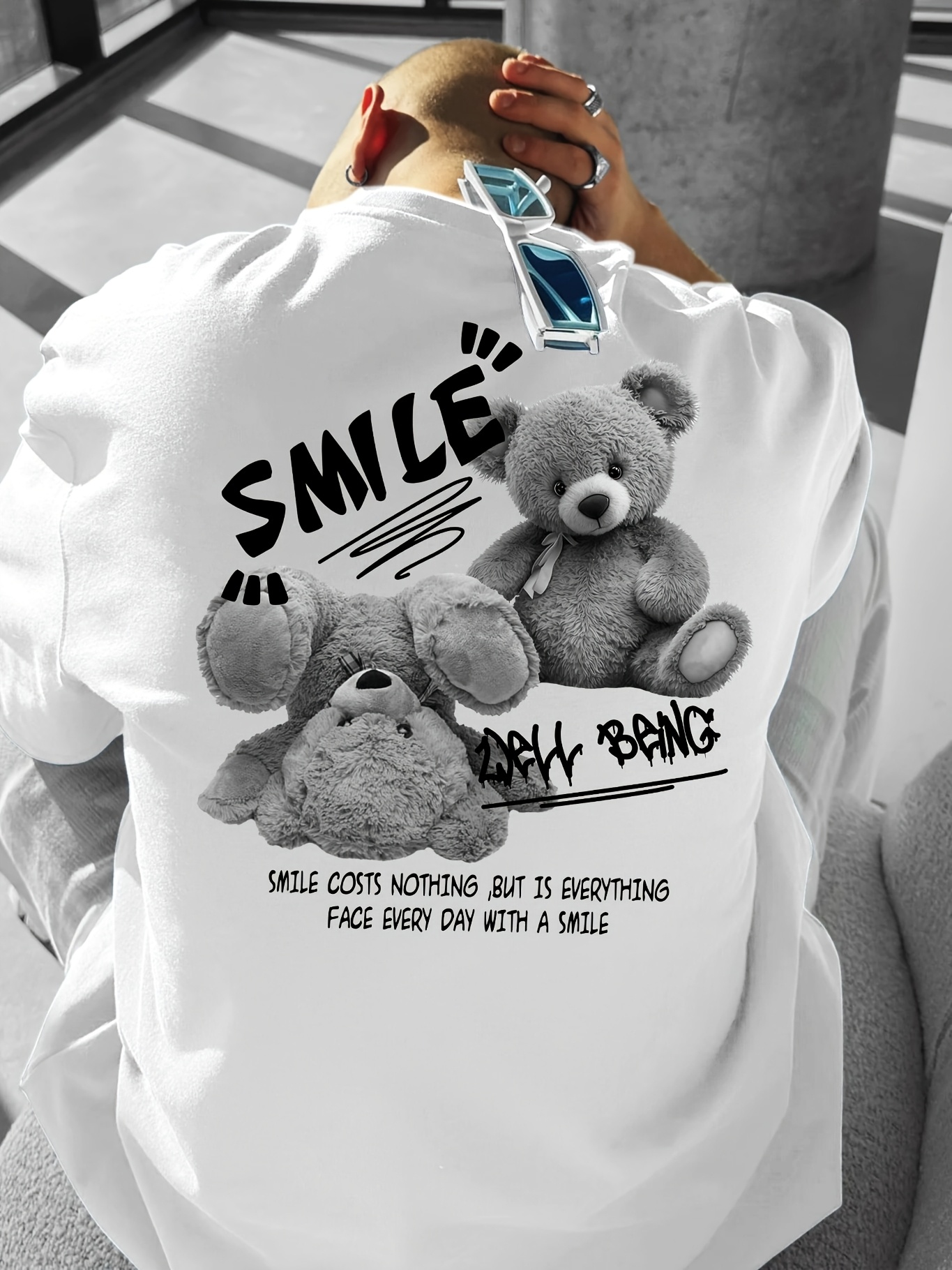 Men's Streetwear Graphic T-Shirt with Smile & Teddy Bear Design, Loose Fit Round Neck Summer Casual Tee, Machine Washable White Shirt for Adults, Everyday Comfort, Breathable Fabric