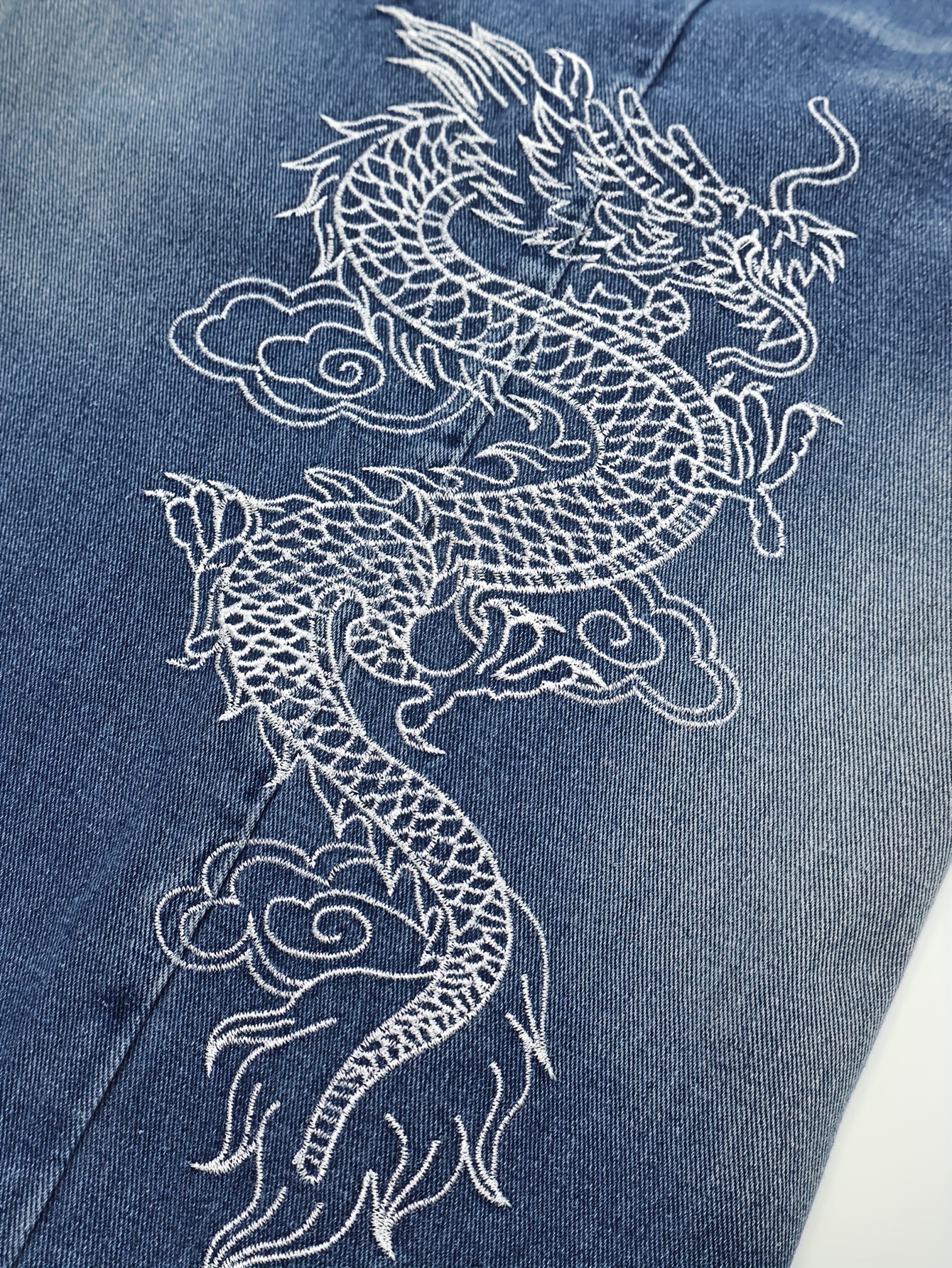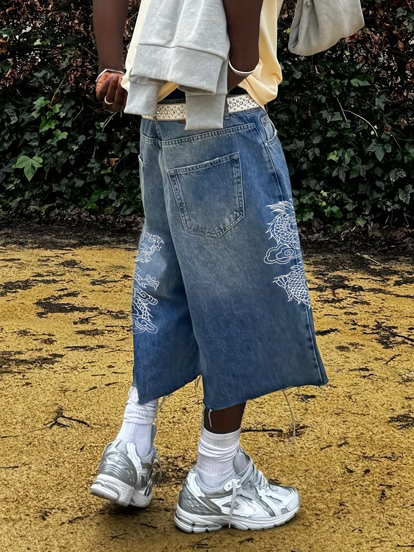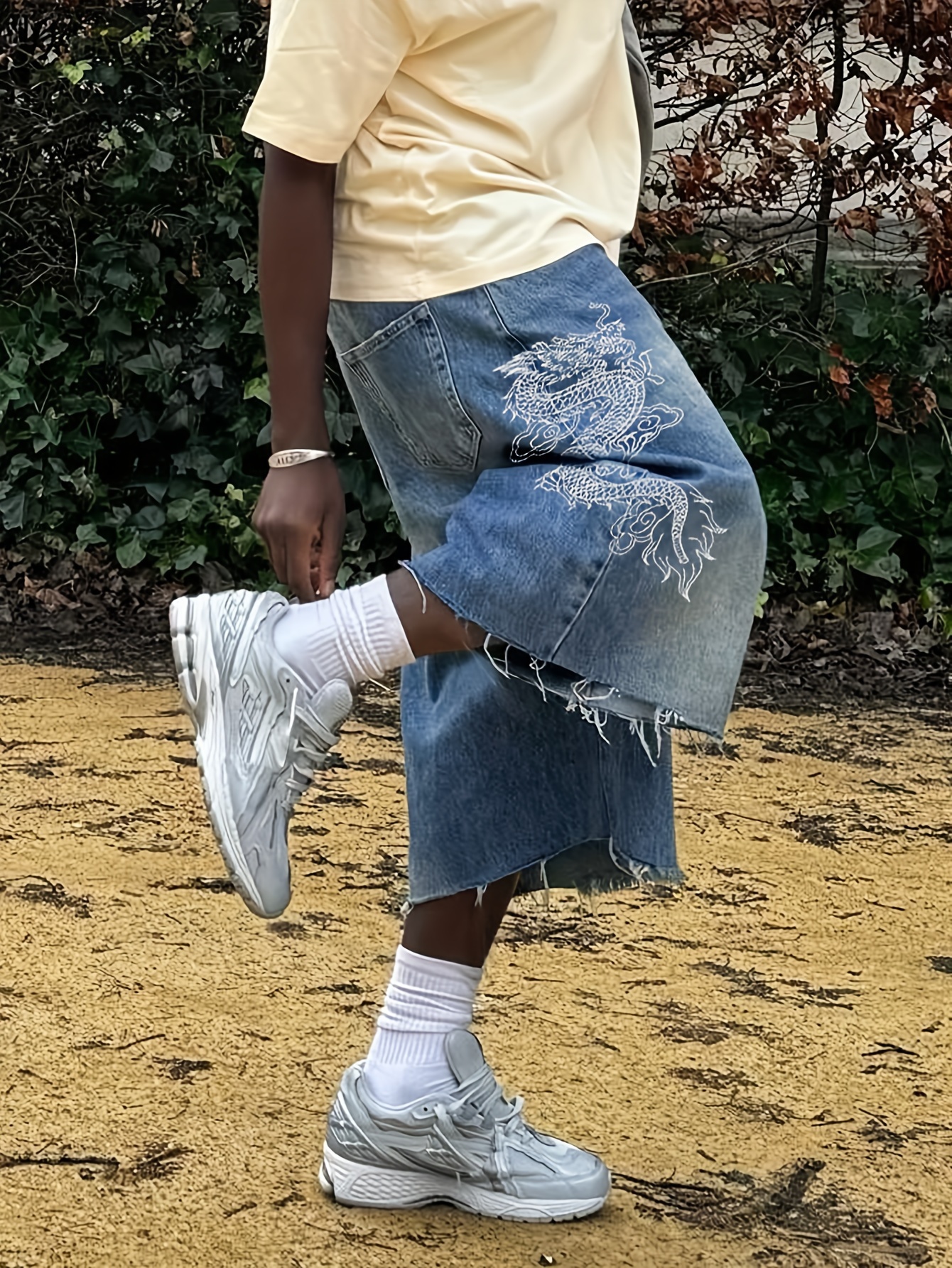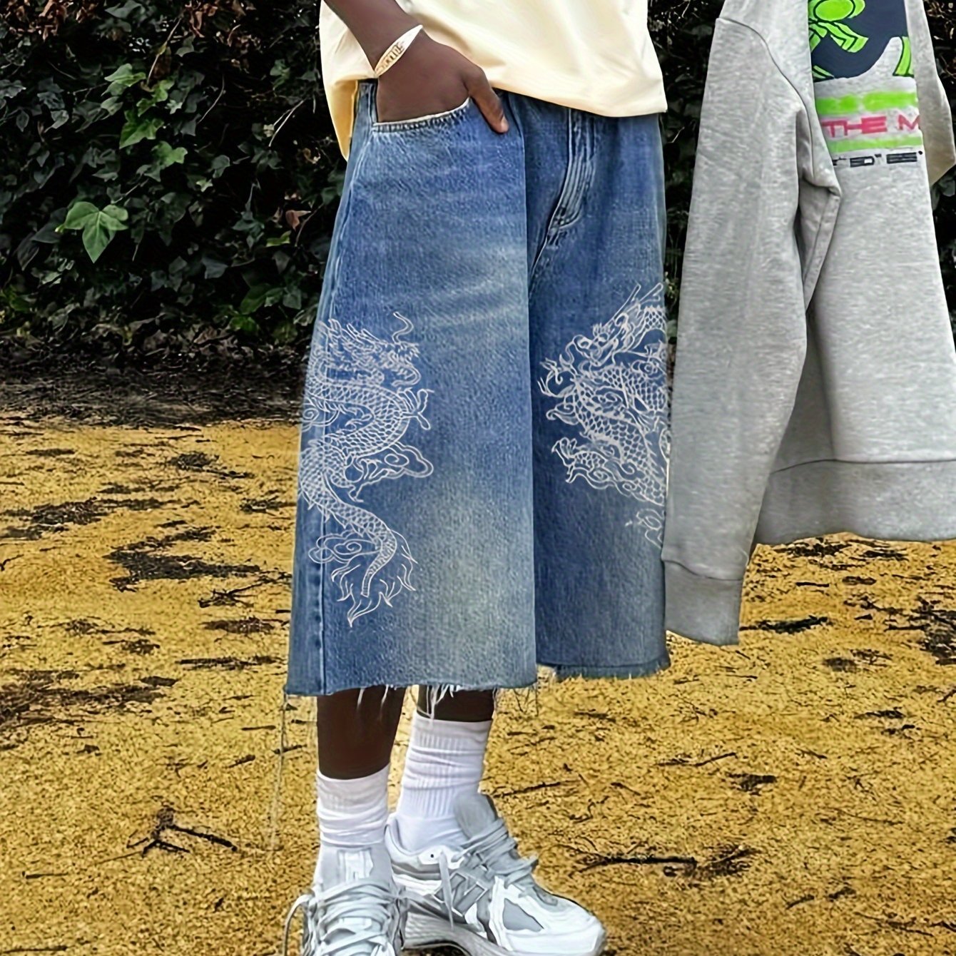 Men'S Streetwear Loose Fit Mid-Waist Denim Shorts with Dragon Embroidery, Knee-Length Casual Pants, Non-Stretch Fabric, White Socks & Sneakers, Everyday Denim Shorts | Streetwear Style | Nonstretch Denim