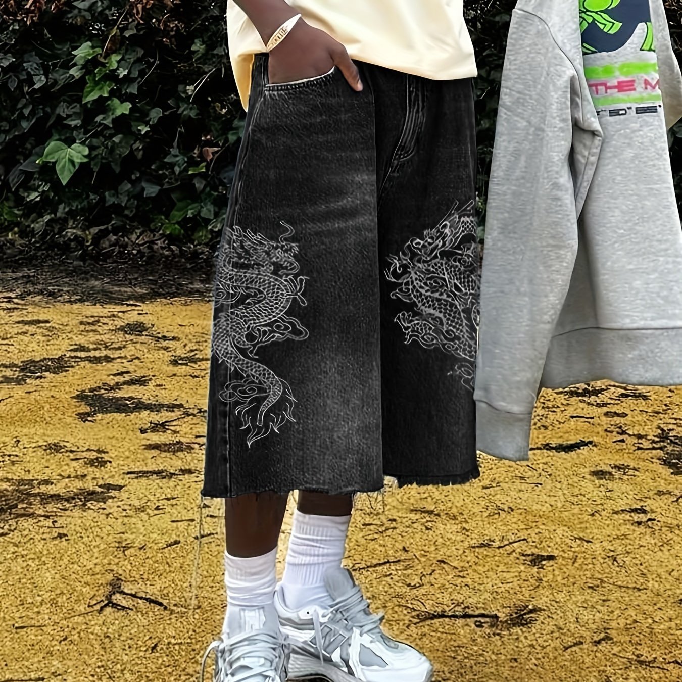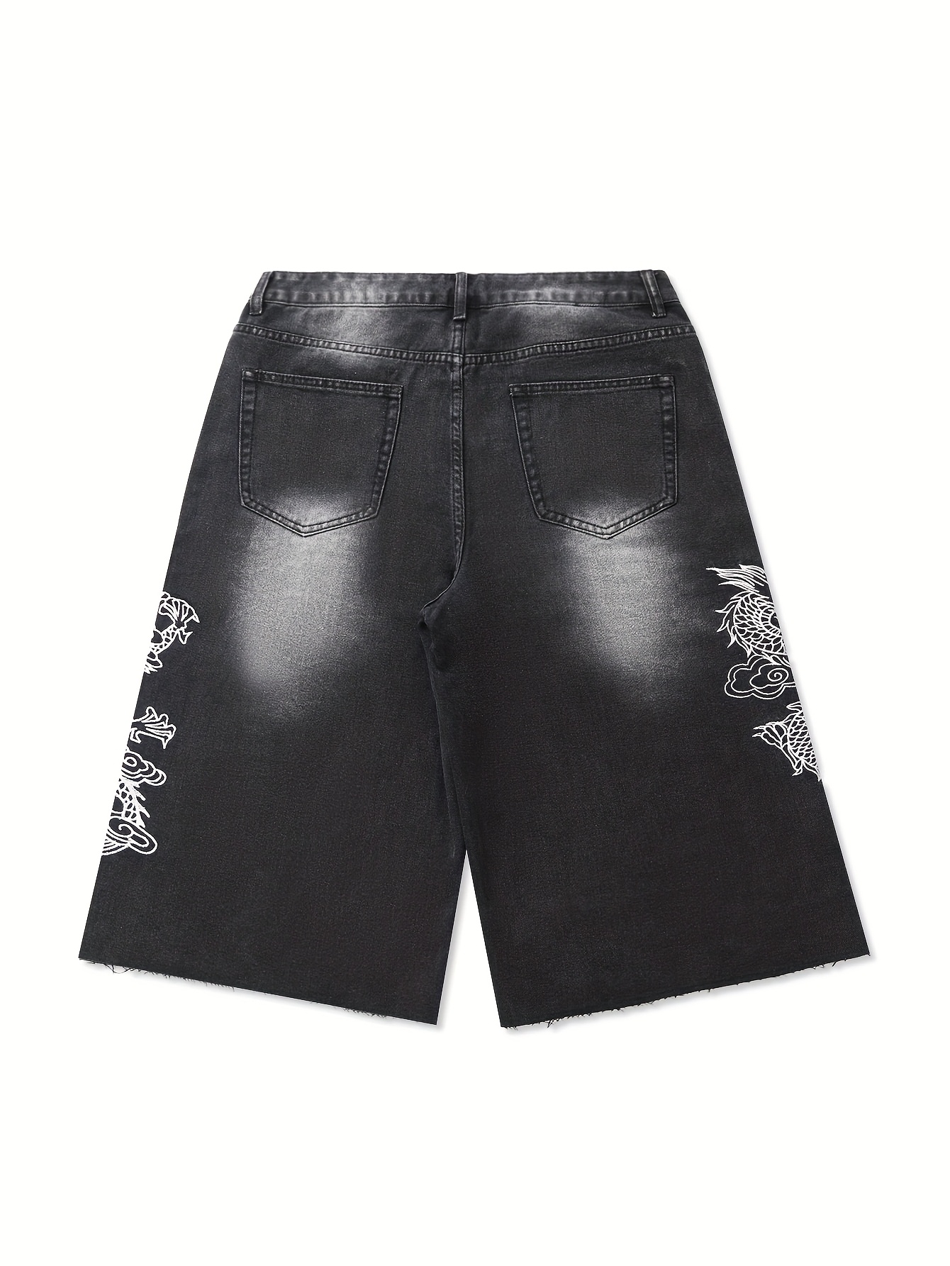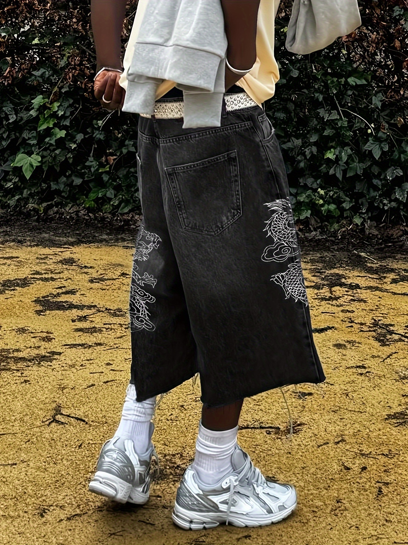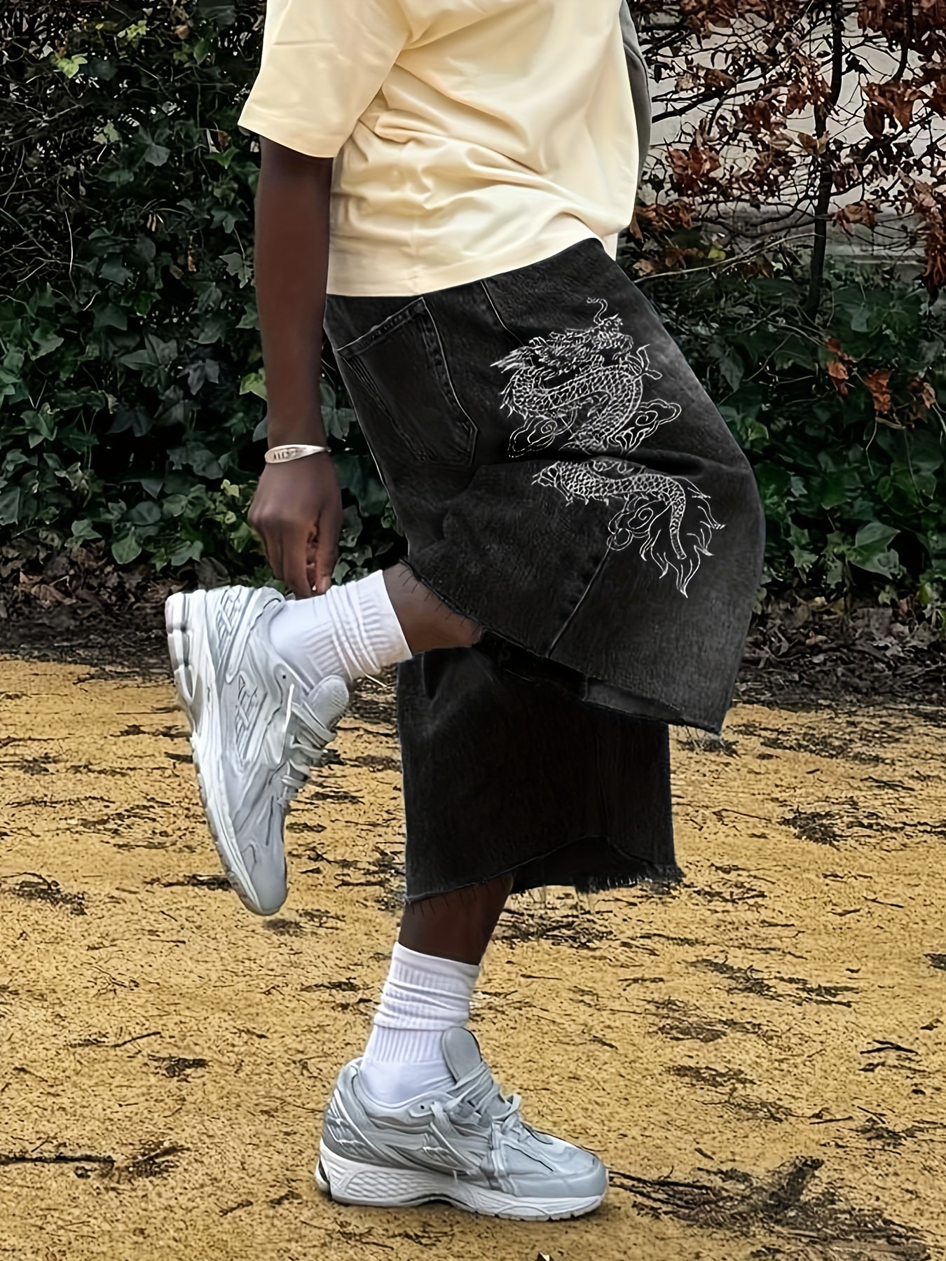Men'S Streetwear Loose Fit Mid-Waist Denim Shorts with Dragon Embroidery, Knee-Length Casual Pants, Non-Stretch Fabric, White Socks & Sneakers, Everyday Denim Shorts | Streetwear Style | Nonstretch Denim