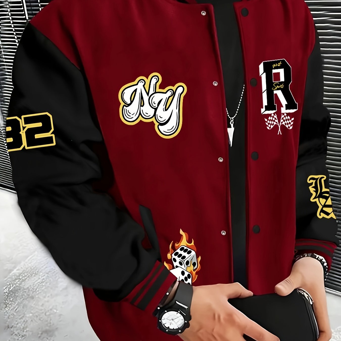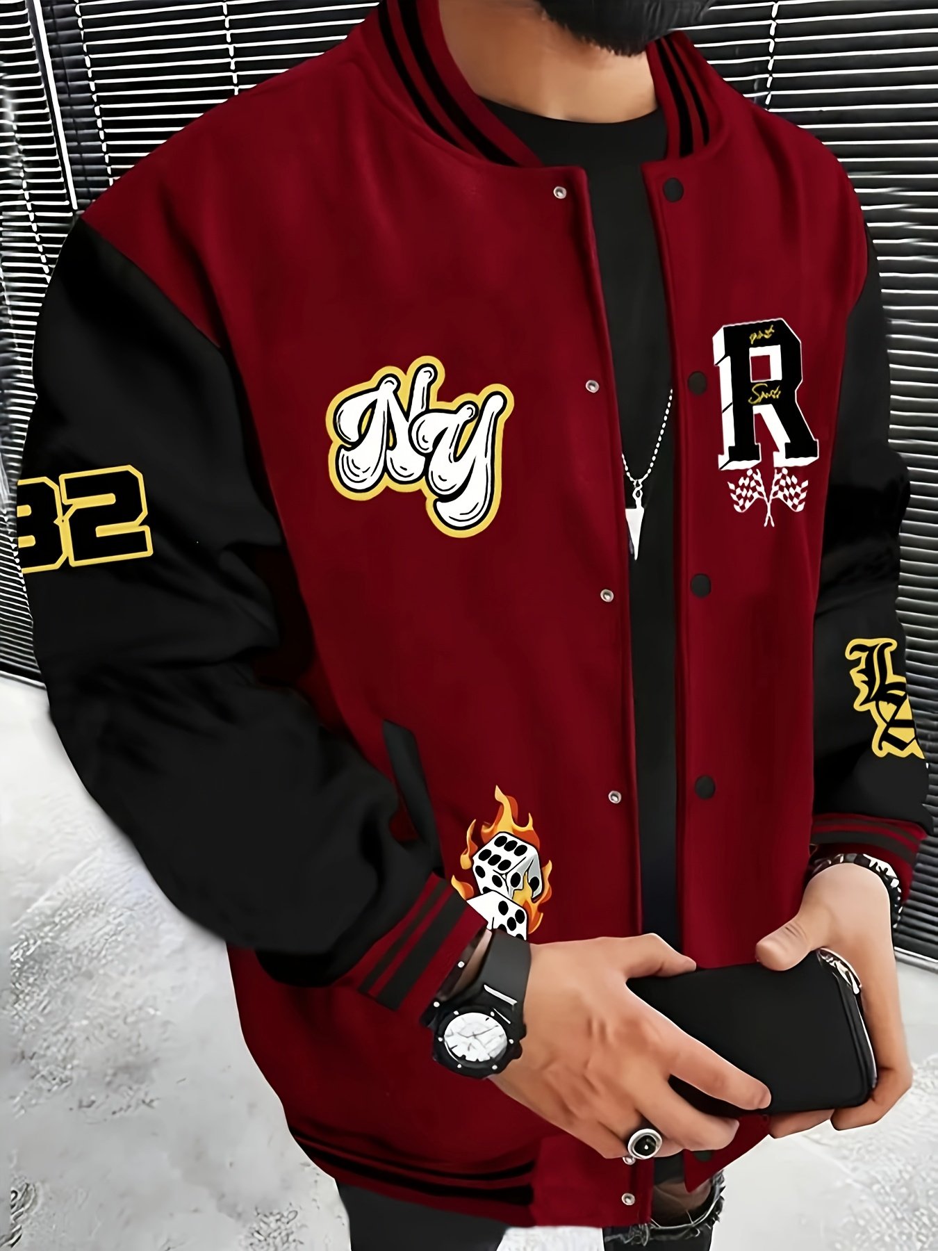 Be the first to review “Men's Stylish Varsity Baseball Jacket – "e;NY"e; & "e;R"e; Letter Print, Red & Black Color Scheme, Polyester Fabric, Round Neck, Pockets, Double-Breasted Closure, Regular Fit, Everyday Varsity Style | Sporty Look | Glossy Finish” Cancel reply