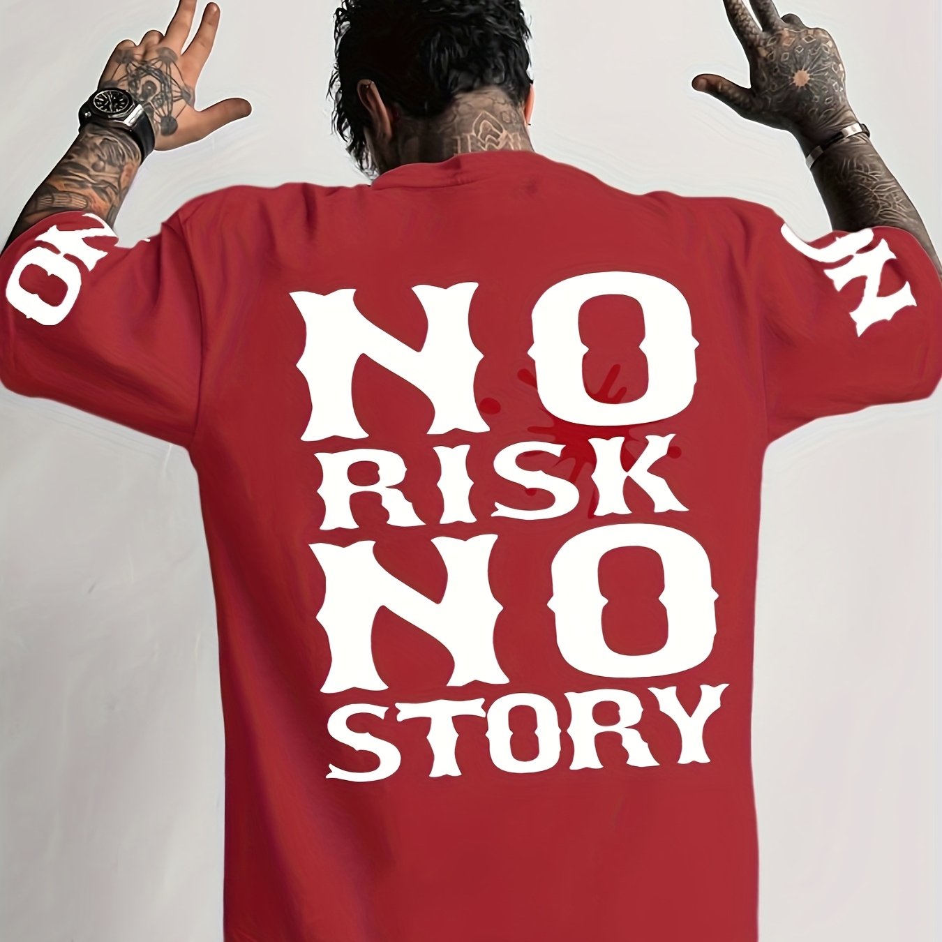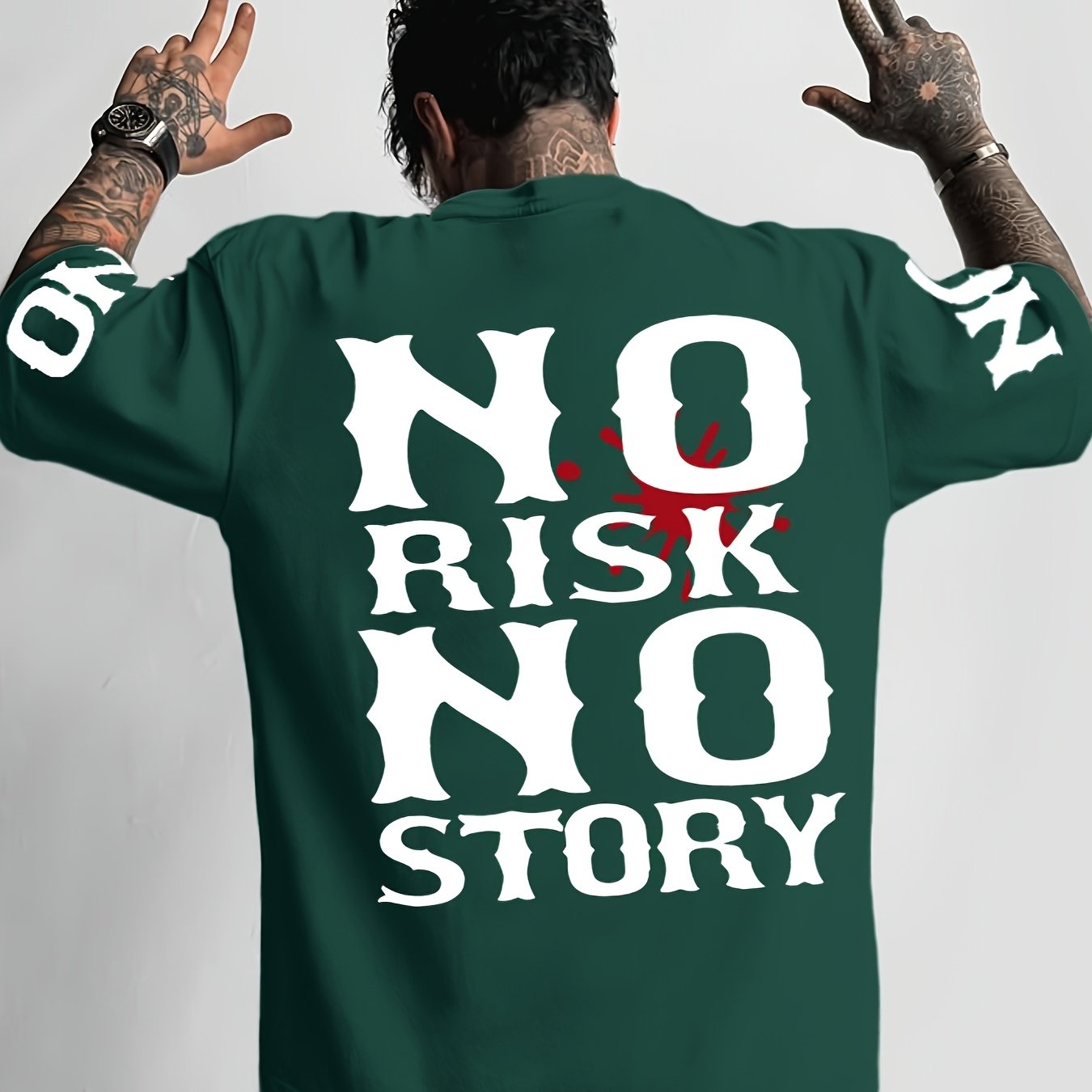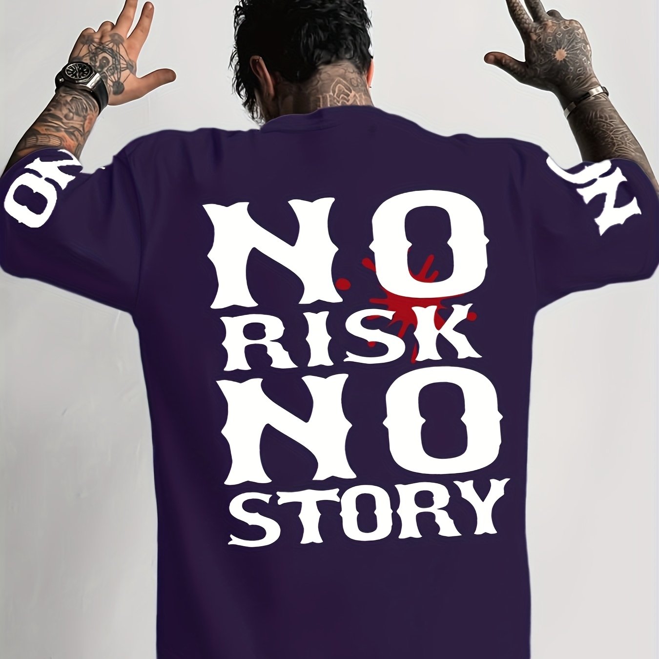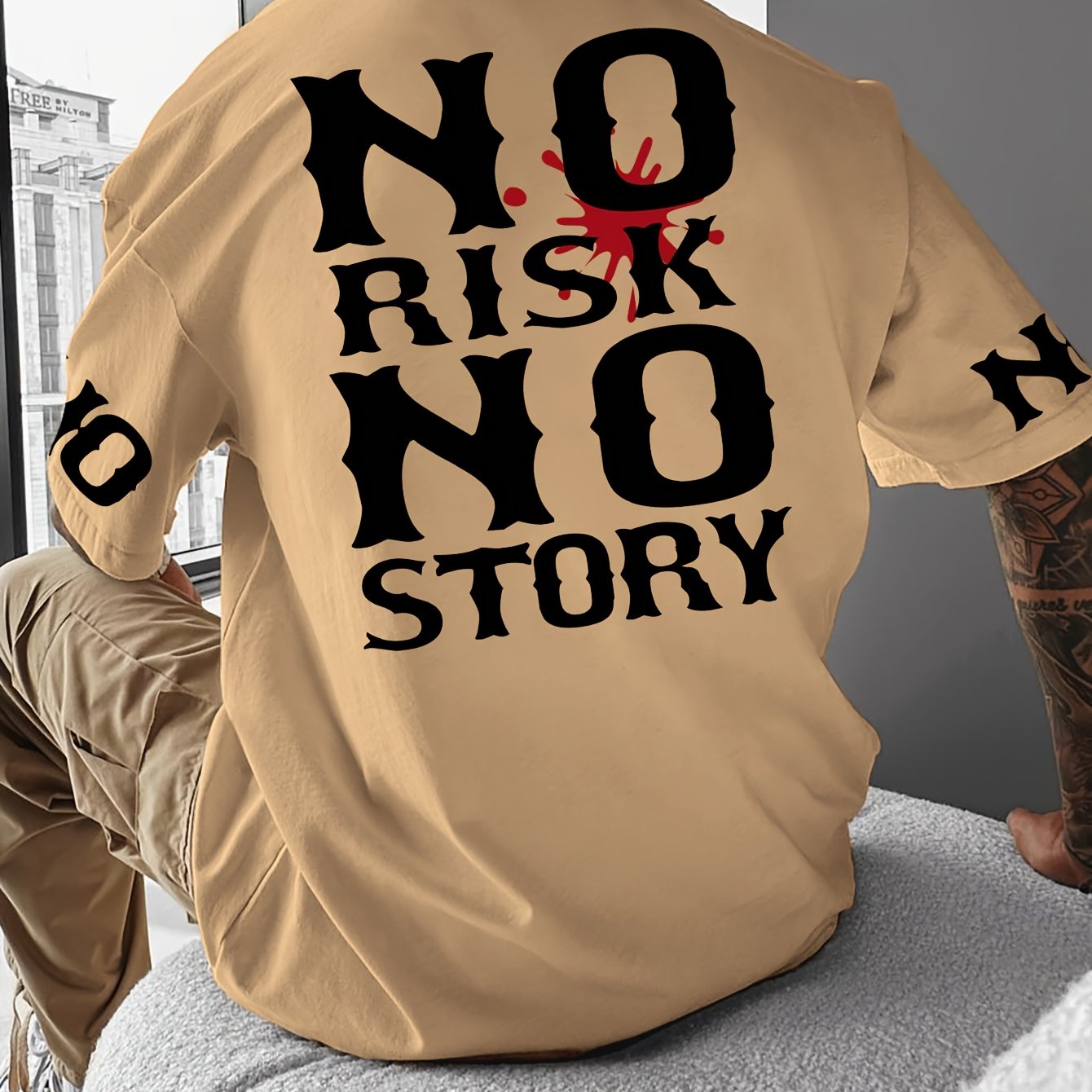 Men's Summer New Fashion Letter Print Loose Round Neck T-Shirt with Inspirational Slogan "e;NO RISK NO STORY"e;, Suitable for Outdoor Sports, Running, Street Casual Wear, and Themed Parties, Soft Polyester Blend, Machine Washable