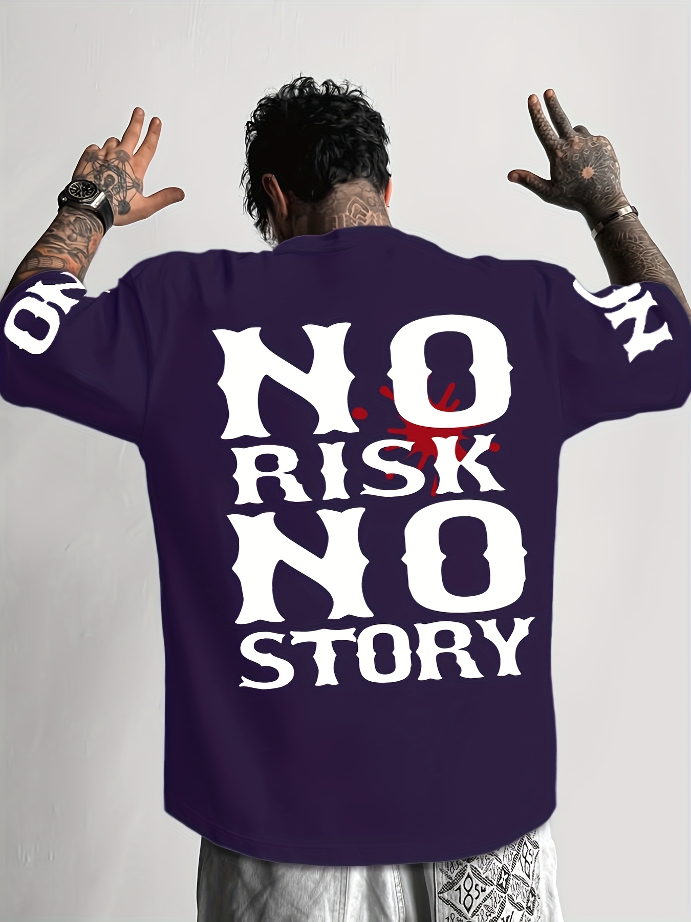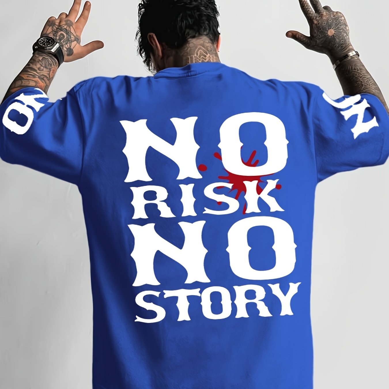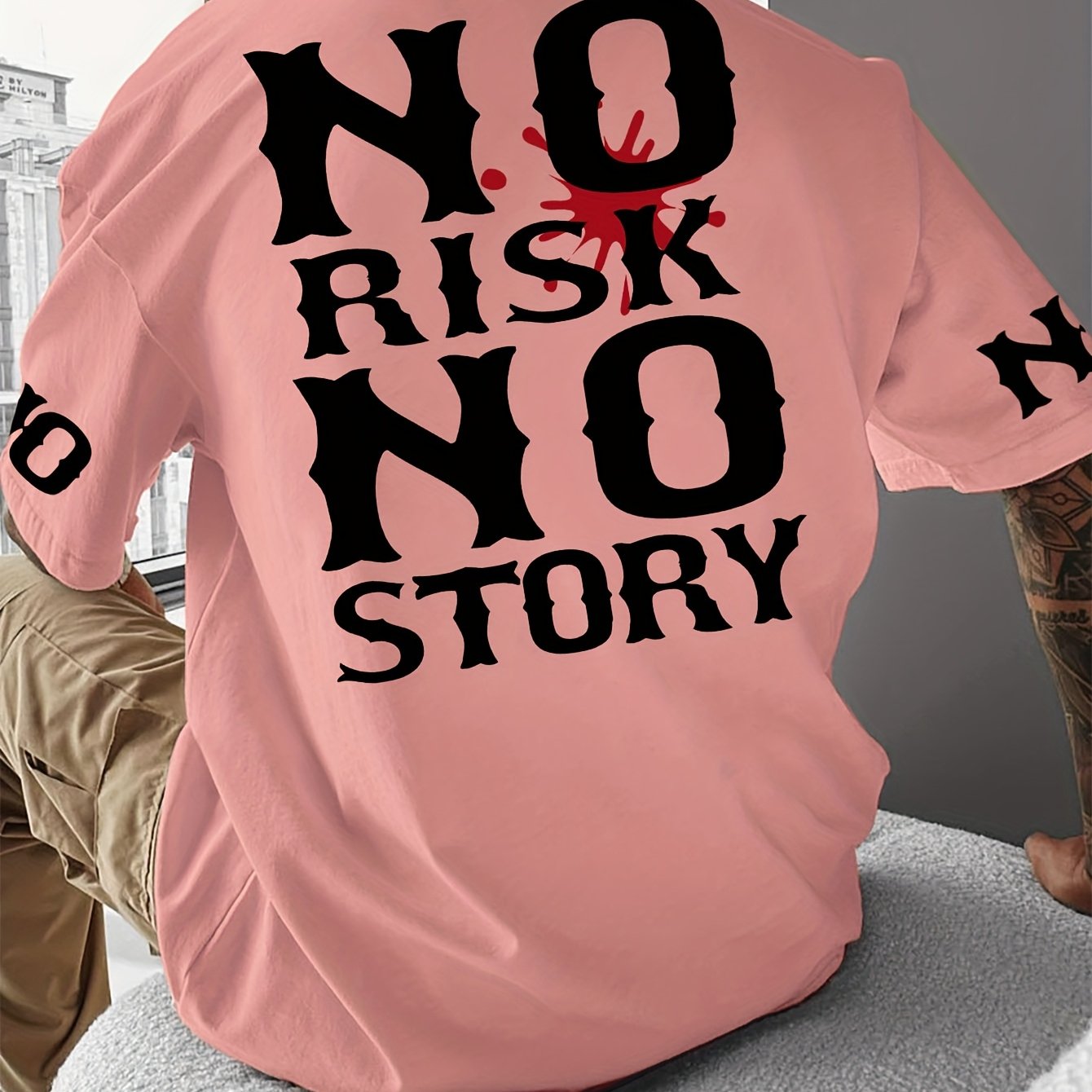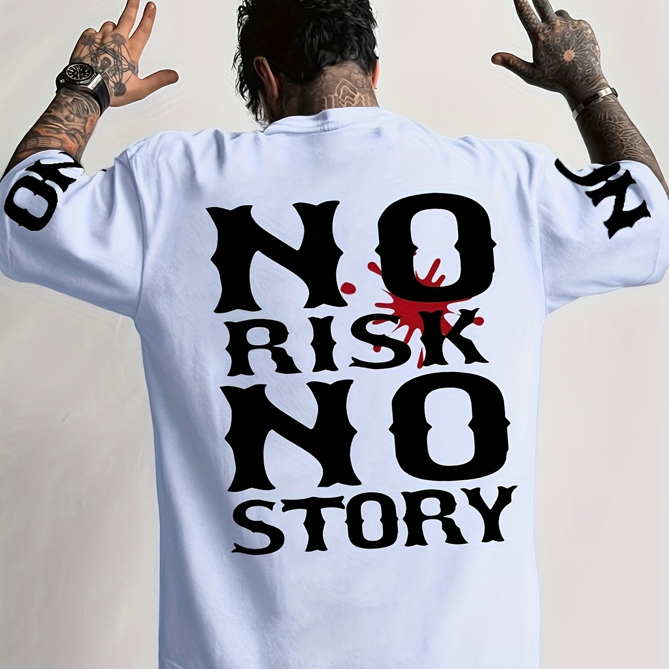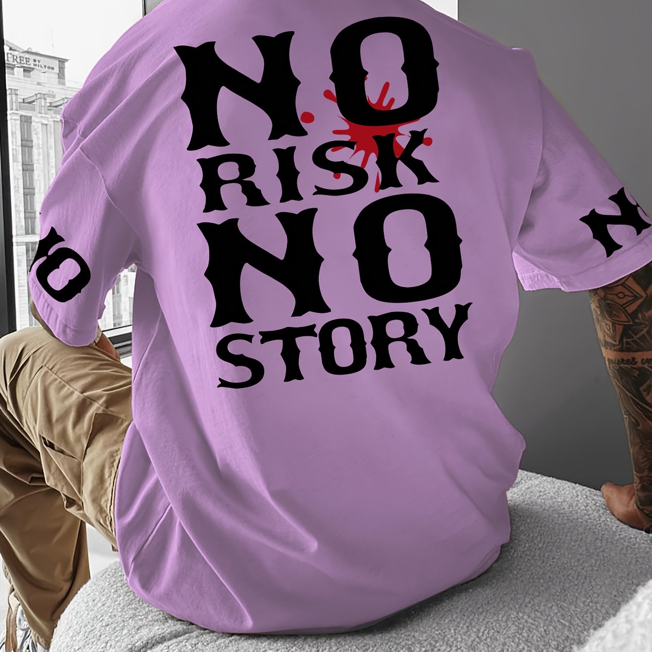 Men's Summer New Fashion Letter Print Loose Round Neck T-Shirt with Inspirational Slogan "e;NO RISK NO STORY"e;, Suitable for Outdoor Sports, Running, Street Casual Wear, and Themed Parties, Soft Polyester Blend, Machine Washable