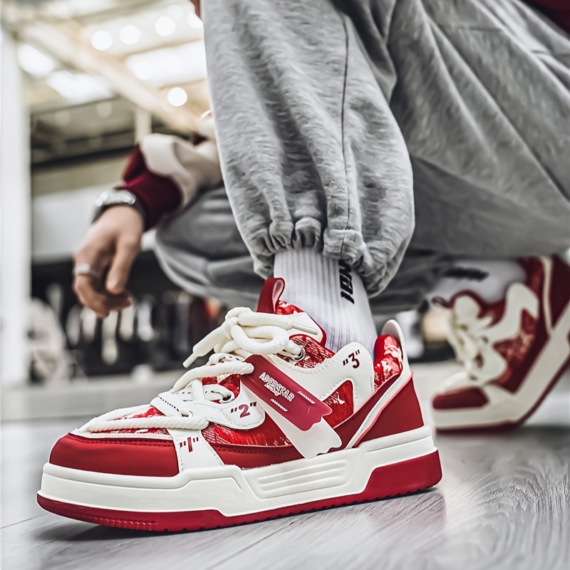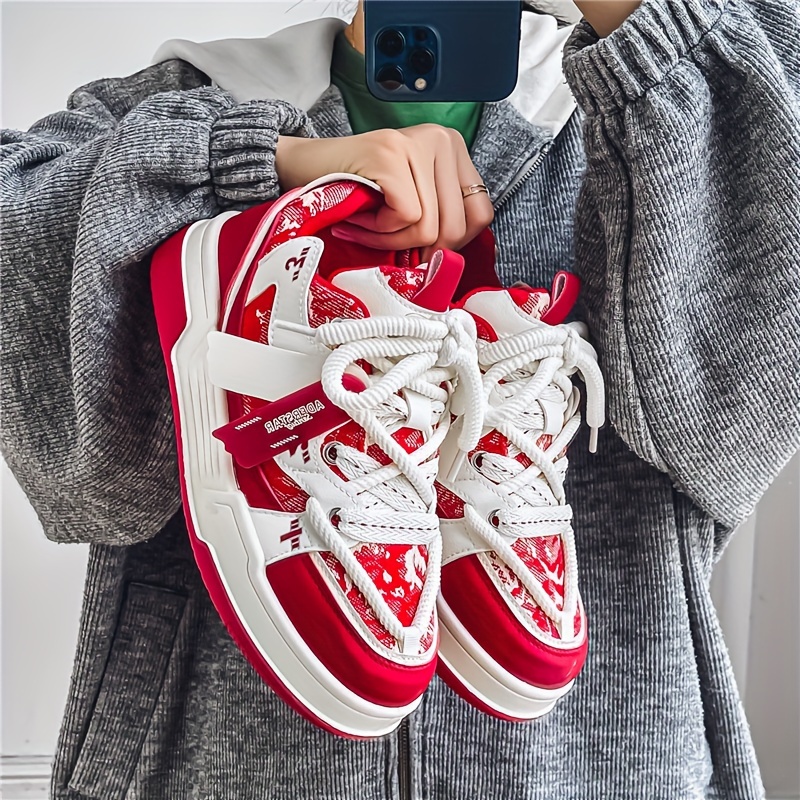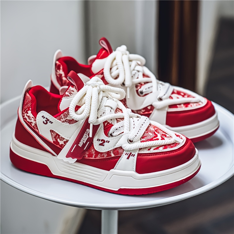 Men's Versatile Street Style Skateboot Shoes – Casual Fashion Sneakers in Red & White with Abstract Pattern, Lace-Up, Low-Top Design, Comfortable Fabric Lining for Daily Wear, Parties & Camping