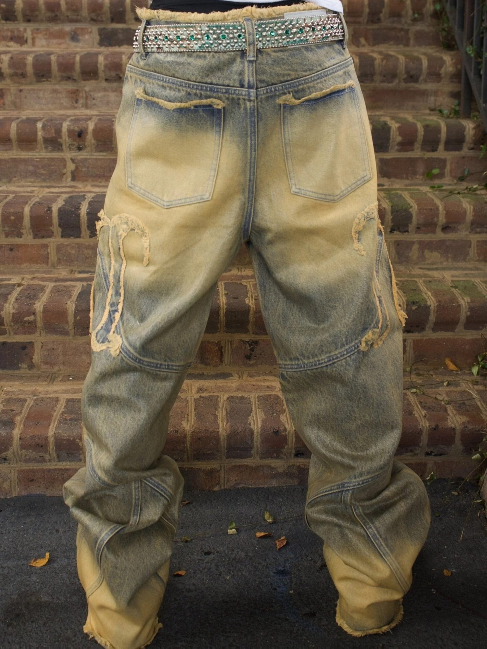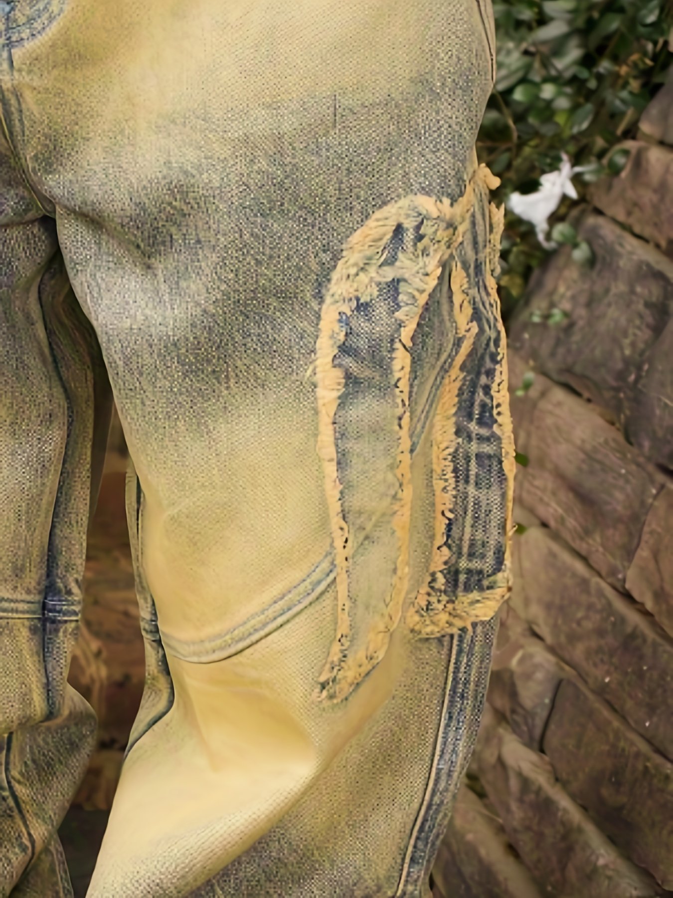 Men'S American Casual Loose-Fit Distressed Faux Denim Faux Denim with Patches – High Street Style, Non-Stretch Fabric, Raw Wash Detail, All-Season Comfort, Streetwear Fashion, Relaxed Fit Faux Denim | Distressed Faux Denim | Nonstretch Fabric, Trousers Fo