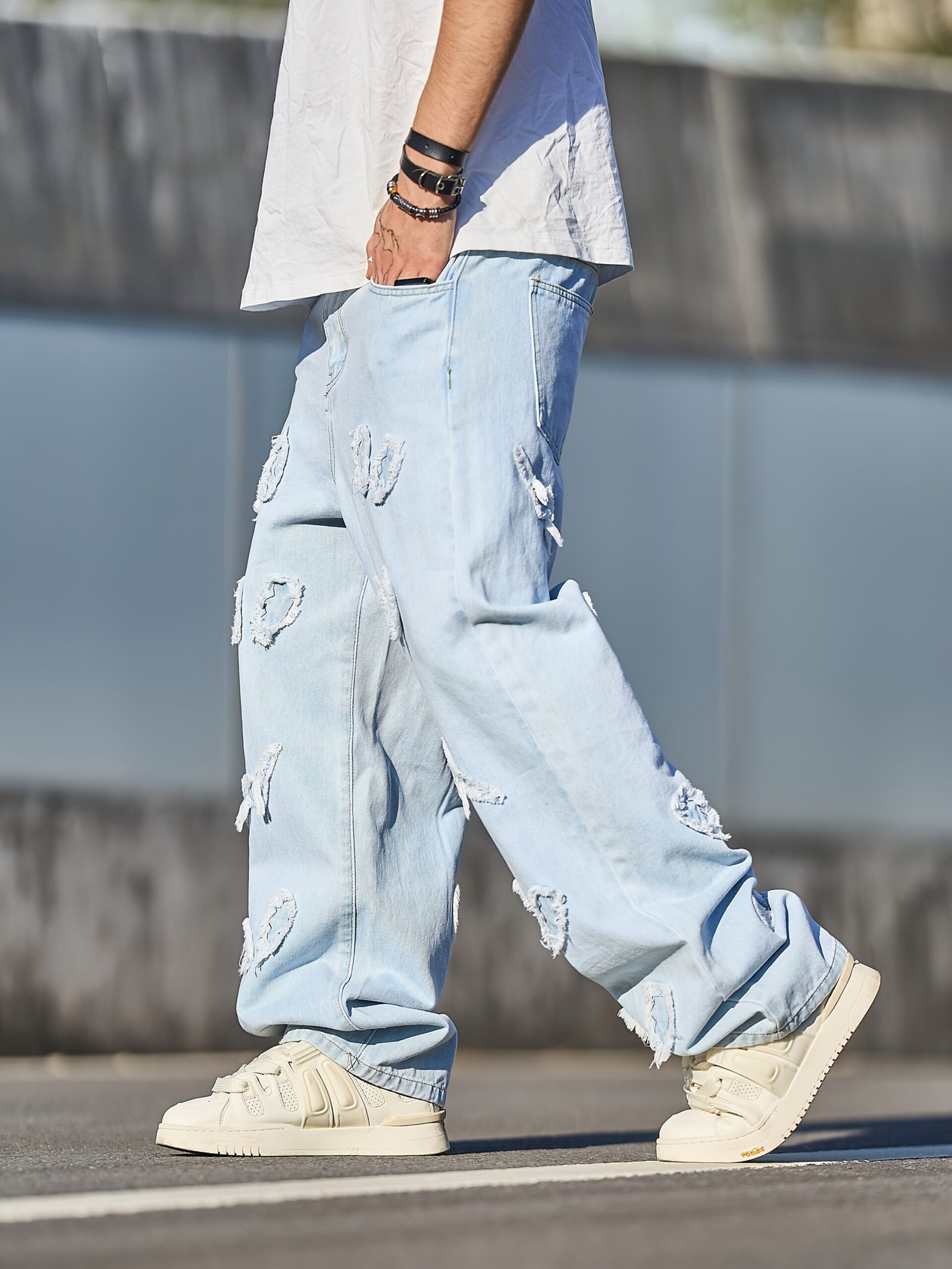 Men'S Vintage-Inspired Distressed Faux Denim Faux Denim with Heart Pattern – Loose Fit, Frayed Hem, Casual Straight-Leg Pants for Spring/Fall, Light Blue, Non-Stretch Fabric, Perfect for Casual Attire, Spring Fall Faux Denim | Vintage Faux Denim Faux Deni